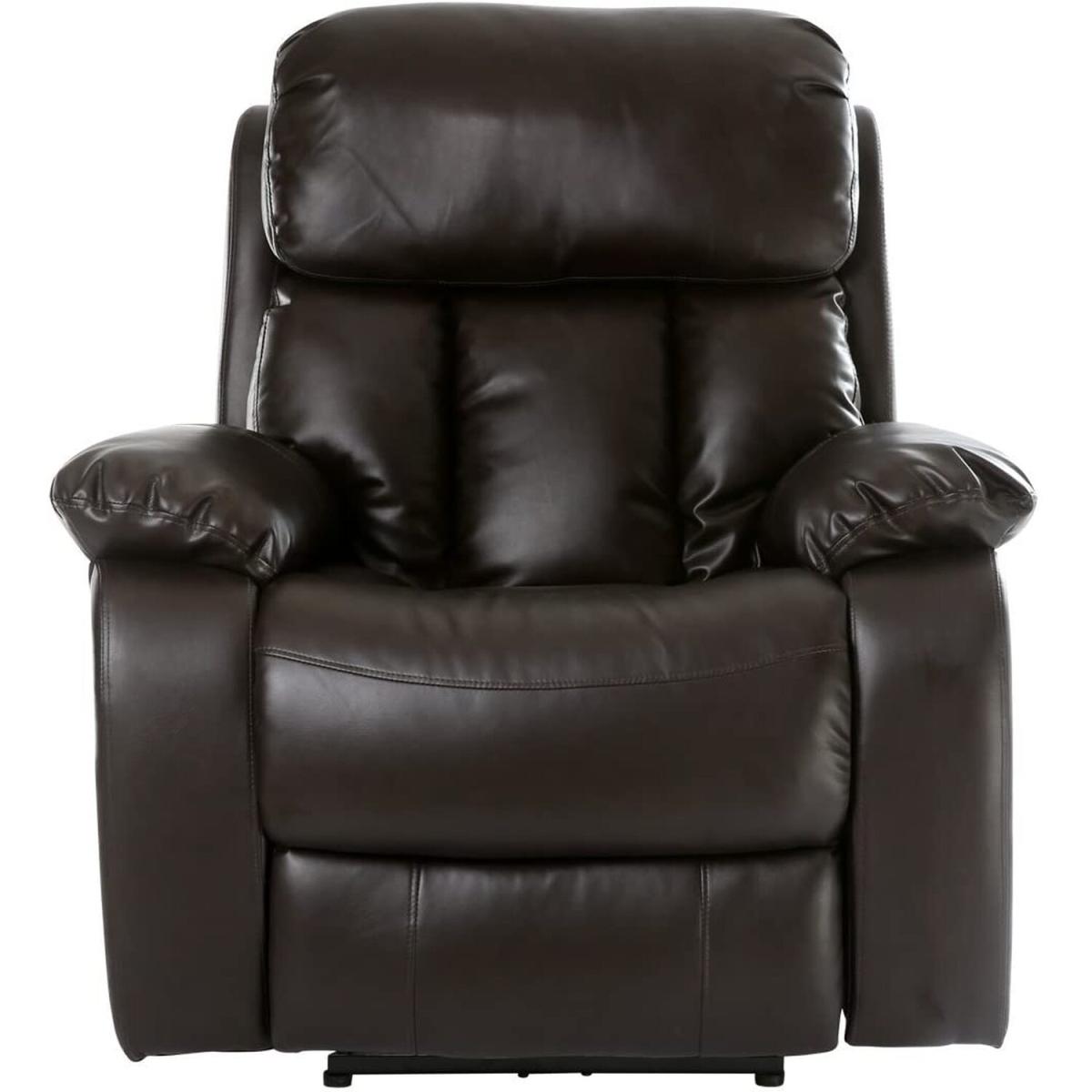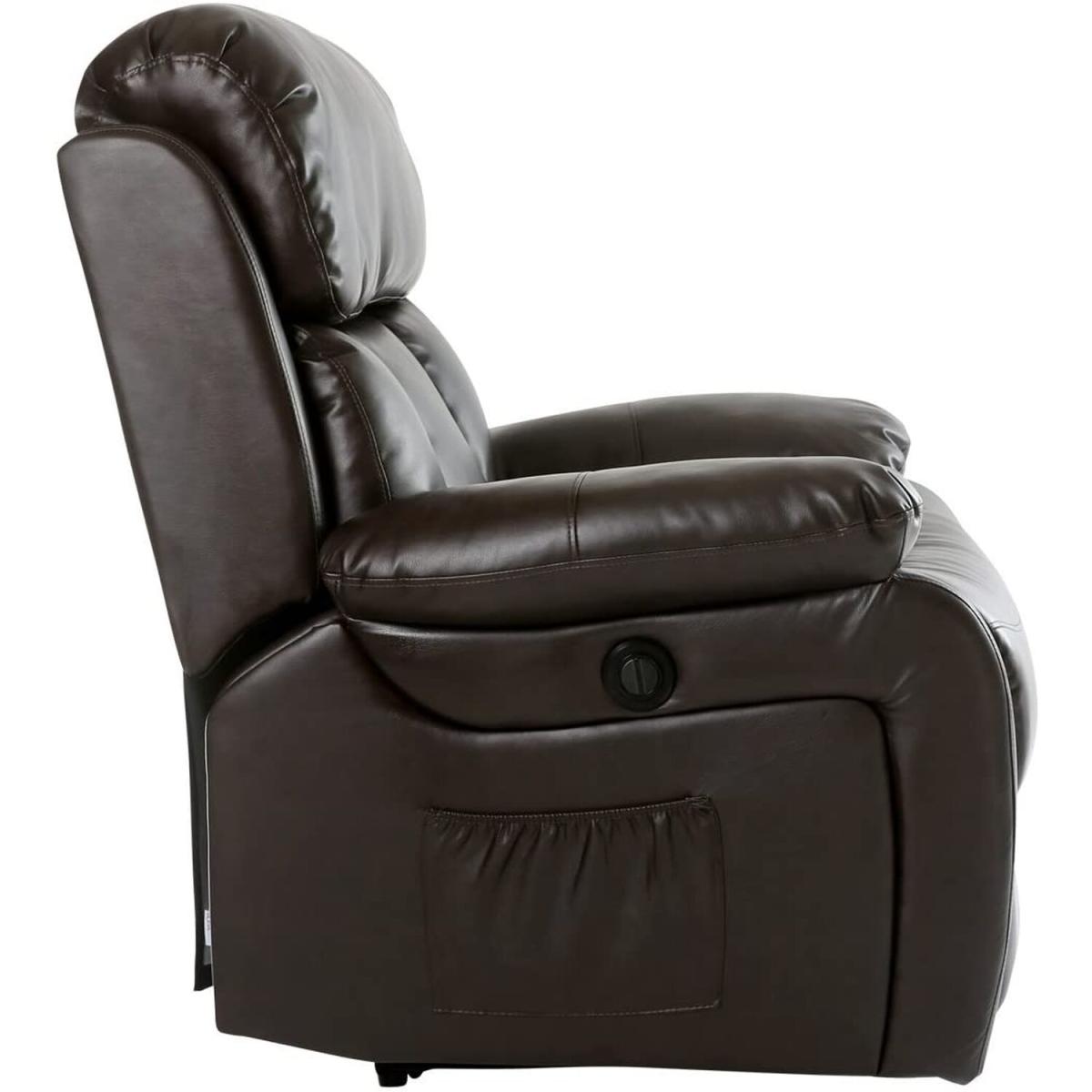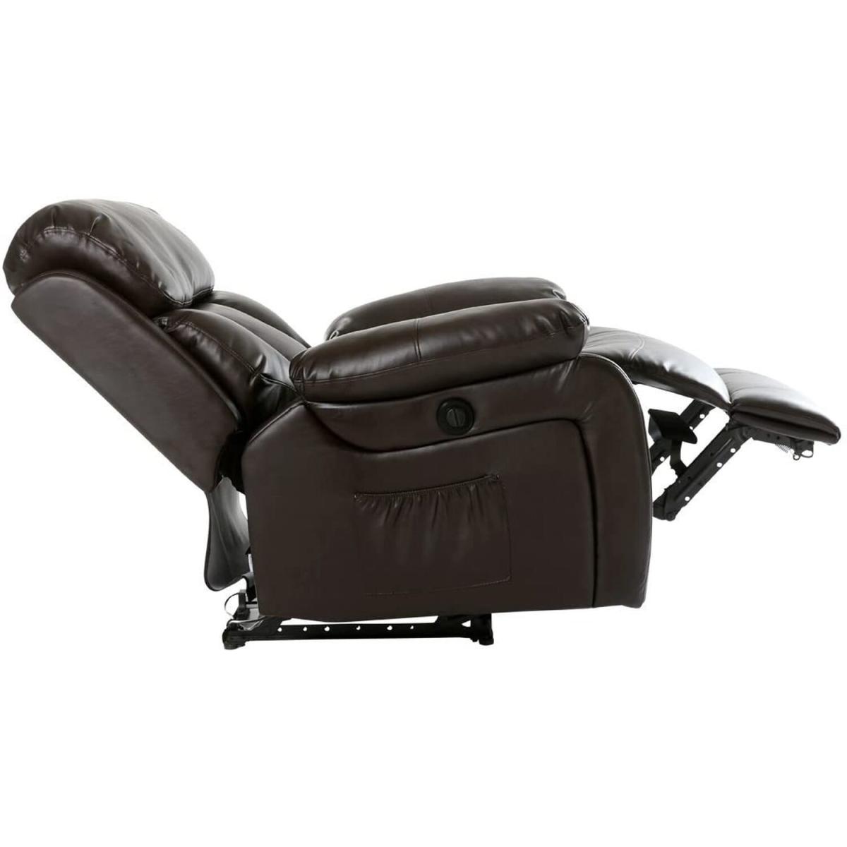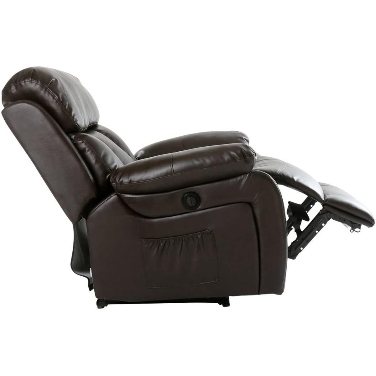 Heated massage chair with built-in footrest Although this very comfortable bonded leather armchair can be used for or watching TV, it is particularly suited to those who need support for their back or find it hard to relax. The soft foam padding in the backrest and headrest offers just the right balance between comfort and support. And the comfortable padded armrests help you choose a position that offers complete relaxation for your arms. The backrest can be reclined to a comfortable position by pressing the buttons below the armrest, the electric motor will then effortlessly reline the chair to the desired position. The footrest is also raised using the same buttons. The attached controller lets you heat the base of the backrest to warm the muscles in your lumbar region. You can also choose to have a soothing massage of your upper and lower back, thighs and calves. This vibration massage is provided by eight built-in pads placed at strategic points in the chair to relieve tired or aching muscles. The controller for the chair can be neatly stored in the side pocket. Available in three colours black, brown and cream. Also Available with a manual latch mechanism for a more cost-effective option, please see our other items.