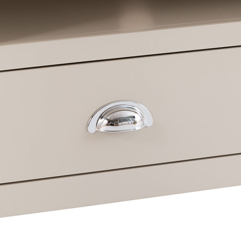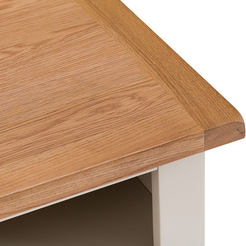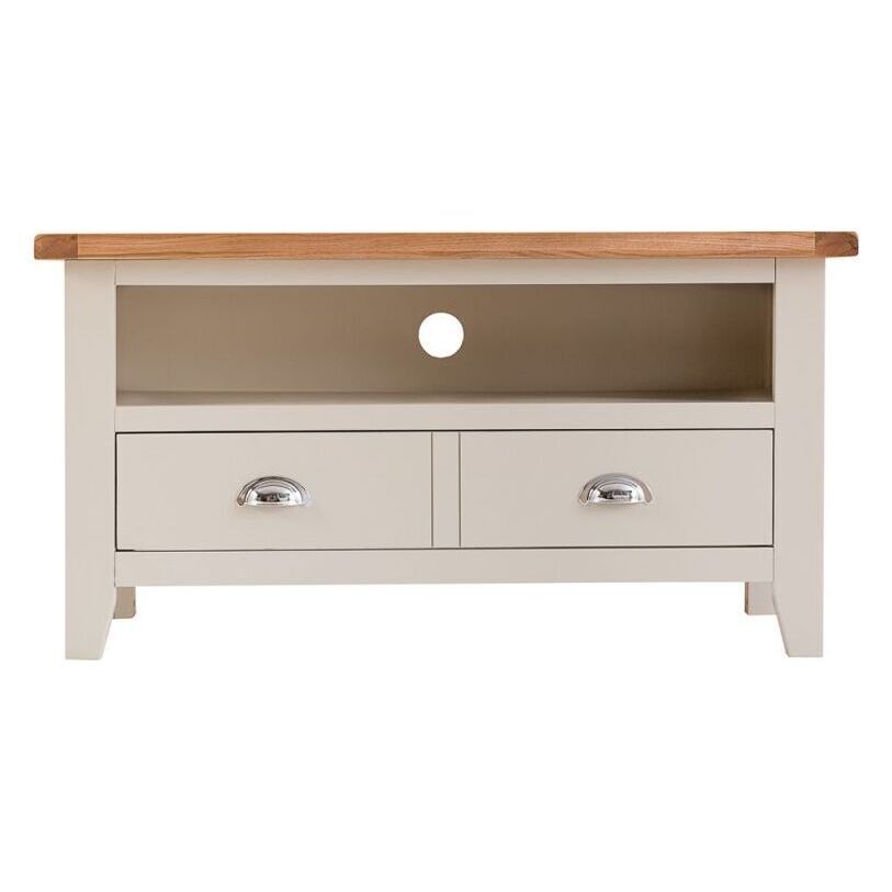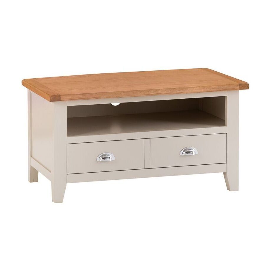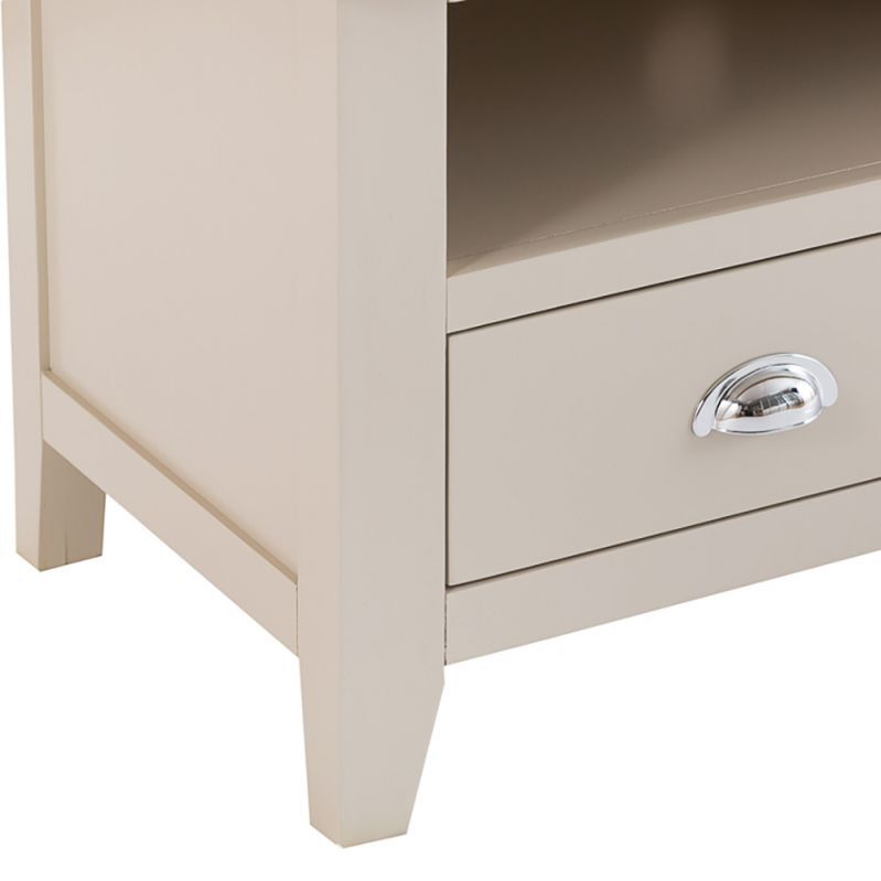 Sometimes small is best and this may well be the case in this instance. The Chester Grey Painted Oak Small TV Unit is a super-stylish TV Cabinet that’s just perfect if space is at a premium (or you’re not competing with your friends to see who can own the biggest TV). This stunning painted TV Stand features open shelving space to host digital TV boxes, games consoles or anything else we’ve missed. The large full-length drawer beneath is dovetailed and is just perfect for keeping remotes and DVD’s away from sight which is always important when little ones are around. Or perhaps it’s your husband you’re trying to keep away from the remote! Last but not least, the oak top provides a wonderful contrast against the crisp stone grey painted finish and rounded chrome handle. There are also other TV Units within the Chester Grey Collection if you’re seeking a larger or corner alternative. Please note, the manufacturer refers to the colour of this range as Truffle. As such, the word 'Truffle' is displayed on the packaging. The images on-site were taken in our photography studio and are an extremely accurate reflection of colour.