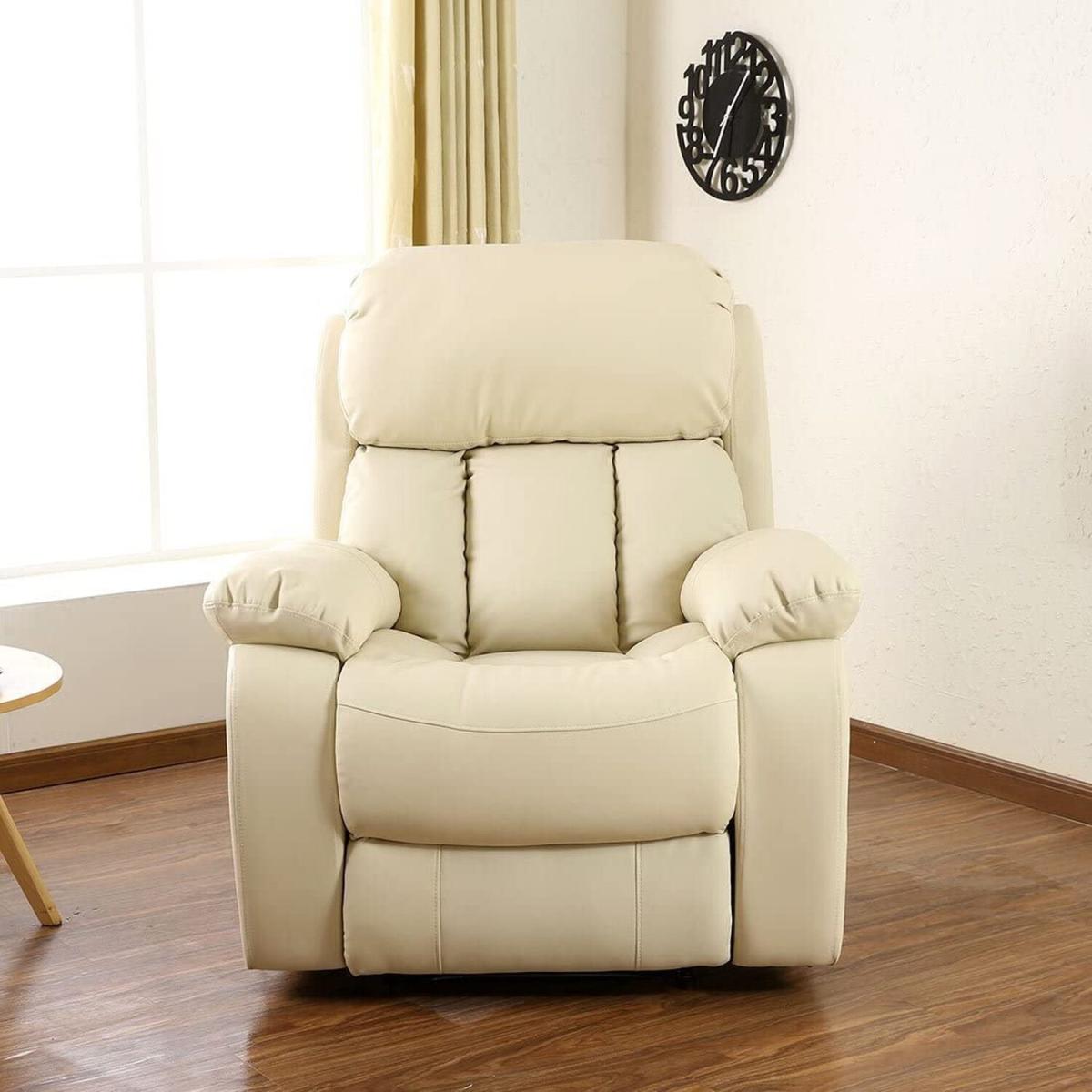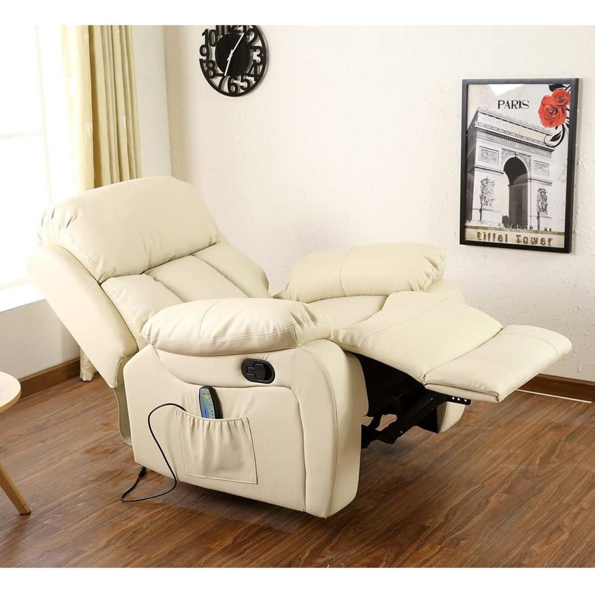 Heated massage chair with manual recline and built in footrest Although this very comfortable bonded leather armchair can be used for gaming or watching TV, it is particularly suited to those who need support for their back or find it hard to relax. The soft foam padding in the backrest and headrest offers just the right balance between comfort and support. And the comfortable padded armrests help you choose a position that offers complete relaxation for your arms. The backrest can be reclined to a comfortable position by releasing the latch below the armrest. The footrest is also raised using the sturdy latch mechanism. The attached controller lets you heat the base of the backrest to warm the muscles in your lumbar region. You can also choose to have a soothing massage of your upper and lower back, thighs and calves. This vibration massage is provided by eight inbuilt pads that are placed at strategic points in the chair to offer relief to tired or aching muscles. The controller for the chair can be neatly stored in the side pocket. Available in three colours black, brown and cream. Also Available with Automatic power recline, please see our other items.