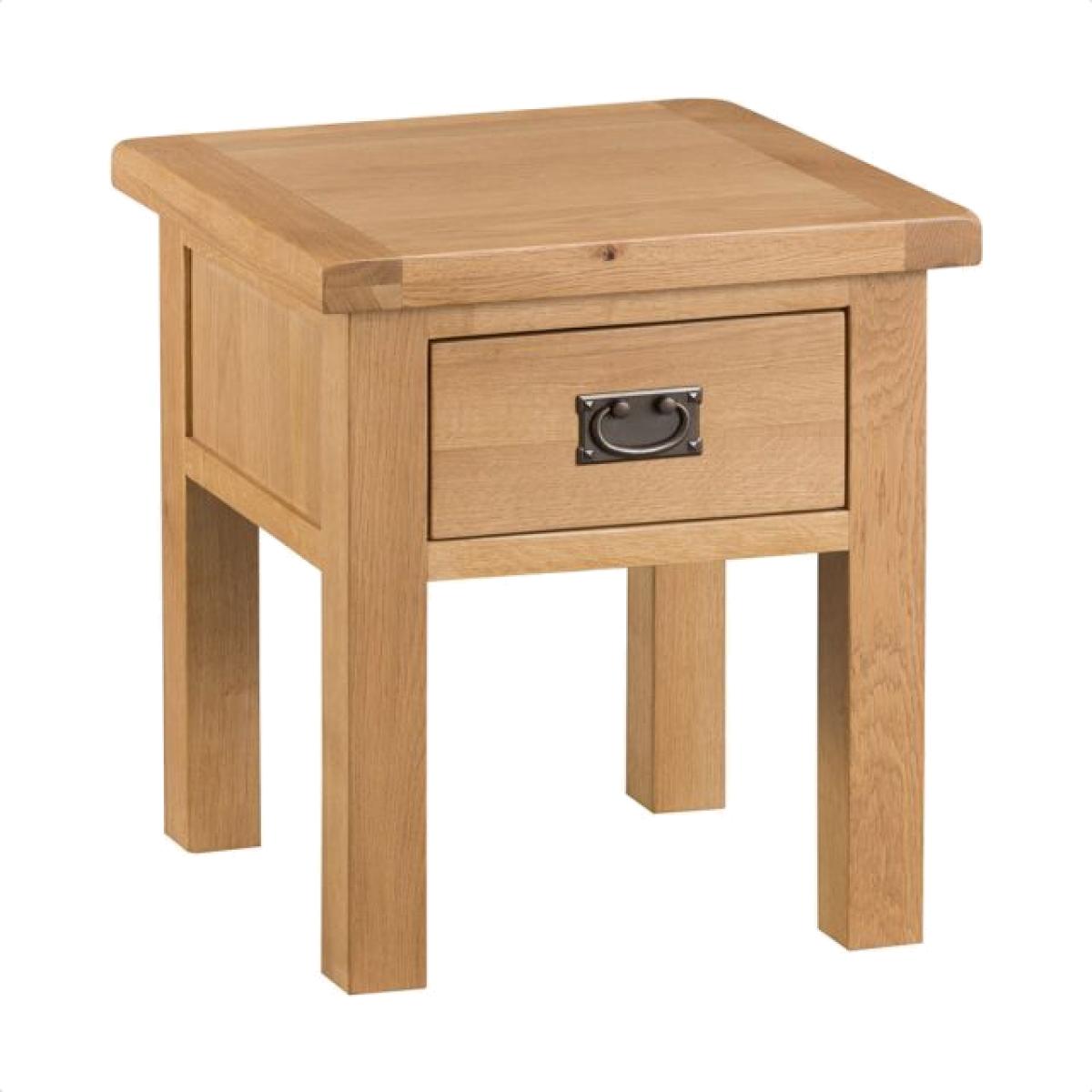Crafted from oak in a natural finish with a stylish antique brass handle on the drawer, this solid oak lamp table comes complete with a handy drawer for storing remote controls, drink coasters, newspapers, books or magazines until you need them, leaving your living room looking neat and tidy and most importantly, clutter free! Solid oak frame Oak veneer finish Natural lacquered finish Assembly required Dimensions: 50cm x 50cm x 55cm  All screens vary in colour reproduction and whilst every effort has been made to display the colour as accurately as possible it is for guidance only.
