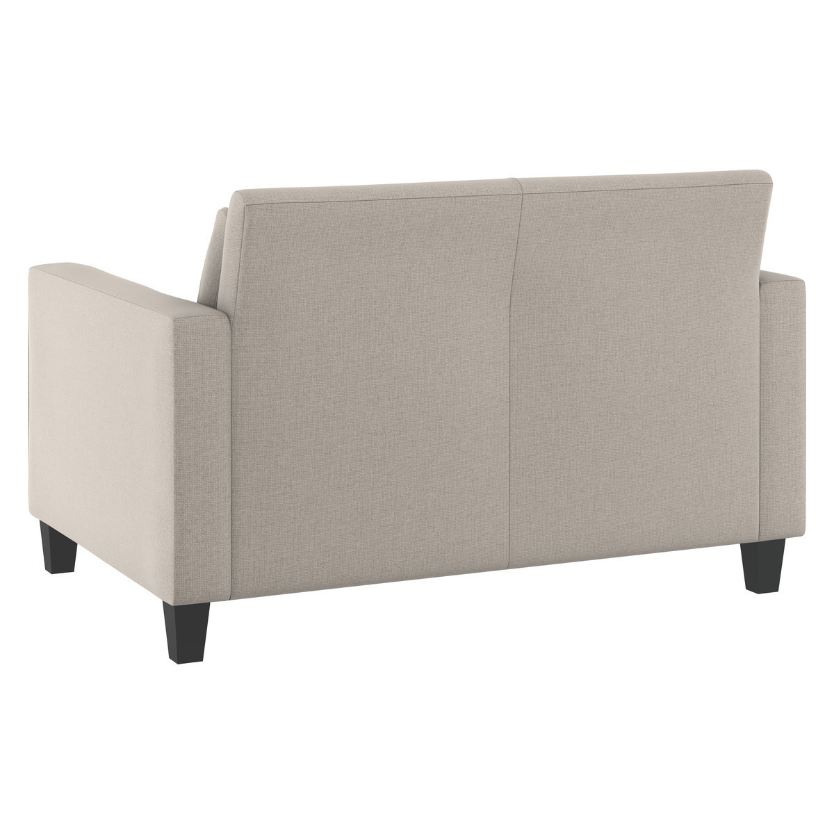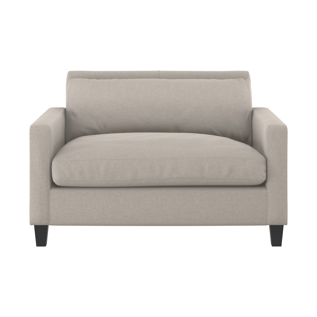 I love this compact sofa for its versatile neutral tone and textured fabric, which makes it easy to incorporate into a range of interiors. It works particularly well in contemporary and minimalist spaces, or even in more cosy, eclectic settings, where its understated elegance can be highlighted by layered cushions or throws. Practical styling tips include pairing it with darker-toned or wooden coffee tables to accentuate the dark stained feet, and adding colourful cushions to bring personality without overwhelming the clean lines. Its size makes it perfect for smaller living rooms or as additional seating, ensuring a balanced and inviting space without sacrificing style.