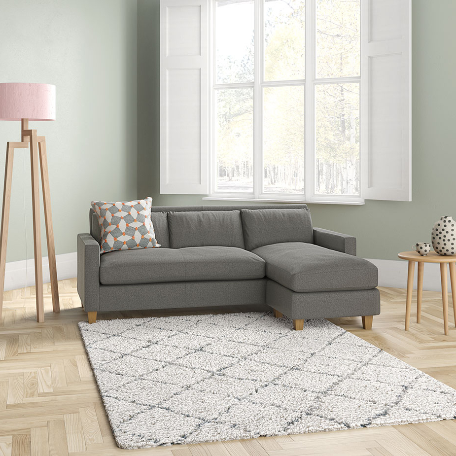 I love this corner sofa’s classic navy hue and textured herringbone weave, which adds visual interest without overwhelming a space. It’s a versatile piece that works well in both traditional or modern interiors, especially those with a relaxed, understated aesthetic. Styling tips include pairing it with neutral or patterned cushions to soften the look, or adding tactile accessories like soft throws for cosy evenings. Since it’s a sizeable piece, it’s ideal for open-plan living areas or larger lounges, providing ample seating while remaining contemporary and inviting. The wool mix fabric also offers durability, making it a practical choice for households that frequent the sofa regularly.
