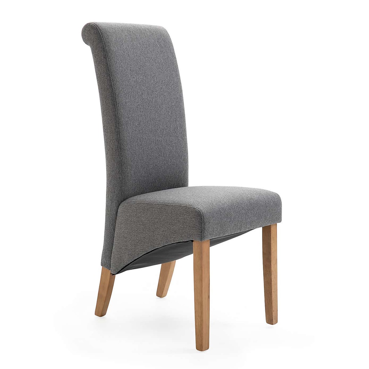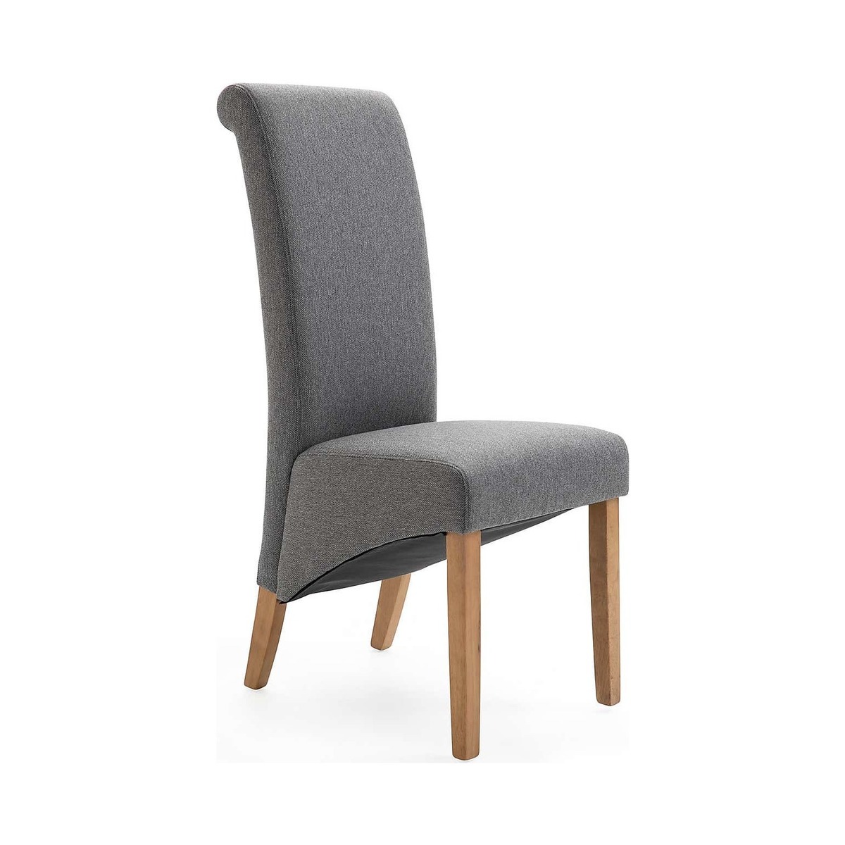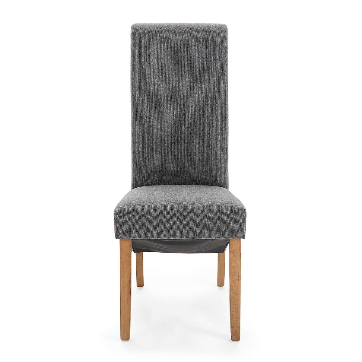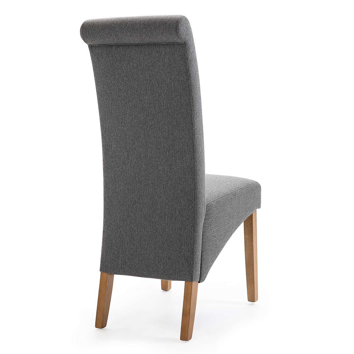 Dunelm Exclusive - Designed and Developed by Dunelm A traditional silhouette, the Chester set of two dining chairs are upholstered in a contemporary herringbone fabric and feature scrolled back detailing, a deep skirt and tapered solid wood legs in an oak finish. Easily assembled, the foam filled, webbed and sprung seats provide luxurious comfort while the high back offers plenty of support. Other colours and fabric styles are also available. dunelm. com/search? q=Chester+Dining+Chairs)