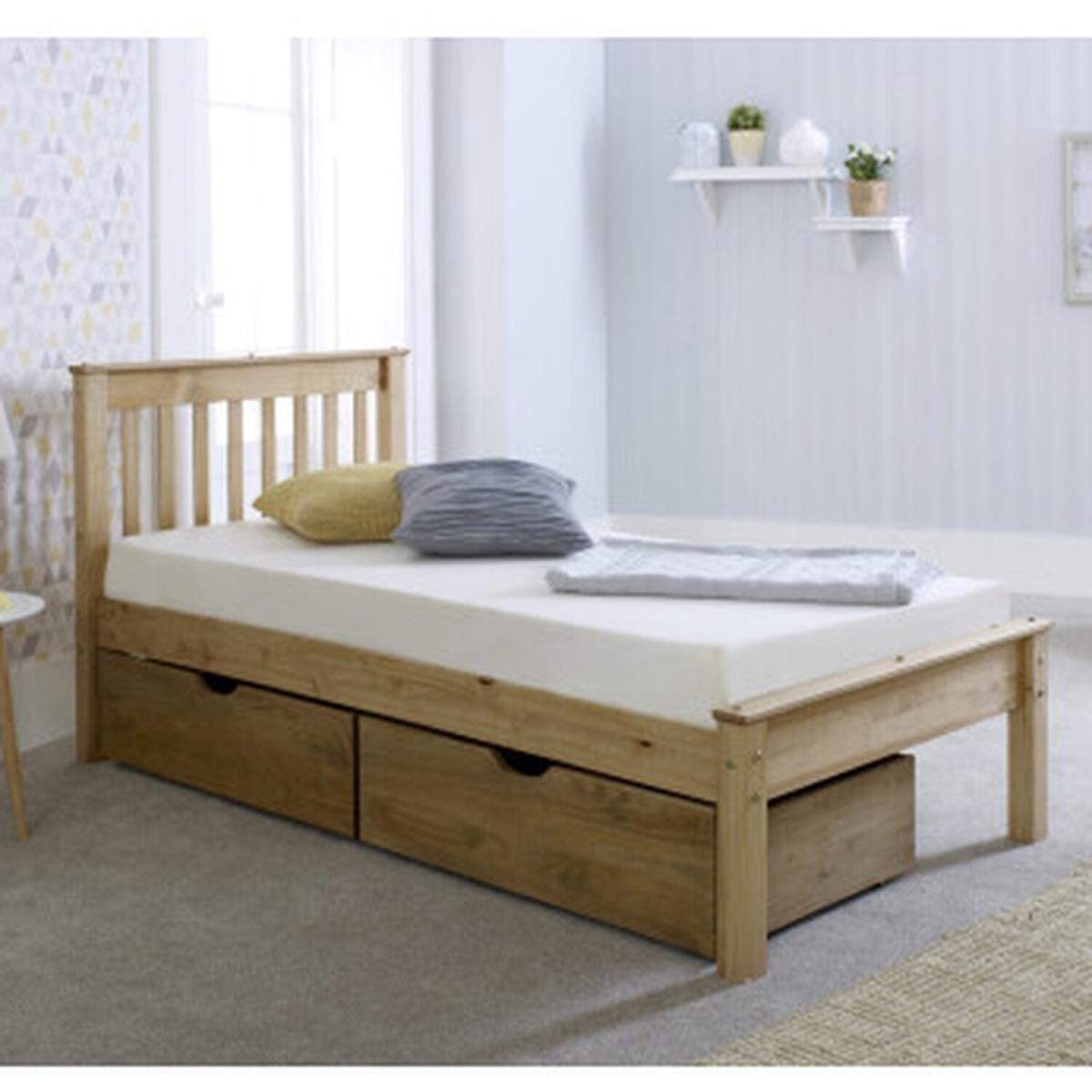 Its excellent design will effortlessly complement any interior. Made from high-quality pine with a protective wax finish. It features a wooden slatted headboard and plenty of space underneath the bed for storage. A solid pine construction and a solid slatted base. This high-quality bed with thick bed slats and an extra middle leg (not included for a 3FT bed) ensure the bed's stability, safety, firmness and durability. The slatted base promotes greater air circulation and helps to prolong mattress life. The light pine colour will flow effortlessly with any interior and its low foot-end helps to create the illusion of more space in any room it is placed in. Along with the minimalist design and storage space under the bed, it's a great choice for smaller bedrooms.