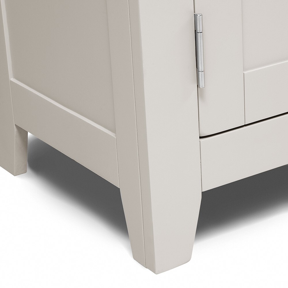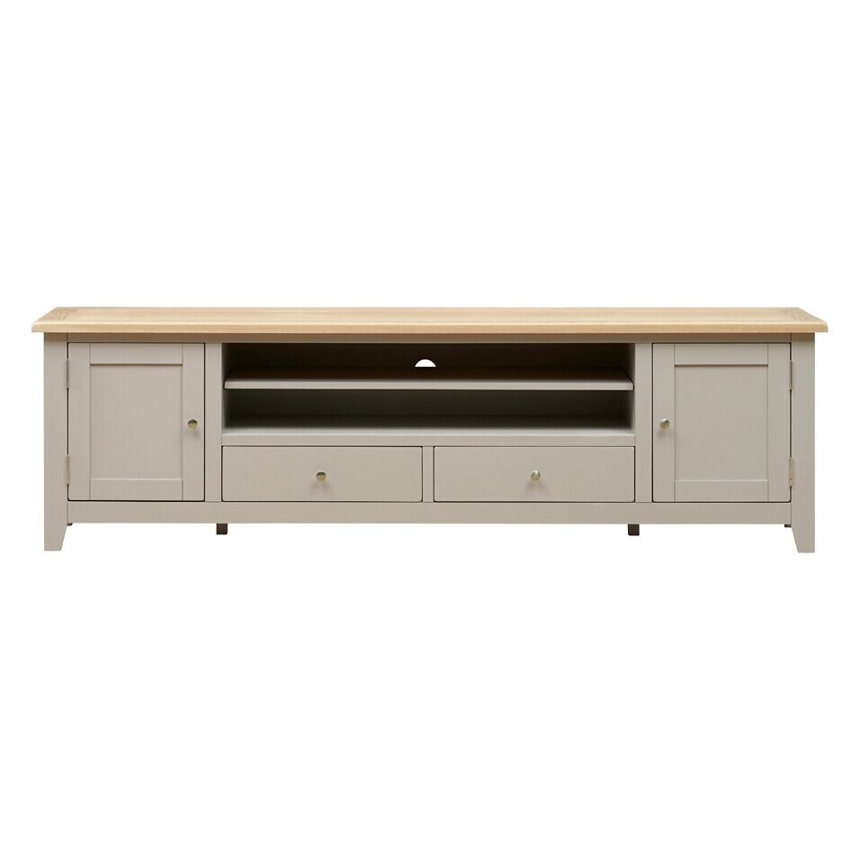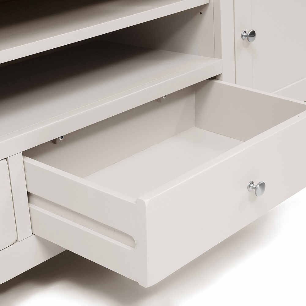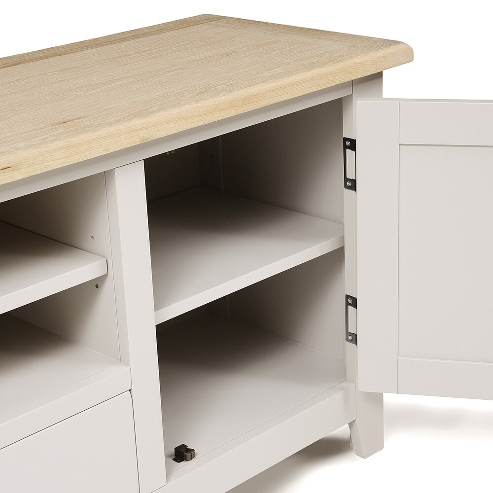 With an expansive white wash oak and oak veneer top this charming TV stand is the perfect centrepiece in any living space. With its soft stone paint it will work in any existing decor style while still offering a fresh and modern update to a room. Flanked on either side with two shelved cupboards it has ample room for DVD, CD or game storage, while the two drawers offer a handy space for spare cables, remotes or wires. Finally the open shelved section is large enough to hold a multitude of media devices or a Sound Bar for those that like to bring the cinema home with them.