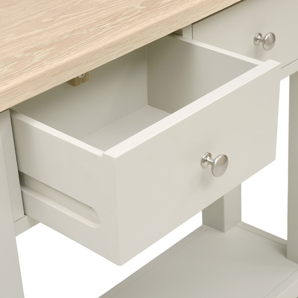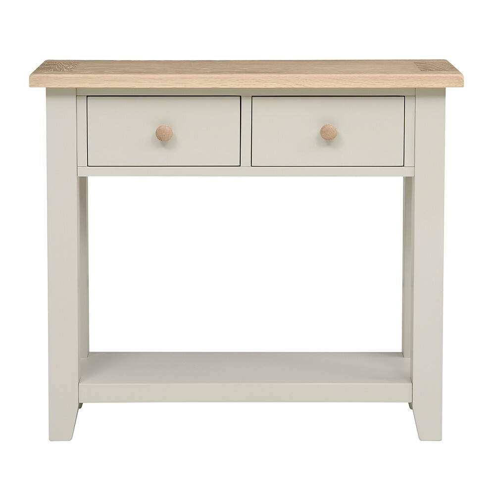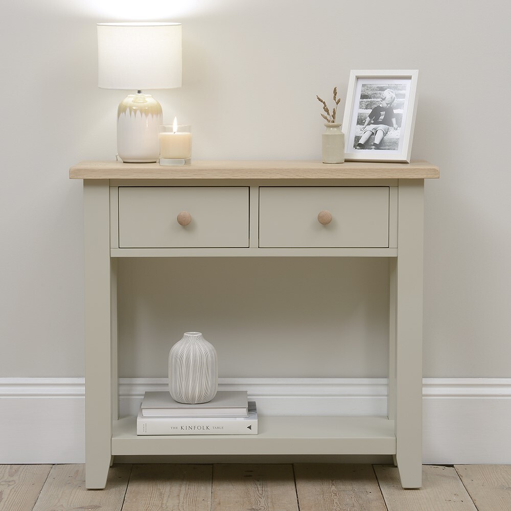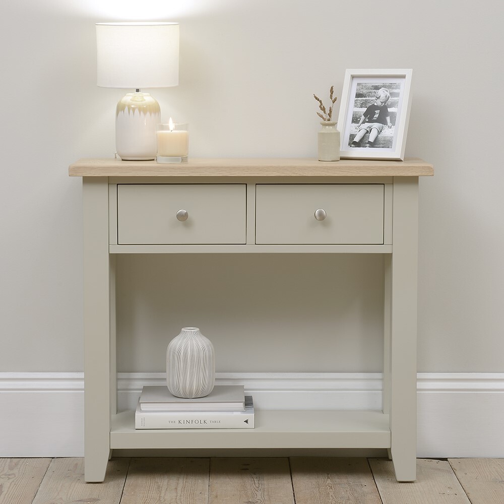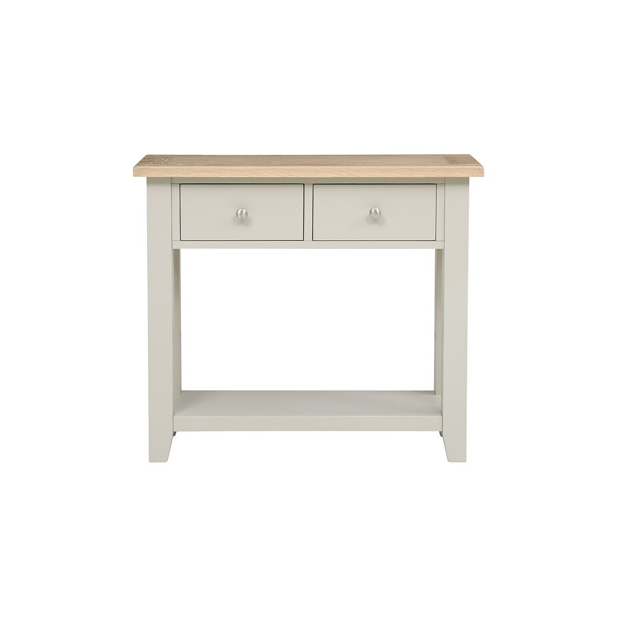 We could all do with somewhere to keep all that leaving-the-house-stuff we always end up rushing around trying to find in the morning. A console table is the answer. And not only will it help you stay organised and save time - this one from our ever-so-smart Chester Stone range will be a handsome addition to your hallway too. The sturdy top has been waxed and lacquered to bring out its characterful grain and contrasts beautifully with the stone paint finish on the frame and handy lower shelf. The two drawers will keep all your morning essentials easy to find and you get both smart polished handles and painted wooden handles, so its final appearance is up to you.