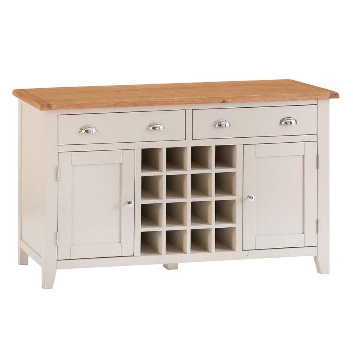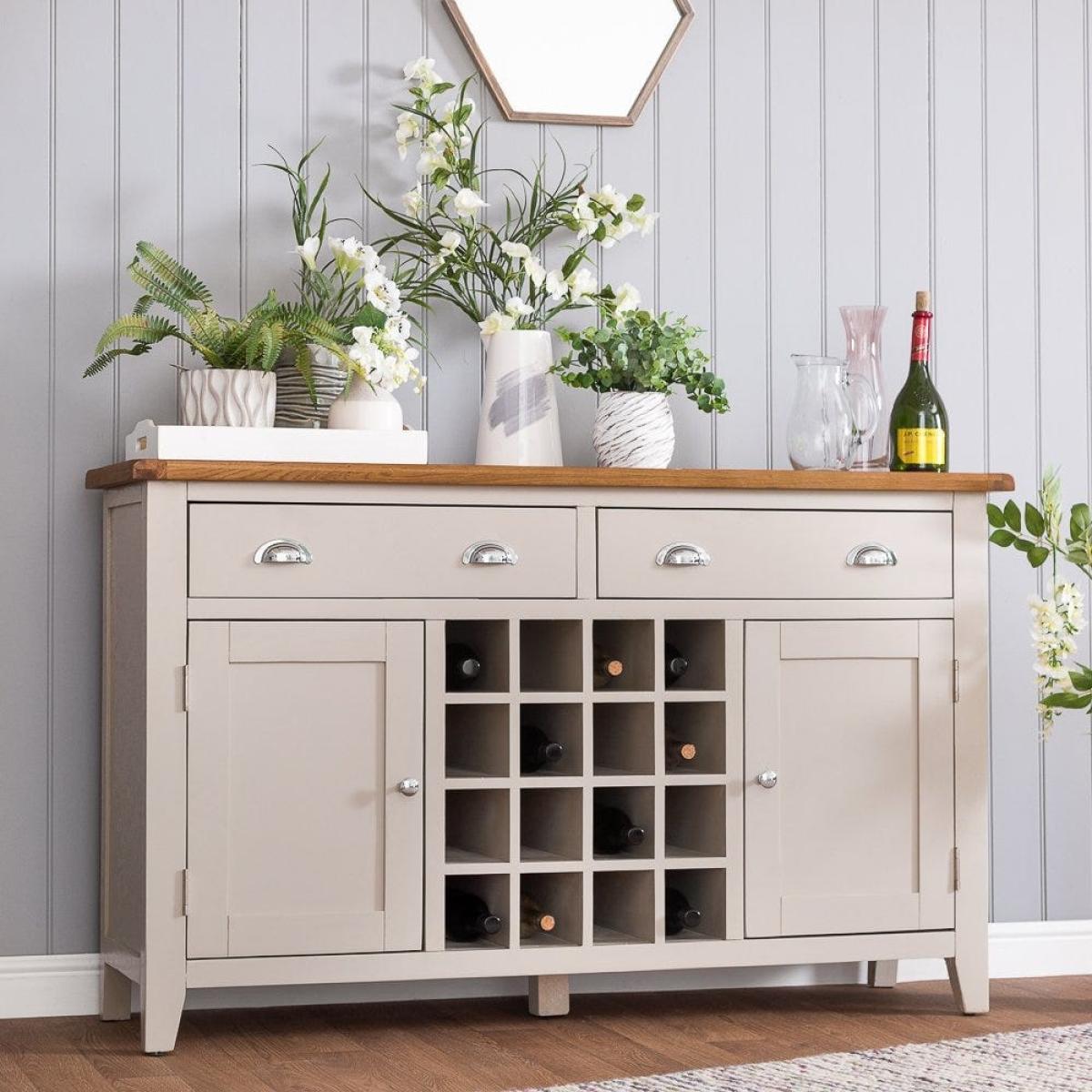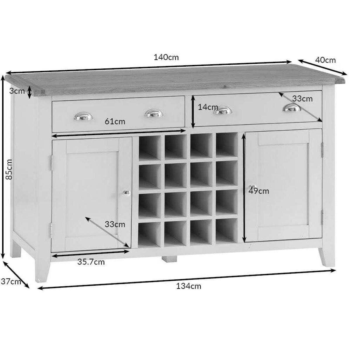 Bottoms up – it’s time to raise a glass to the Chester stone painted oak two-door large sideboard with wine rack. Its sleek symmetrical design is pleasing to look at and enhanced by the finer details, such as the shiny chrome handles and gorgeous oak top surface. Finished in a subtle stone shade, the cupboards and drawers make an attractive storage spot for all your glasses and corkscrews. Slide a few of your favourite bottles onto the built-in wine rack, and immediately slide them back out again when everyone comes calling just in time for wine o’clock. Please note, the manufacturer refers to the colour of this range as Truffle. As such, the word 'Truffle' is displayed on the packaging. The images on-site were taken in our photography studio and are an extremely accurate reflection of colour.