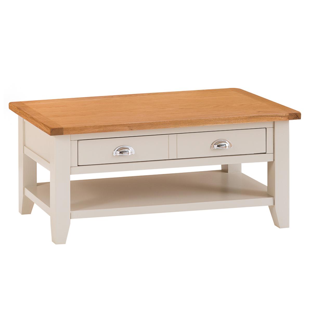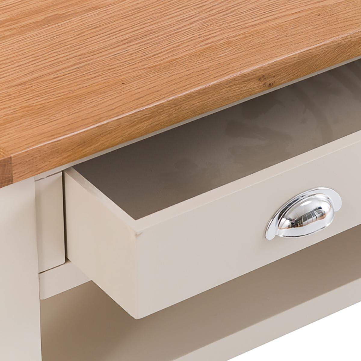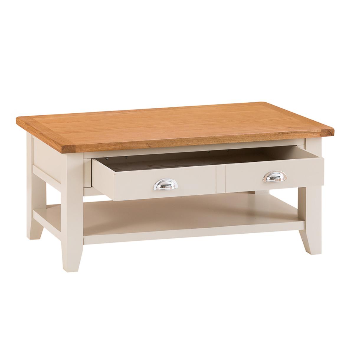 Create a perfect living room centrepiece with this functional and practical Chester Grey Painted Oak Coffee Table With Drawers. Coffee Tables simply have to be versatile and robust, crucially this Table offers both open storage space and drawer-based storage, perfect for hiding the clutter that so often accumulates in the living room. The large drawer featured in this Coffee Table is dovetailed and pushes out either side of the unit, whilst the oak top provides a wonderful contrast against the stone grey painted finish and rounded chrome handle. This mix of contemporary and country styles within a single unit is so in-vogue right now and with this wonderful Coffee Table you can stay ahead of the curve. On a budget? There is a smaller drawer-less Coffee Table within the Chester Grey Collection. Please note, the manufacturer refers to the colour of this range as Truffle. As such, the word 'Truffle' is displayed on the packaging. The images on-site were taken in our photography studio and are an extremely accurate reflection of colour.