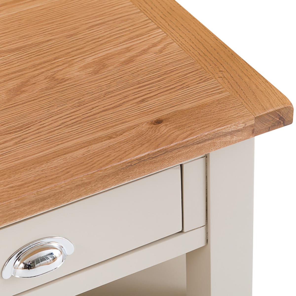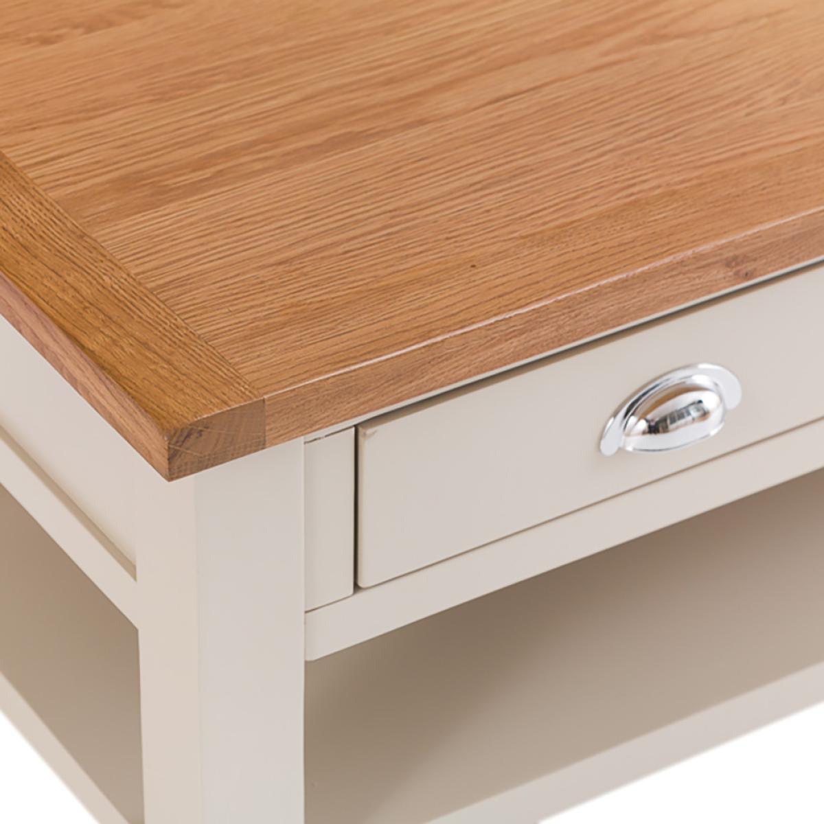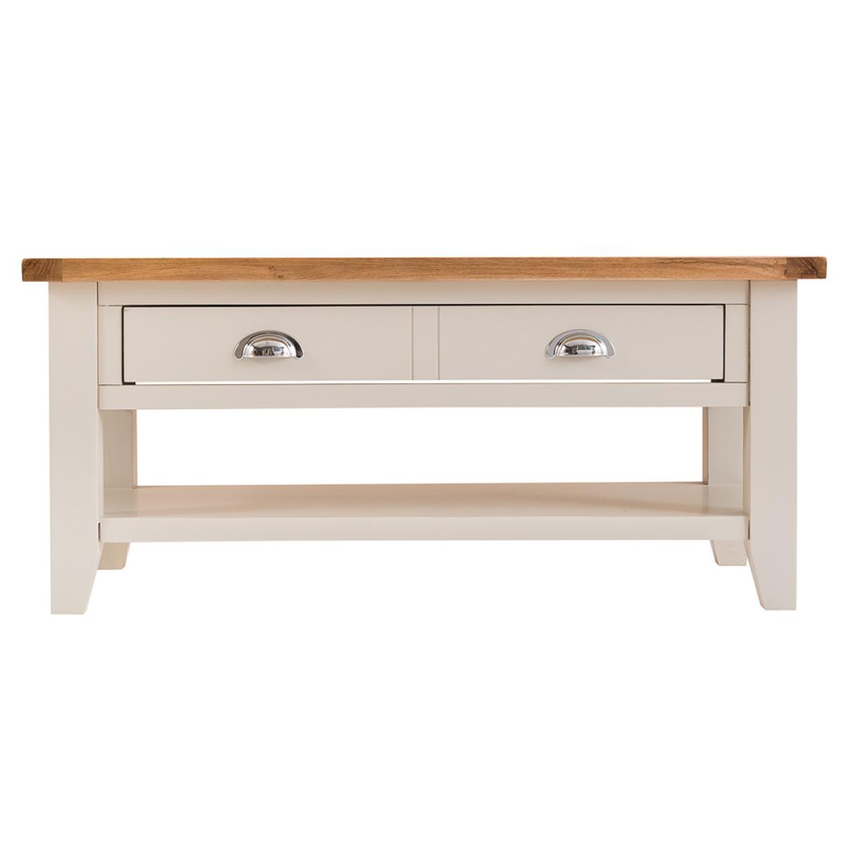 Create a perfect living room centrepiece with this functional and practical Chester Grey Painted Oak Coffee Table With Drawers. Coffee Tables simply have to be versatile and robust, crucially this Table offers both open storage space and drawer-based storage, perfect for hiding the clutter that so often accumulates in the living room. The large drawer featured in this Coffee Table is dovetailed and pushes out either side of the unit, whilst the oak top provides a wonderful contrast against the stone grey painted finish and rounded chrome handle. This mix of contemporary and country styles within a single unit is so in-vogue right now and with this wonderful Coffee Table you can stay ahead of the curve. On a budget? There is a smaller drawer-less Coffee Table within the Chester Grey Collection. Please note, the manufacturer refers to the colour of this range as Truffle. As such, the word 'Truffle' is displayed on the packaging. The images on-site were taken in our photography studio and are an extremely accurate reflection of colour.