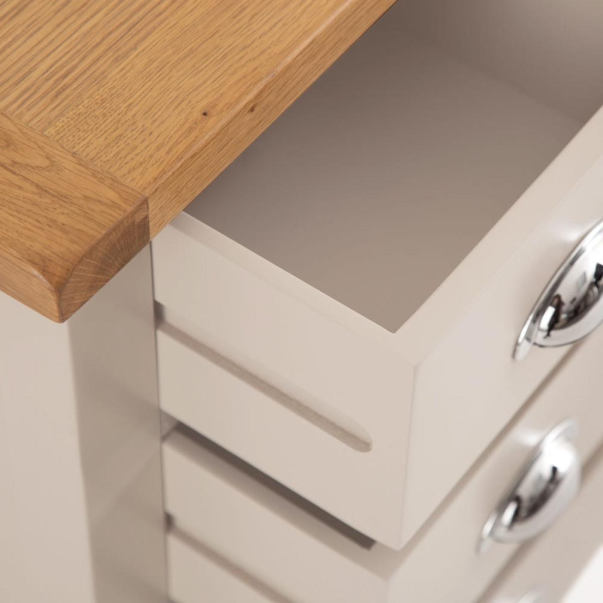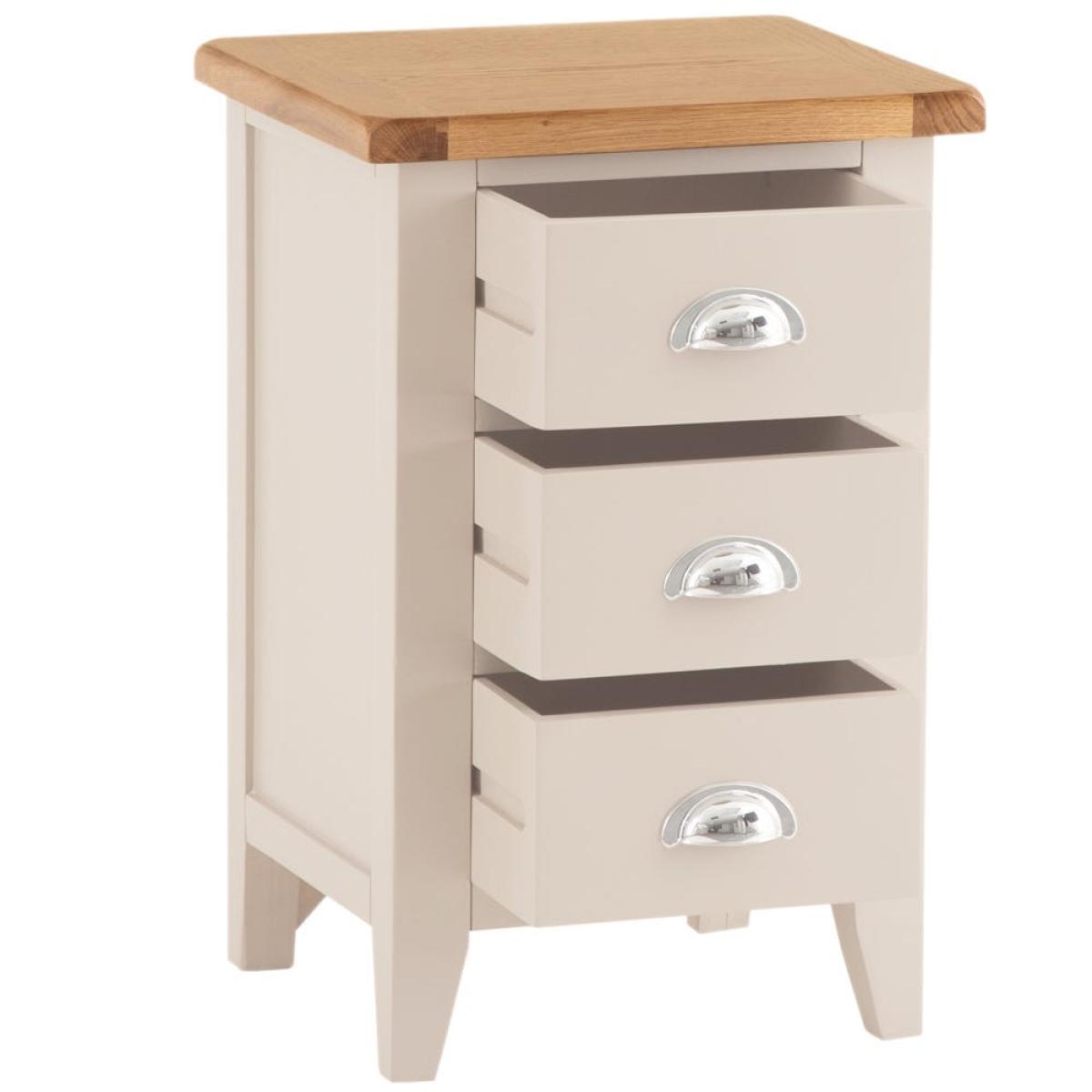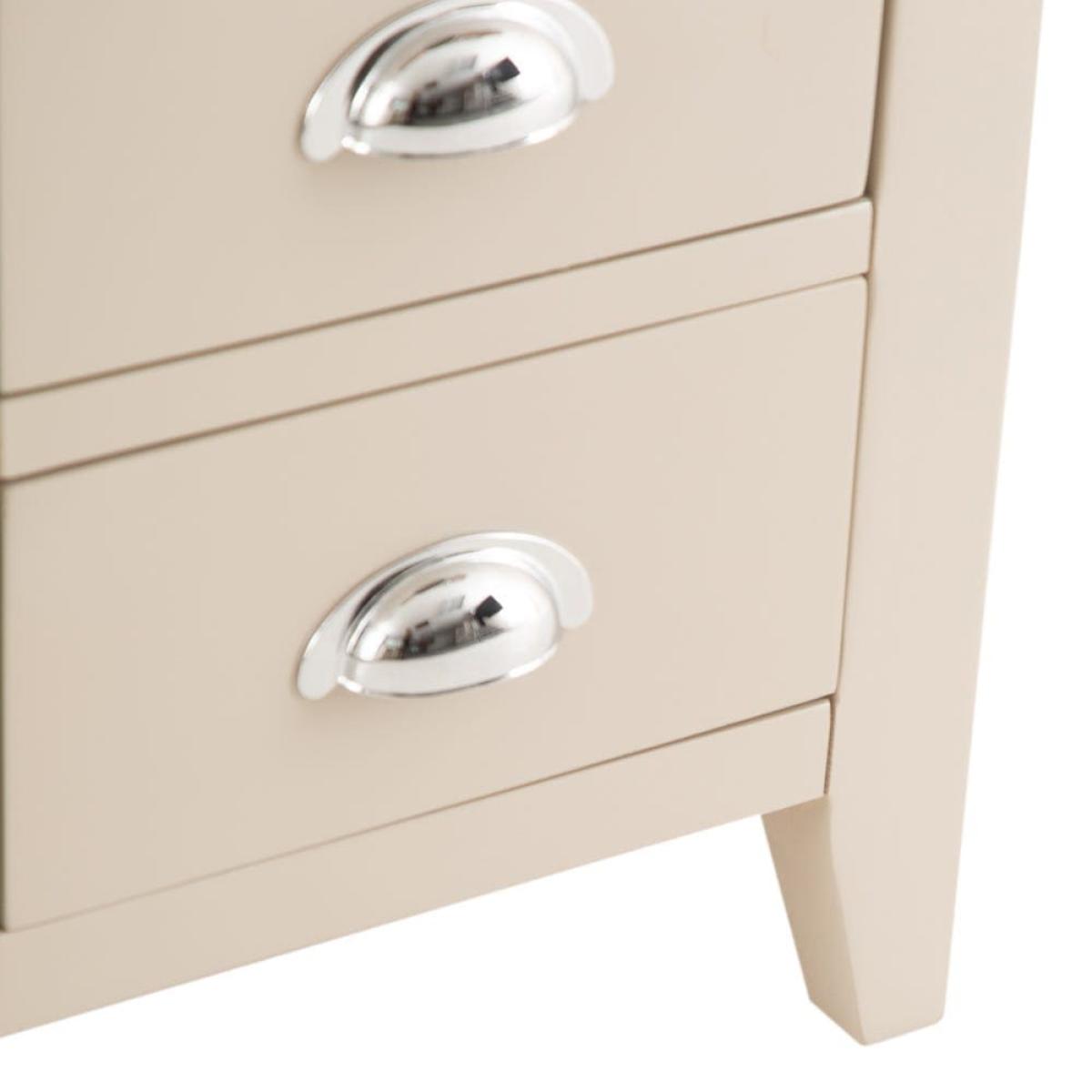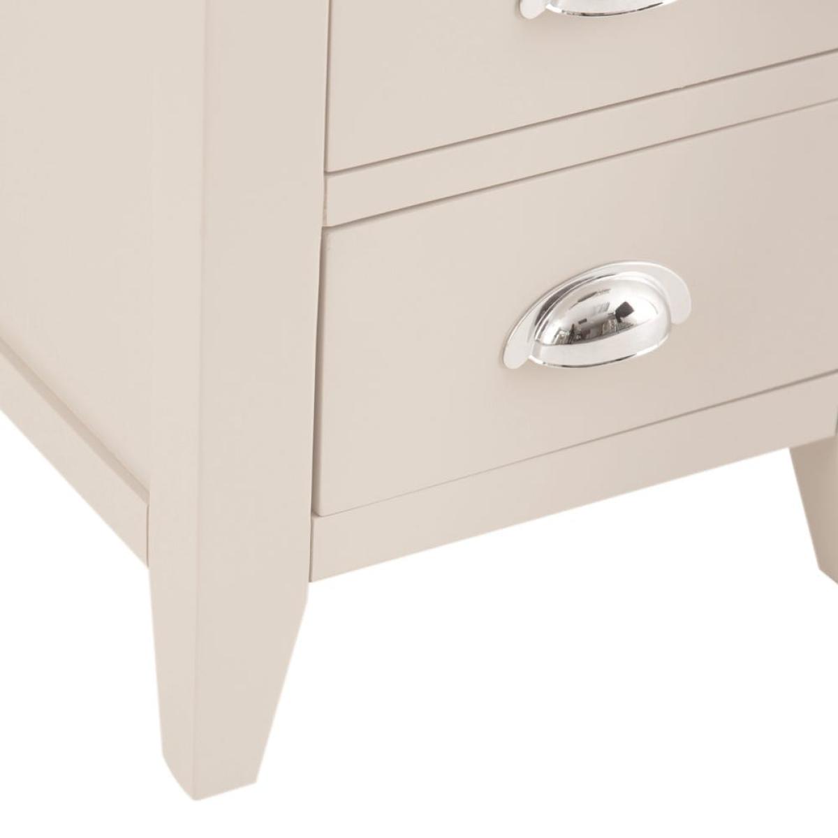 There’s no better bedside companion than one (or two) of the Chester stone painted oak large bedside tables. The chunky farmhouse frame is offset by contemporary chrome handles and an appealing oak wood top. The soft hand painted grey finish ties the whole modern-meets-classic look together. Fill the trio of drawers with all sorts of bits and bobs – tuck your phone in a drawer to resist looking at it until the morning, and perhaps grab a paperback for a bit of bedtime reading. Perch a lovely lamp on the top surface to read it by. Please note, the manufacturer refers to the colour of this range as Truffle. As such, the word 'Truffle' is displayed on the packaging. The images on-site were taken in our photography studio and are an extremely accurate reflection of colour.