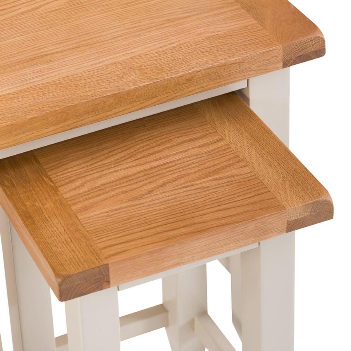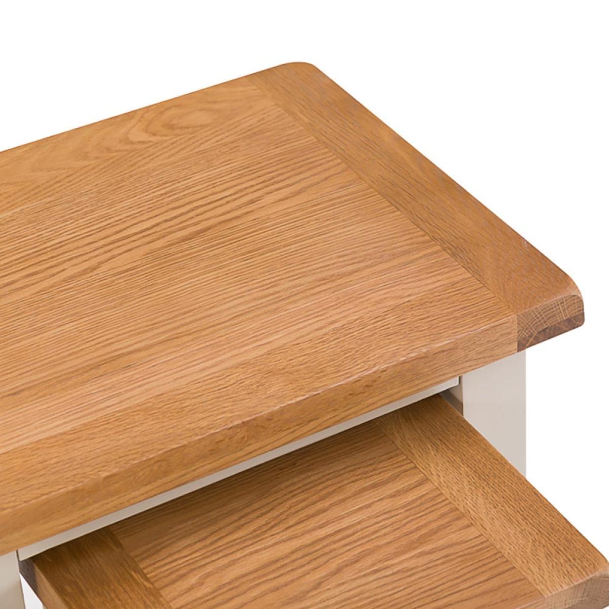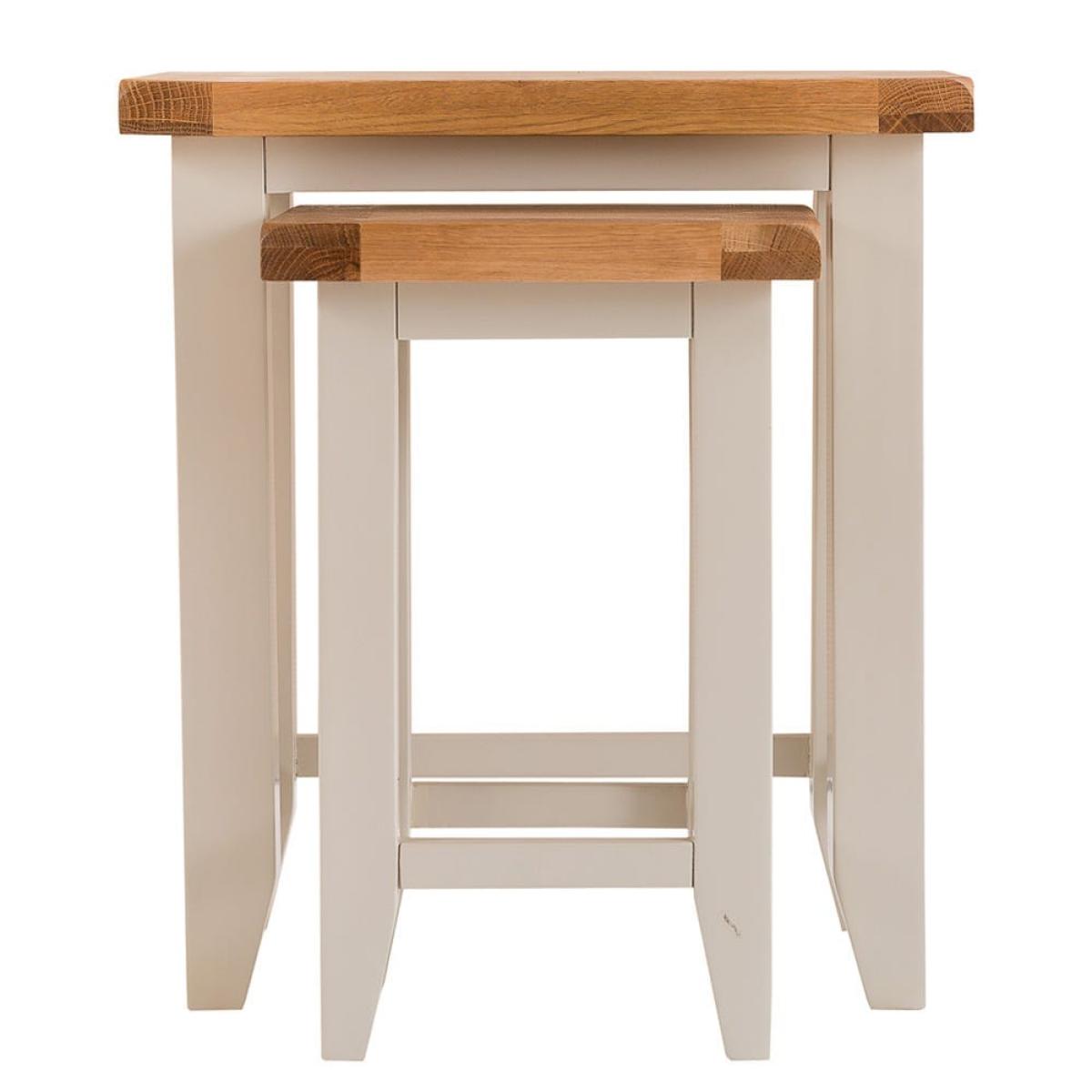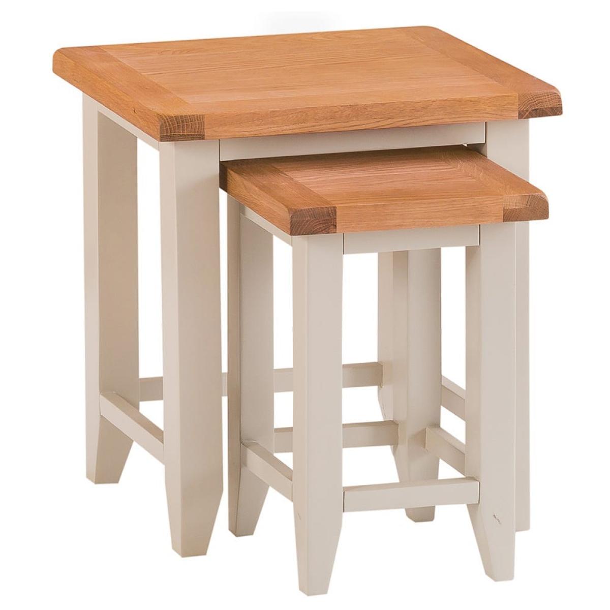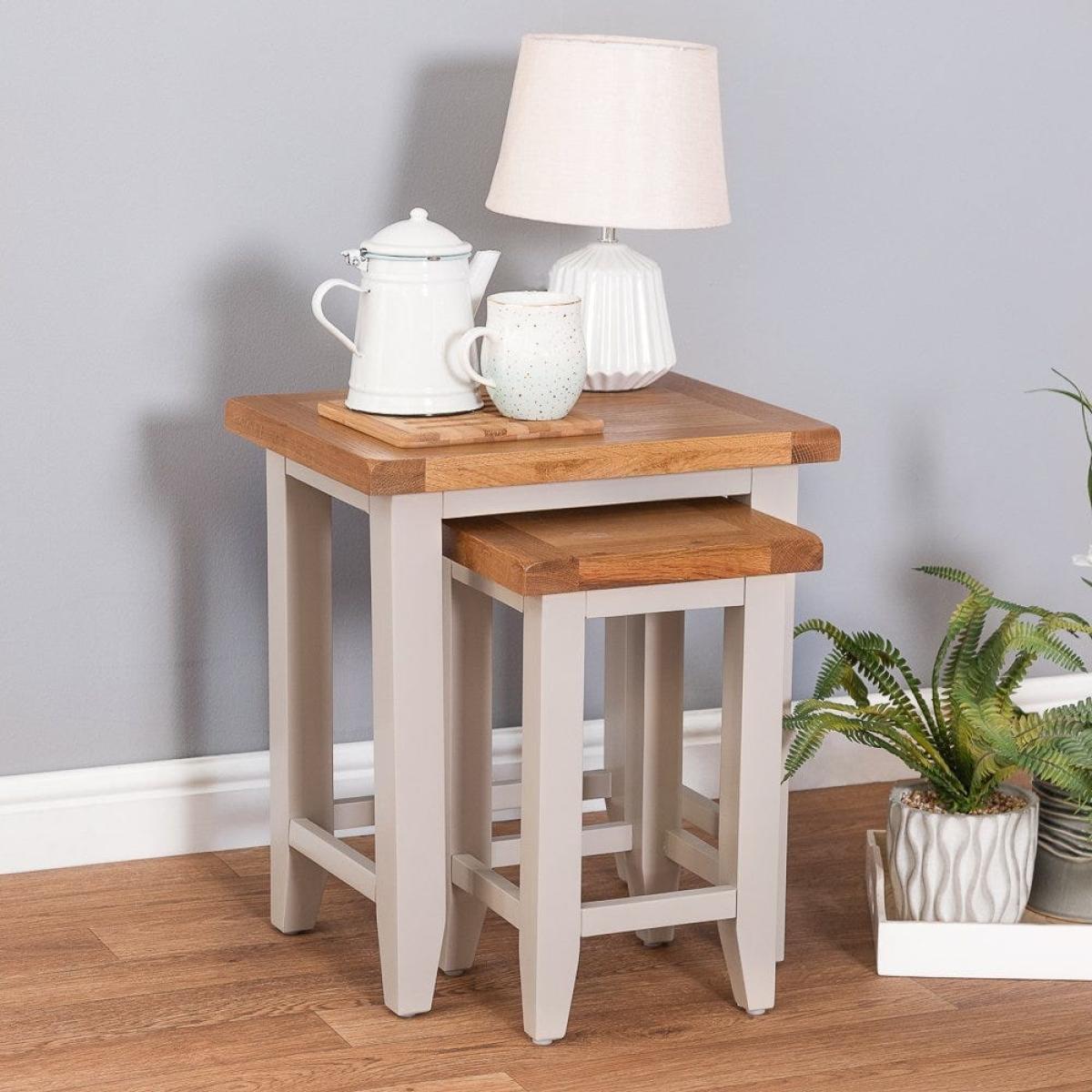 When one table alone just won’t do, the Chester stone painted oak nest of two tables comes to the rescue. The appealing oak top surfaces are a great spot to place a steaming cup of tea. And when you’ve got more guests than usual, simply slide out the smaller second table. With a chunky, farmhouse style frame finished in soft stone grey, these tables effortlessly combine rustic charm and contemporary class. Carefully crafted and always in style, you’ll be able to enjoy them for years to come. Please note, the manufacturer refers to the colour of this range as Truffle. As such, the word 'Truffle' is displayed on the packaging. The images on-site were taken in our photography studio and are an extremely accurate reflection of colour.