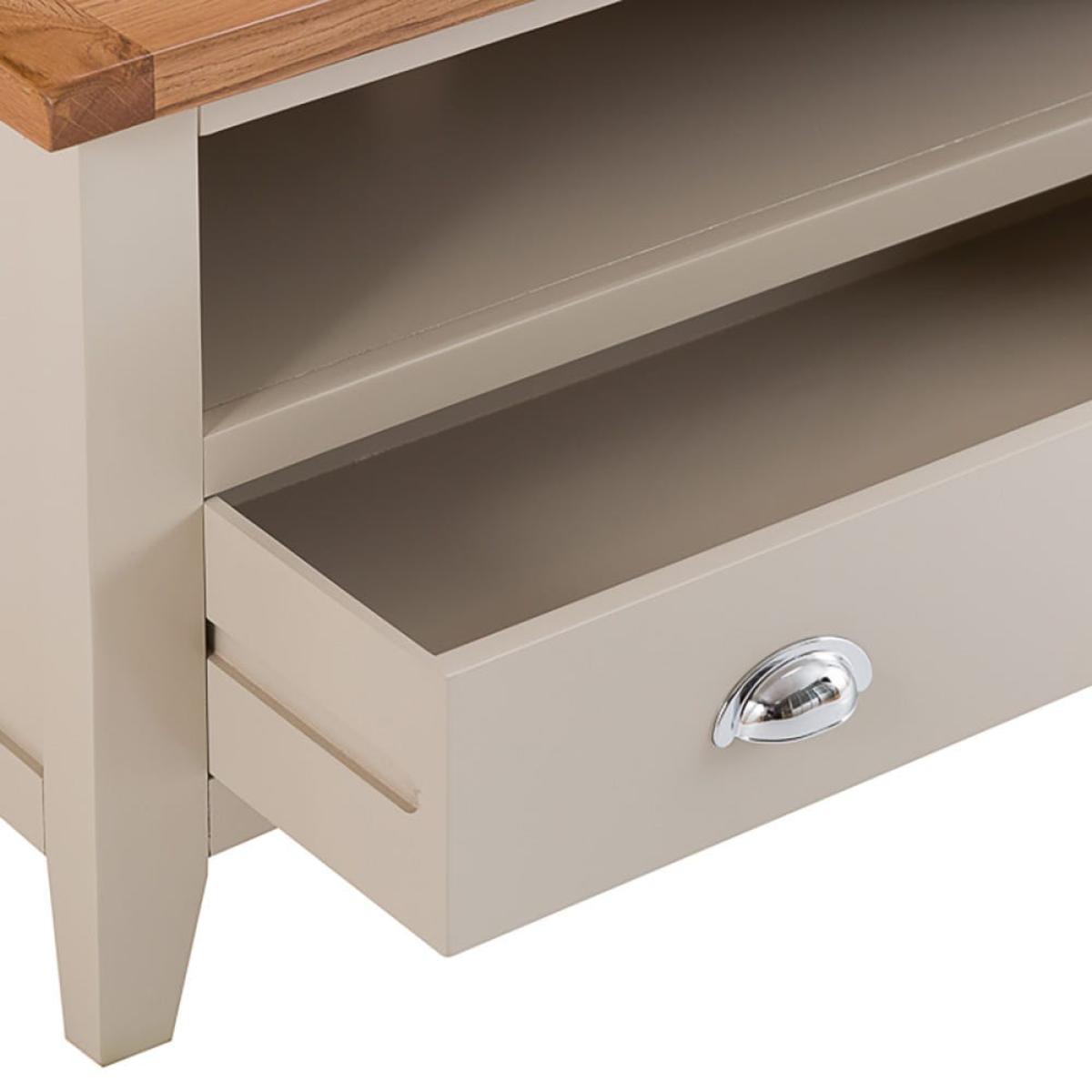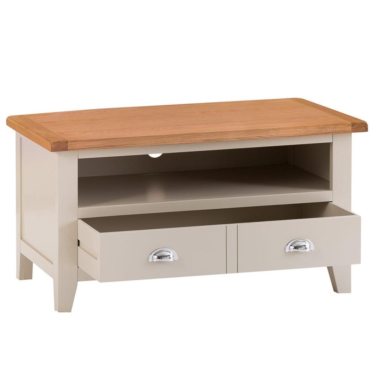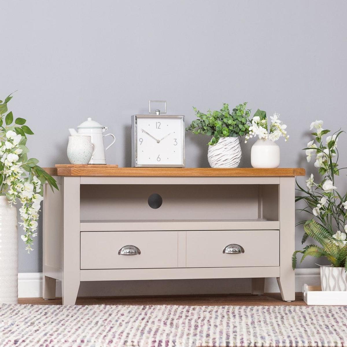 This small TV unit is a fantastic choice for adding a touch of warmth and subtle texture to a range of interiors. Its painted oak finish offers a neutral, understated look that pairs well with both contemporary and traditional spaces, while the small size makes it perfect for cosy living rooms or compact apartments. Styling tips include layering with monochrome accessories or natural materials like woven baskets and ceramics to create a balanced, inviting look. For functionality, use the open shelf for electronic devices and the drawers for remote controls and other essentials, keeping the surface uncluttered. Overall, it's a versatile piece that combines practicality with a soft, rustic charm.