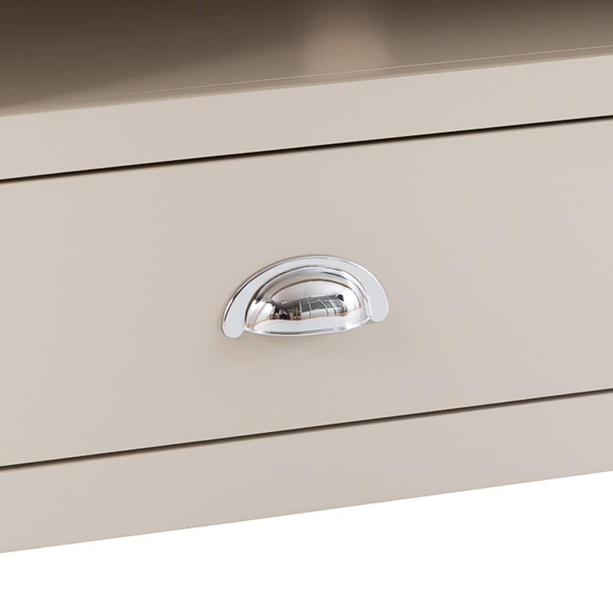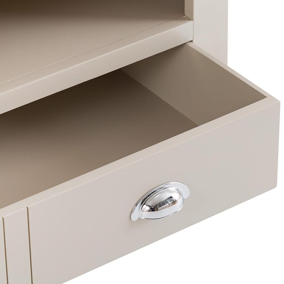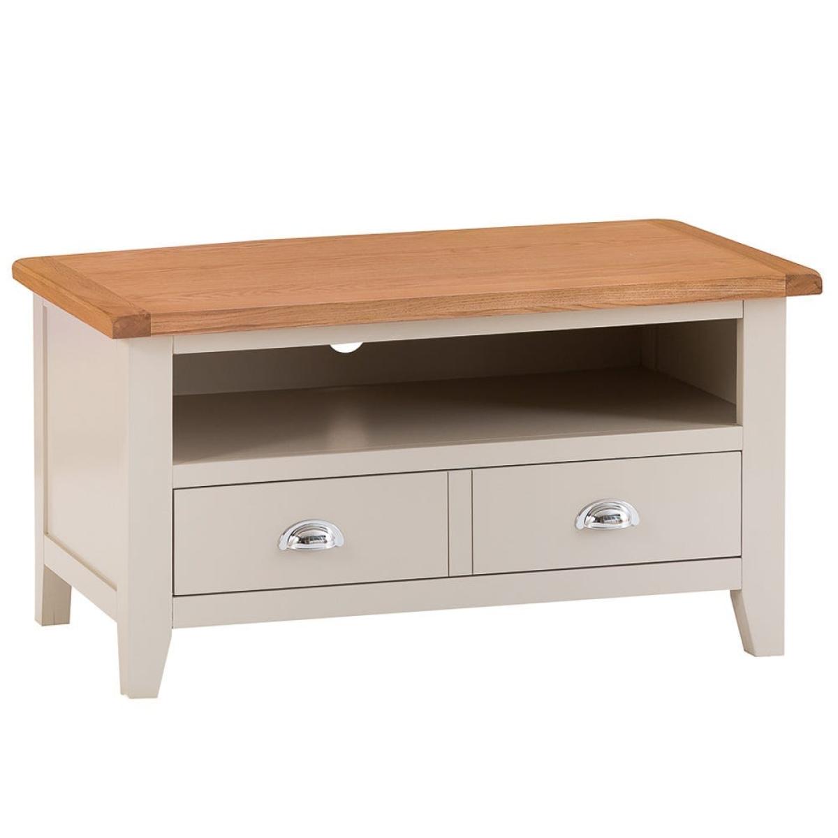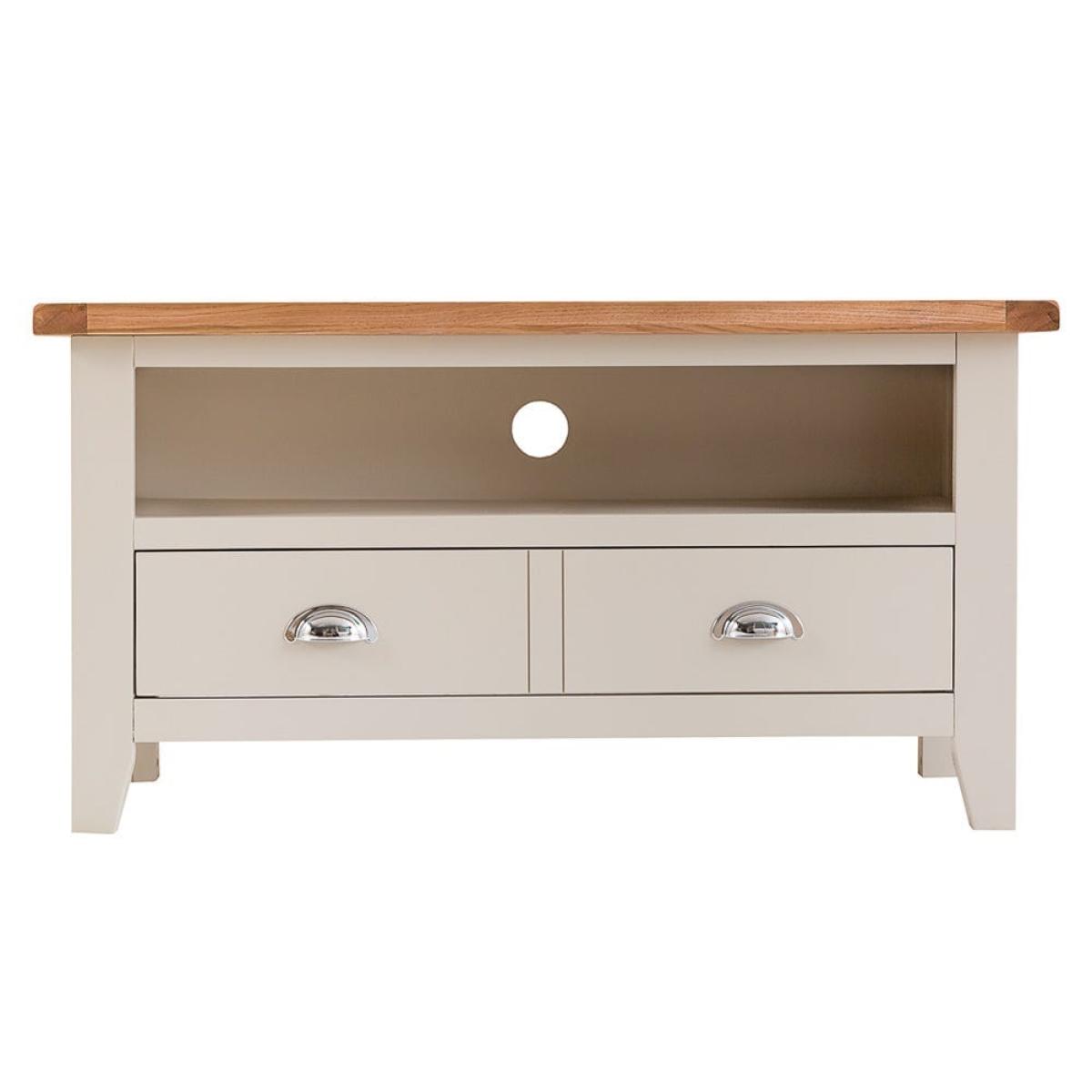 This small TV unit is a fantastic choice for adding a touch of warmth and subtle texture to a range of interiors. Its painted oak finish offers a neutral, understated look that pairs well with both contemporary and traditional spaces, while the small size makes it perfect for cosy living rooms or compact apartments. Styling tips include layering with monochrome accessories or natural materials like woven baskets and ceramics to create a balanced, inviting look. For functionality, use the open shelf for electronic devices and the drawers for remote controls and other essentials, keeping the surface uncluttered. Overall, it's a versatile piece that combines practicality with a soft, rustic charm.