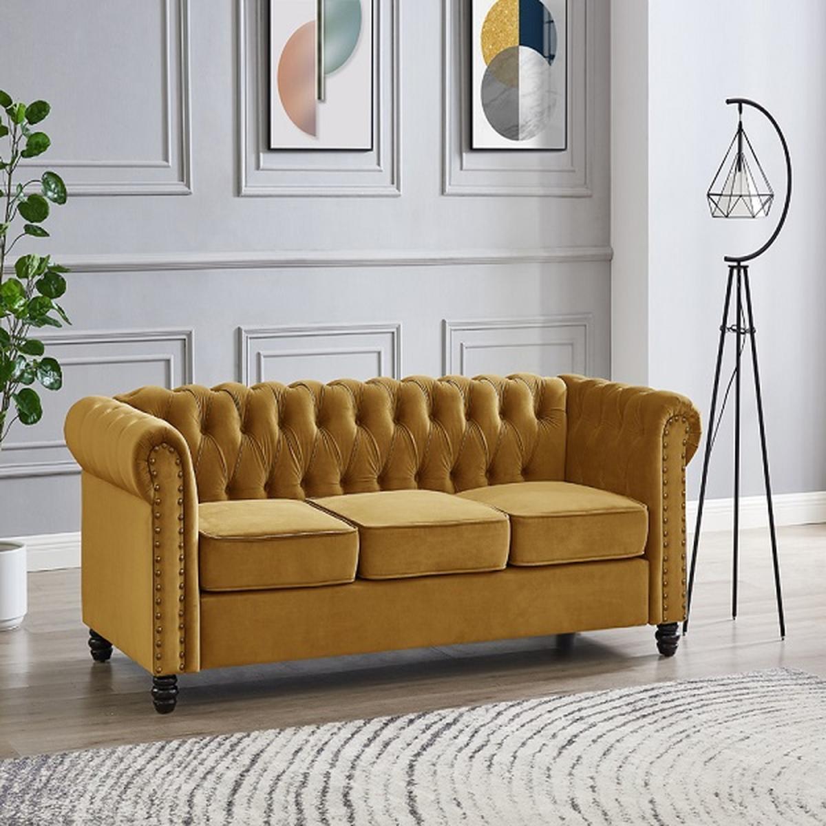 Introducing CHESTERFIELD our elegant velvet sofa range, with seating options of 2 and 3 seater. Available in aa elegant colour palette of grey, blue, green, black and gold velvet. CHESTERFIELD has the classic chesterfield inspired tufted detail on the interior of the seat area and smooth velvet wrapping around the outside. With loose seat cushions, the armrests are high with a scrolling design and stud detailing around the front of the armrest. CHESTERFIELD sofas stands on traditional wooden legs. Velvet is one of the most desirable upholstery fabrics. Its soft texture perfectly suits any piece of furniture and adds a touch of opulence and elegance. It is a woven fabric with a short, thick, plush pile. One of the best ways to keep your sofa bed looking great is to vacuum it once a week. Use a low setting and the upholstery attachment of your vacuum cleaner to avoid any damage to the fabric. Just make sure to vacuum in the direction of the pile. Alternatively using a sofa hand brush can fluff the fibres back up and keep the fabric and colour intact. Fabric can absorb stains quickly, so removing them as soon as possible is best. Soak up any excess liquid with a clean, dry cloth, then spot-clean the area with a fabric upholstery cleaner following the instructions on the bottle. Velvet can have a distinct appearance, in natural light it tends to shimmer more, whereas in artificial lighting indoors, it tends to look more subdued. The colour of velvet may change if you stroke it in different directions, to maintain consistency, stroke the velvet in one direction with an open palm.