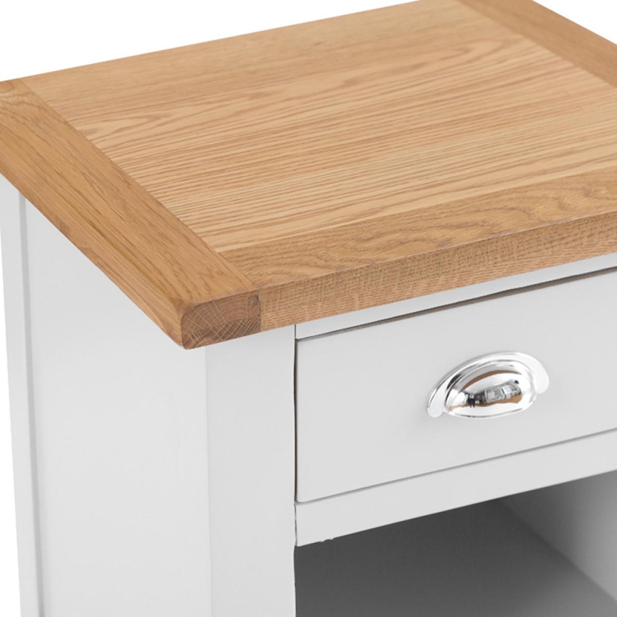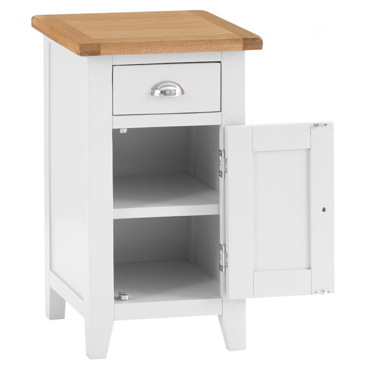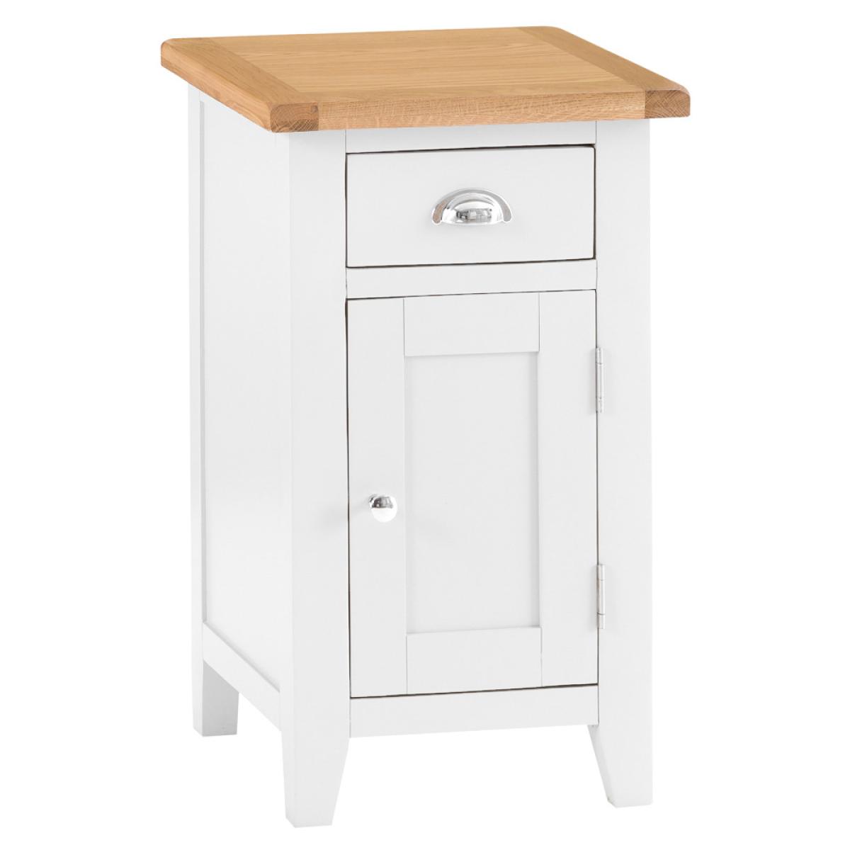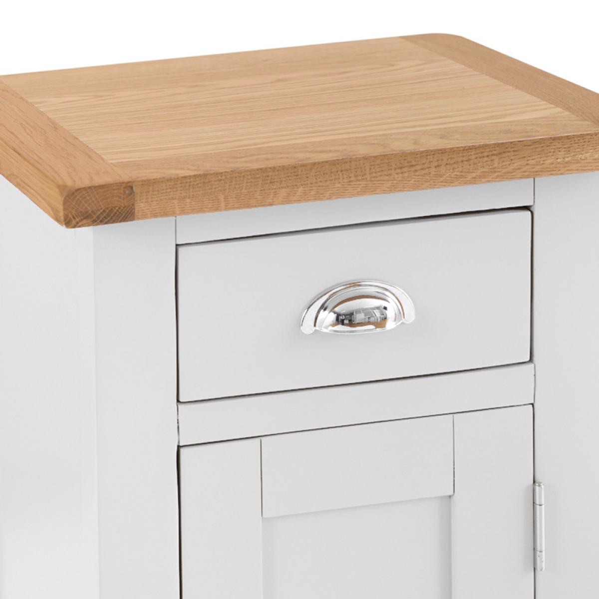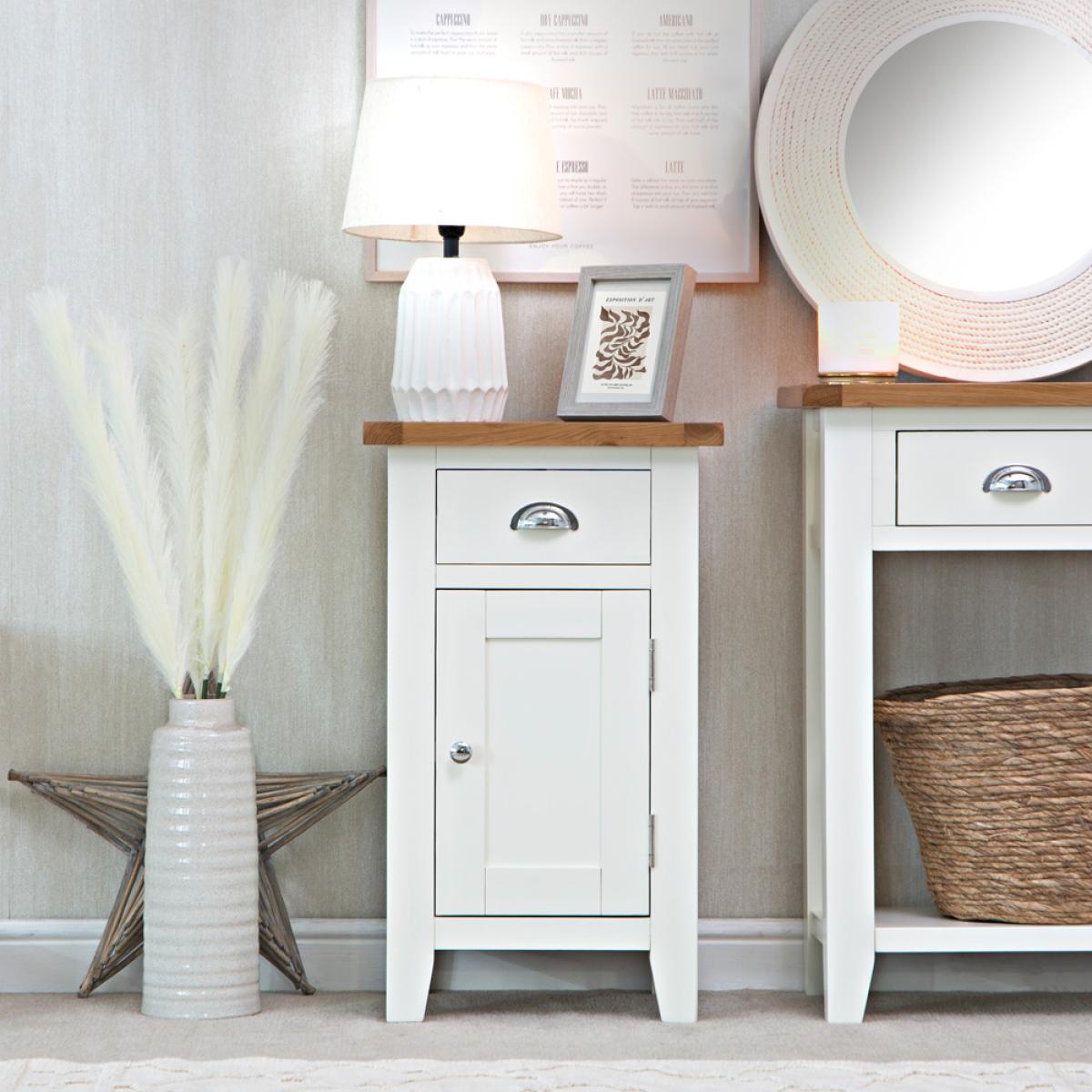 The Chester White Painted Oak 1 Door Small Cupboard is a perfect, practical solution for a small space. With a mix of cupboard and drawer-based storage, you can keep your your Wife's gossip magazine collection out-of-sight and out-of-mind, no problem! The crisp white painted frame contrasts wonderfully with the smooth chrome cup handle and gorgeous oak top, providing a unit that's as aesthetically pleasing as it is practical. Seeing really is believing when it comes to this Mini Cupboard and once you've ordered one, there won't be a spare alcove in the rest of the house. This is the smallest of the cupboards/sideboards in this collection, if more space is available you may wish to consider the Small or Medium Sideboard. Please note: This item is not pure/brilliant White. It is very slightly off white, described as 'old white'.