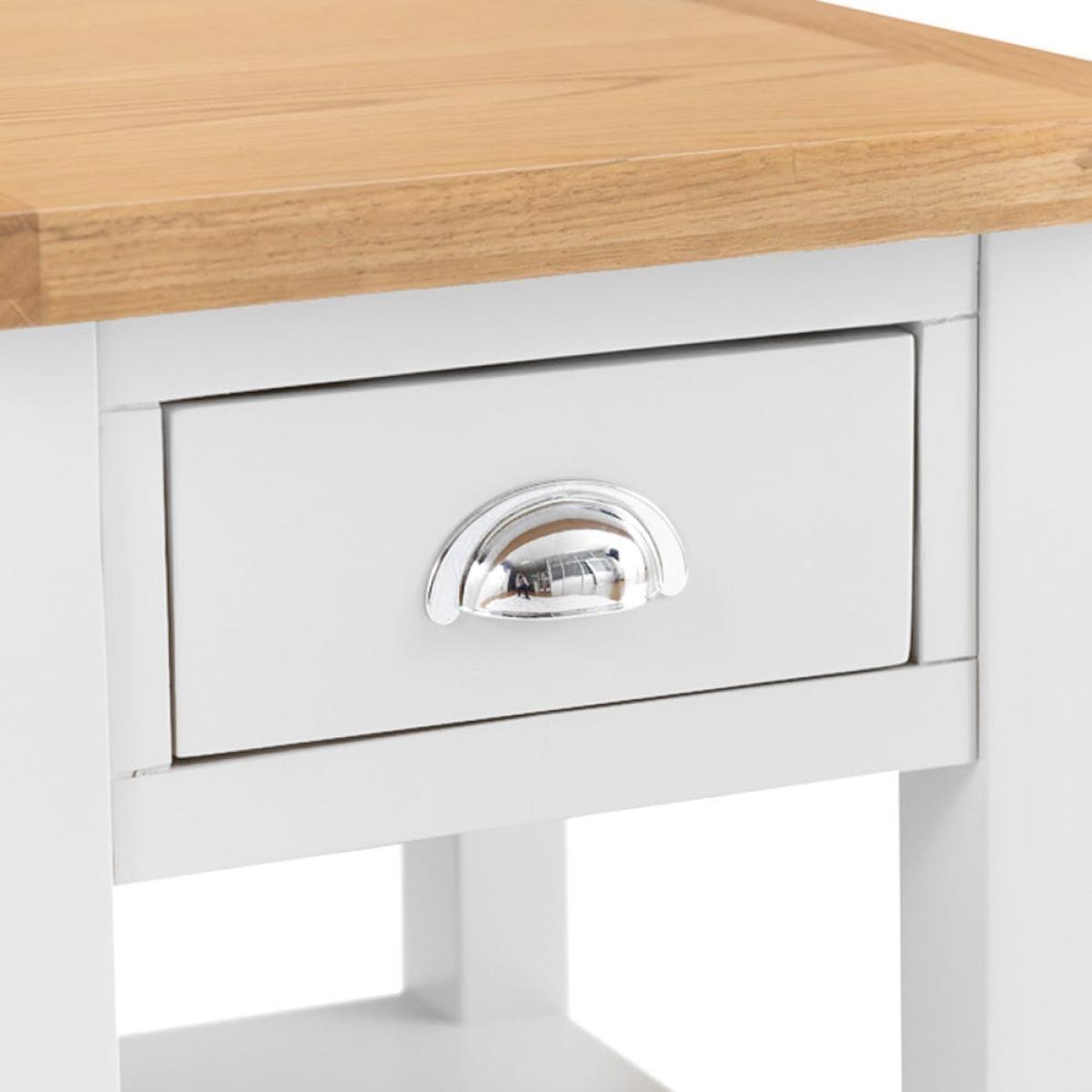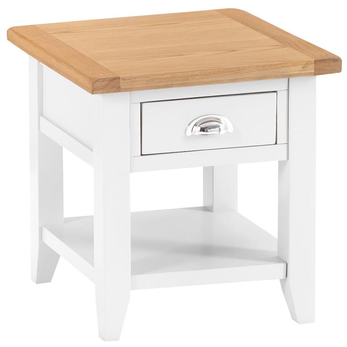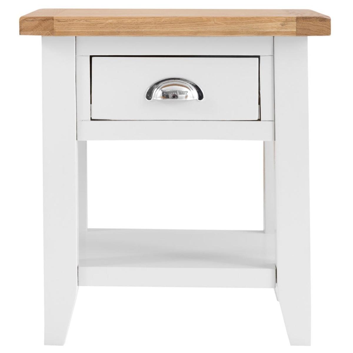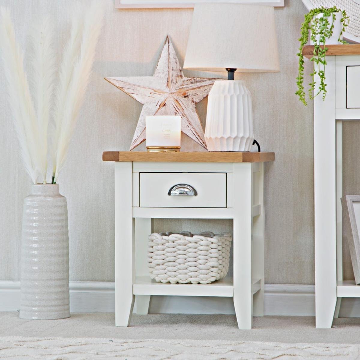 When the night rolls in, fill your cosy living space with a warm and comforting glow by reaching for the Chester white painted oak one drawer large lamp table. Placed in the corner of any room – or perhaps in your favourite reading spot – this hand painted white table is the perfect perch for an eye-catching lamp. And why not add a couple of candles for a different kind of light?. The small dovetailed drawer is a great place to store spare coasters to rest a calming cup of evening cocoa upon. And the handy lower shelf is the perfect spot for a pile of magazines or books. Please note: This item is not pure/brilliant White. It is an off-white, described as 'old white'.
