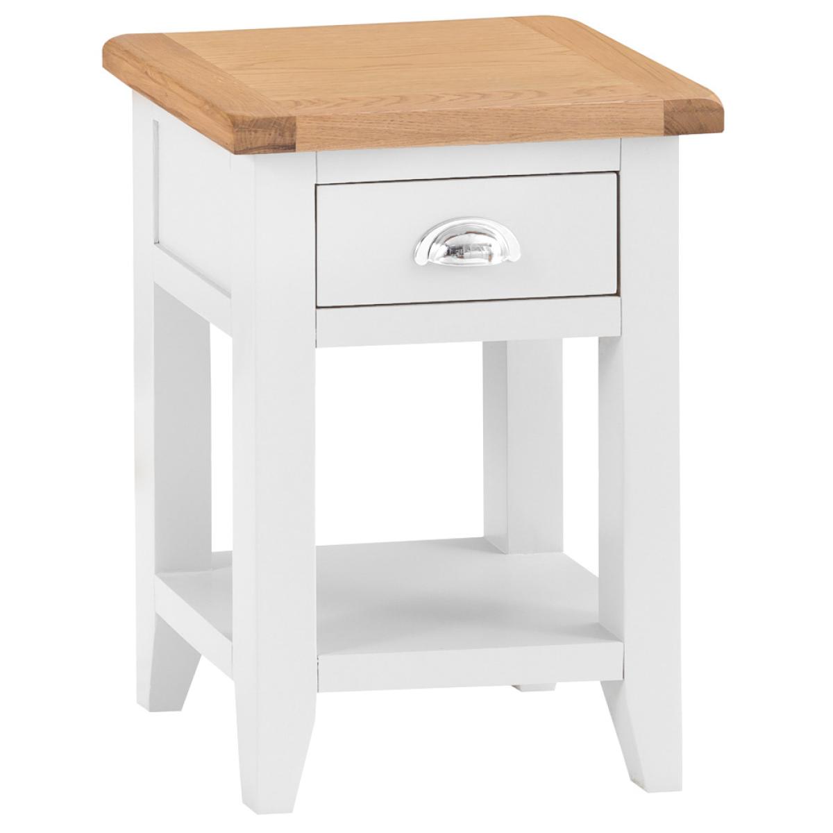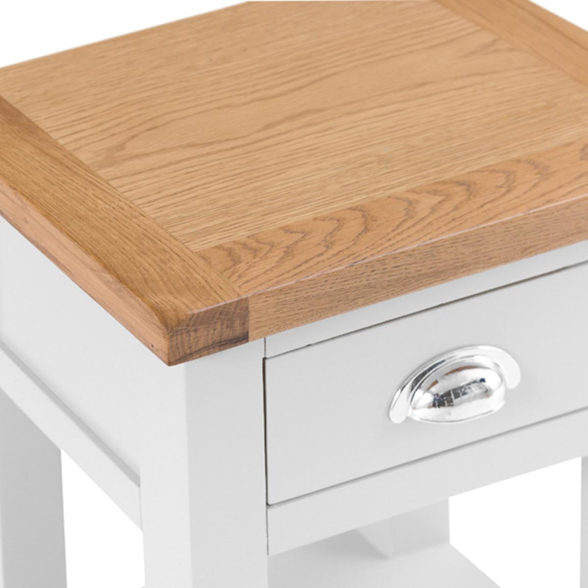 The Chester White Painted Oak 1 Drawer Small Lamp Table is ideal if space is at a premium. Perfect for use as a Side Table or even a Bedside Table, this compact unit would be a shrewd little addition to any room in the home. The contrast between oak top and crisp white painted frame is truly something to behold whilst the rounded chrome handles complete the look perfectly. Offering exceptional value for money, you get some real bang for your buck here, with both drawer-based storage and an open shelf below. This is the smallest of the Lamp/Side Tables in this collection, if you require something larger you may wish to consider the 1 Drawer Large Lamp Table.