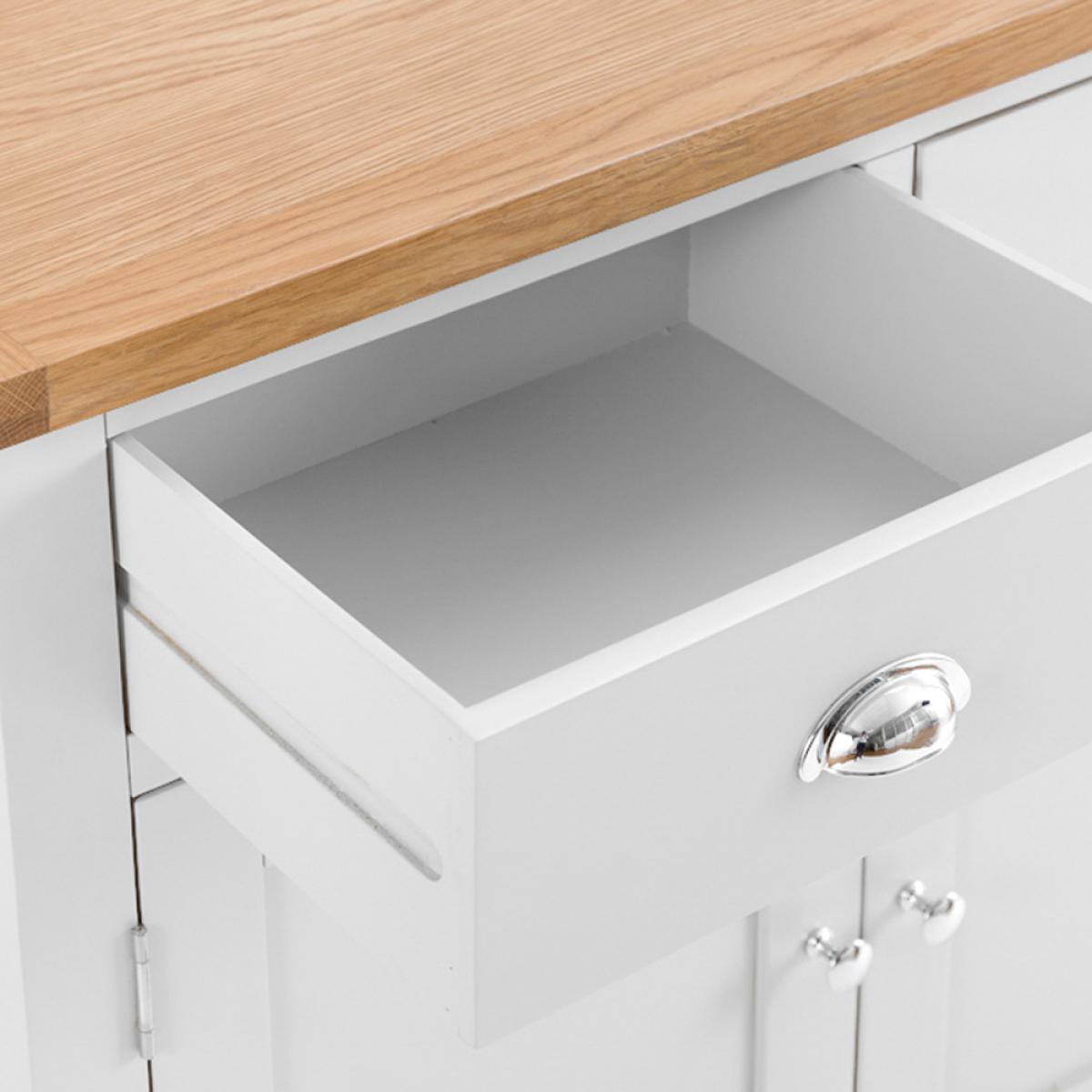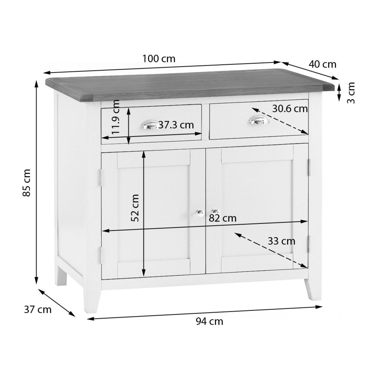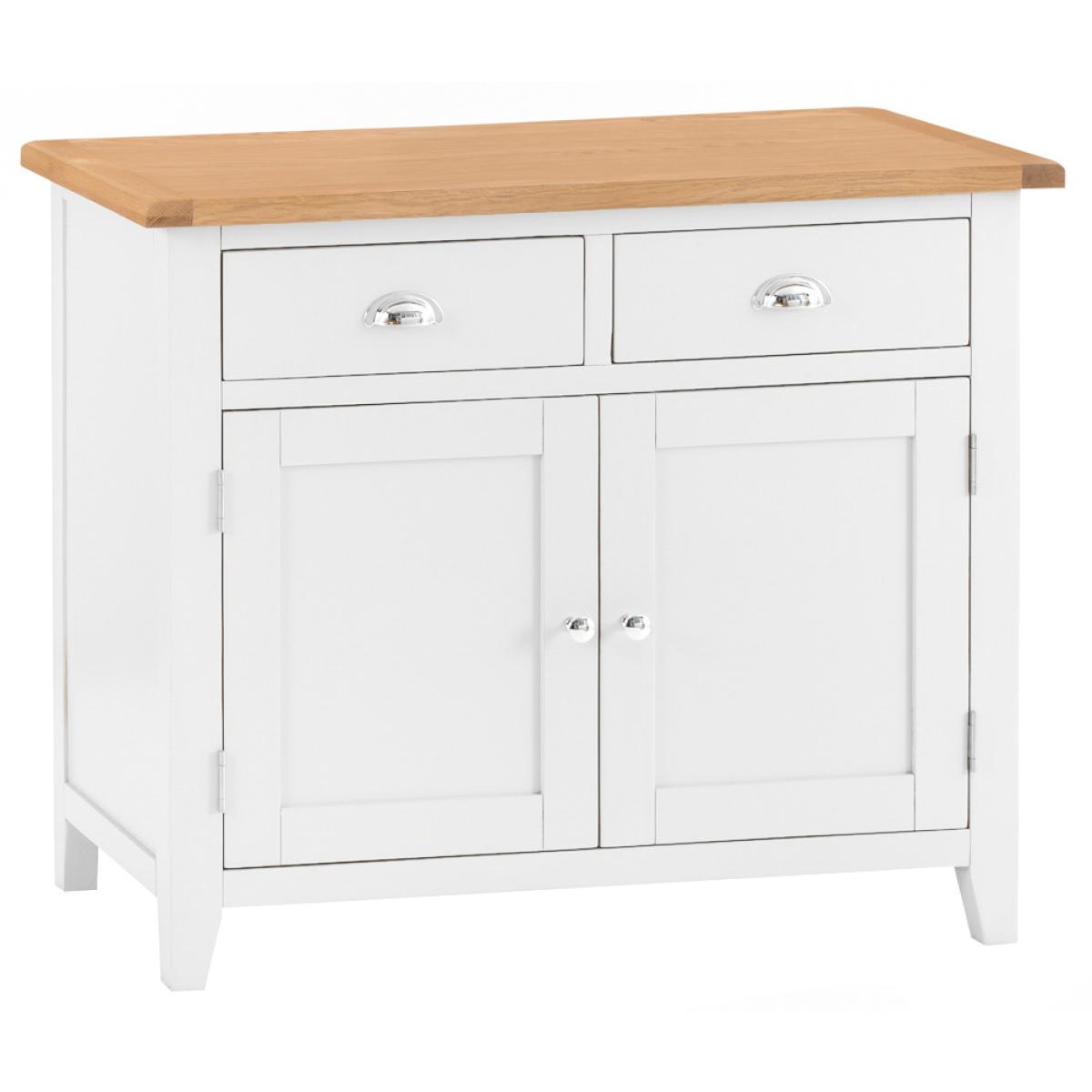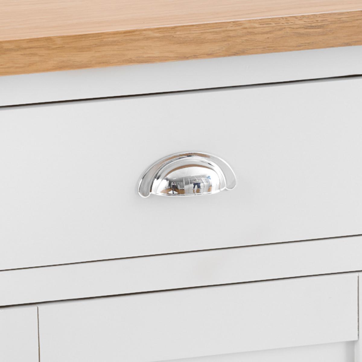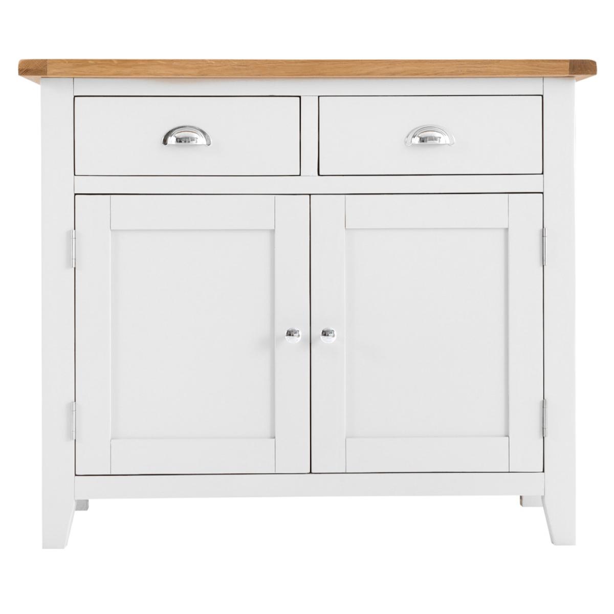 The Chester White Painted Oak 2 Door Medium Sideboard wonderfully showcases all of the characteristics that make this Collection so sought-after. Featuring one large cupboard with a shelf running right across the heart of the unit, there's also 2 sizable drawers and a generously proportioned top surface on which to display ornaments, flowers, photographs of friends/relatives or anything else you might wish to use it for! The crisp white painted frame contrasts wonderfully with the smooth chrome cup handle and gorgeous oak top, providing a unit that's as aesthetically pleasing as it is practical. If this Sideboard doesn't quite fit your requirements there are smaller and larger versions within this collection. Please note: This item is not pure/brilliant White. It is very slightly off white, described as 'old white'.