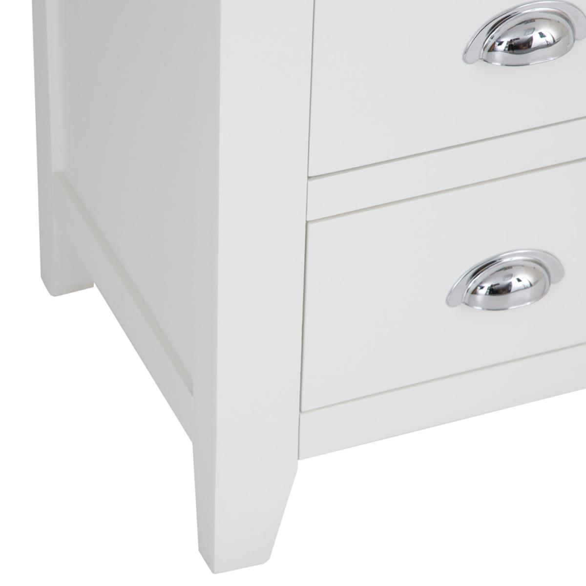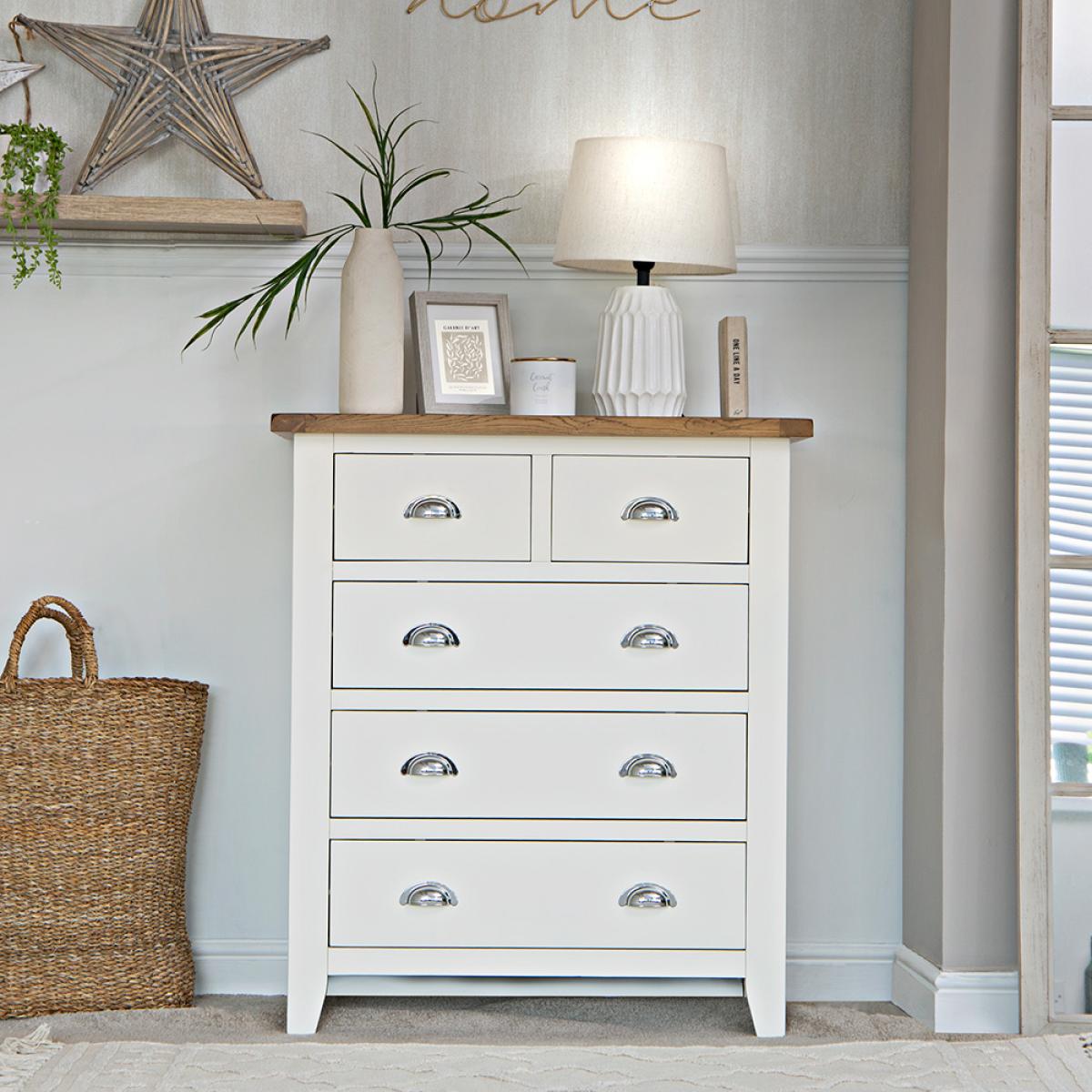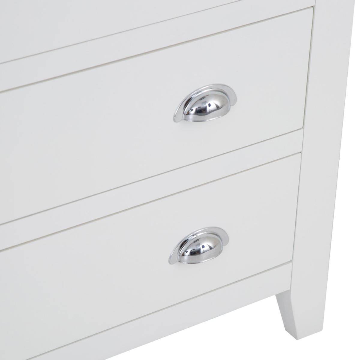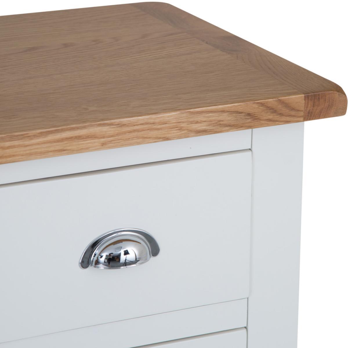 The look and feel of our new Chester White Painted Oak 2 Over 3 Chest is something we're proud of to say the least. To us this is no ordinary Chest of Drawers. It's a statement piece that works wonders in homes that love nothing but the finer things in life. If you want to enjoy artisan quality white painted finishing combined with an oak top, look no further. Everything is then brought together by the signature chrome finishing of the handles that's become the most recognisable hallmark of the Chester White Collection. Please note: This item is not pure/brilliant White. It is very slightly off white, described as 'old white'.