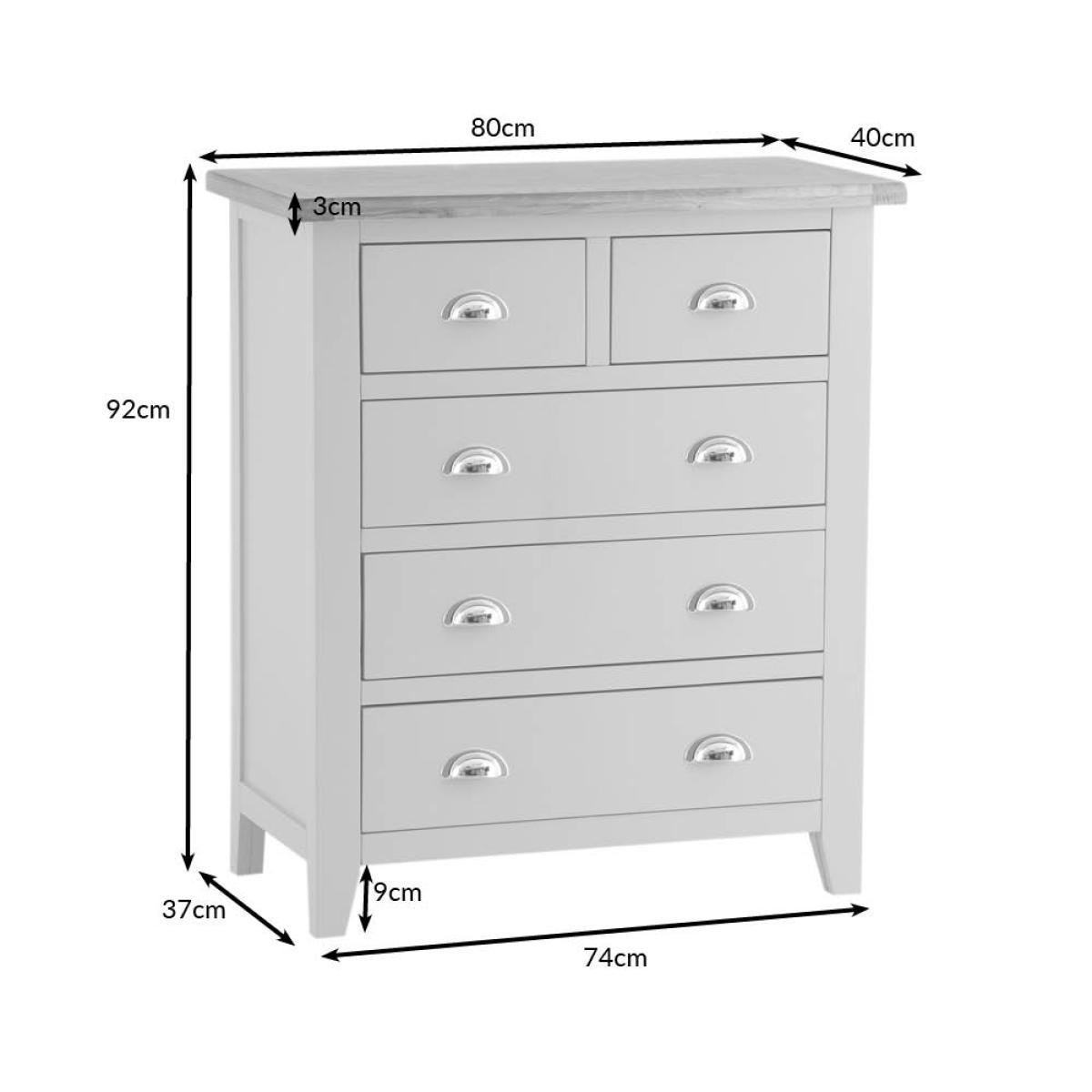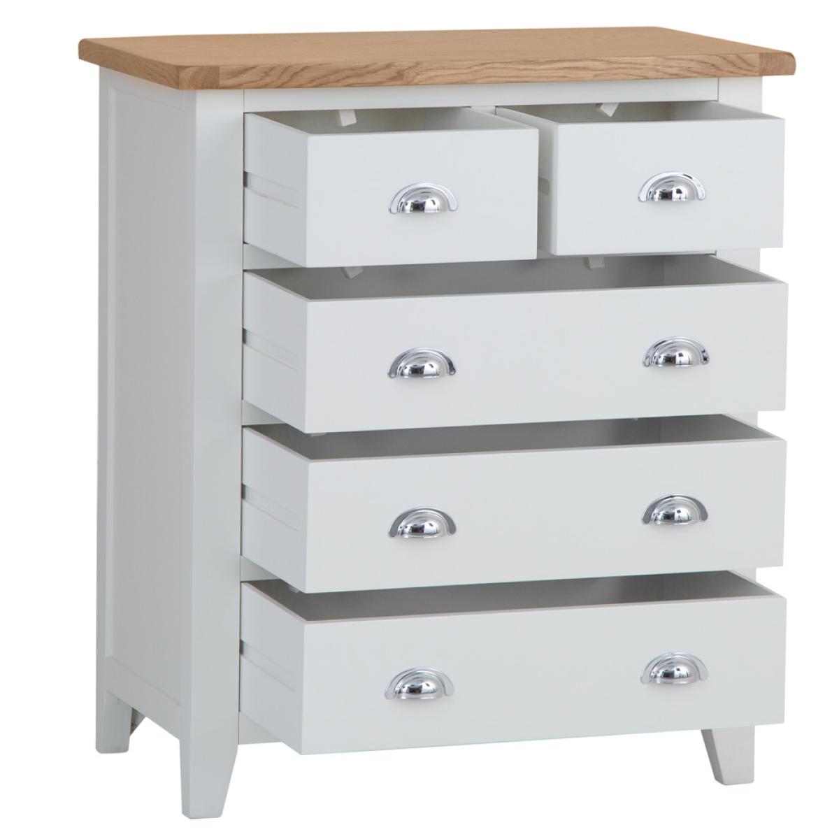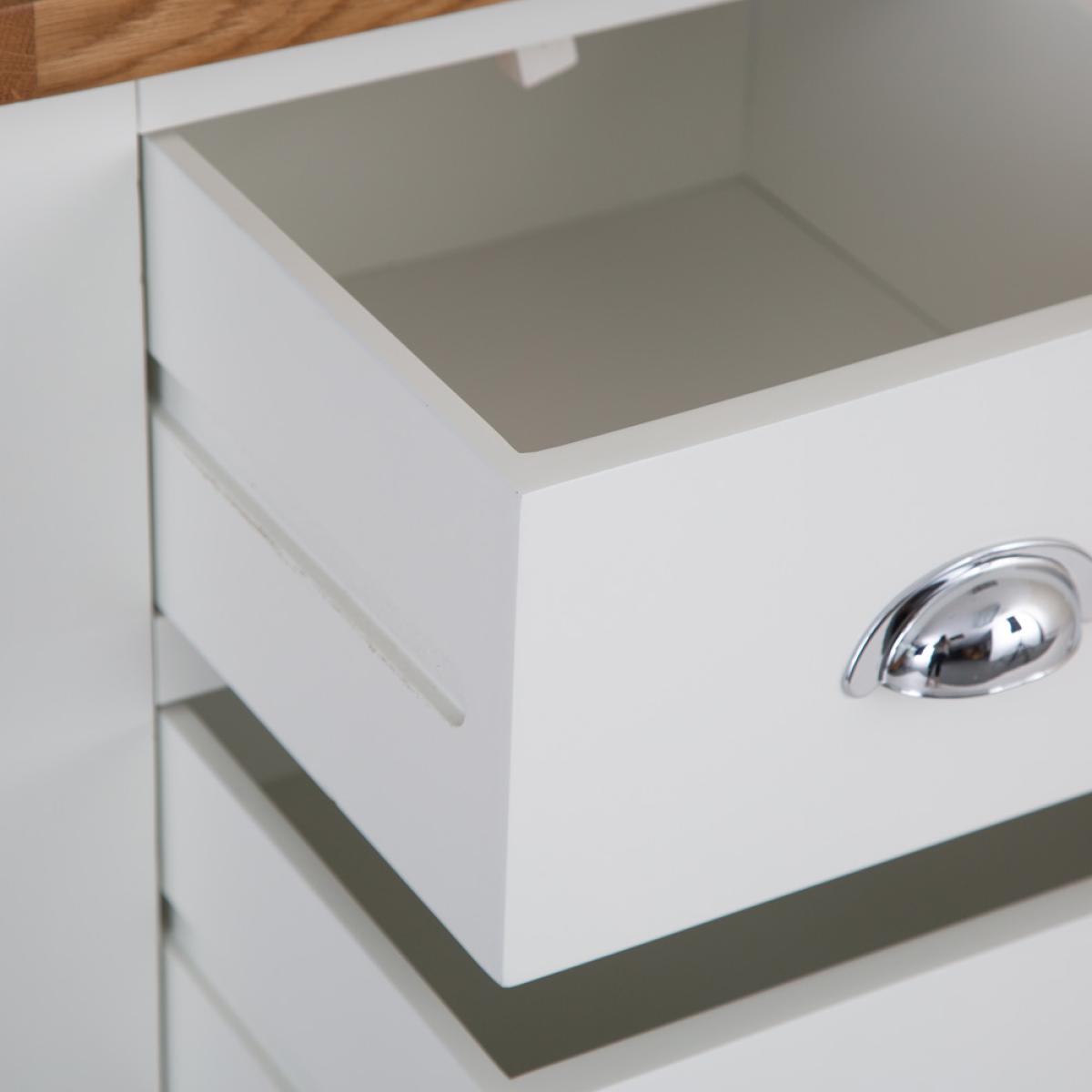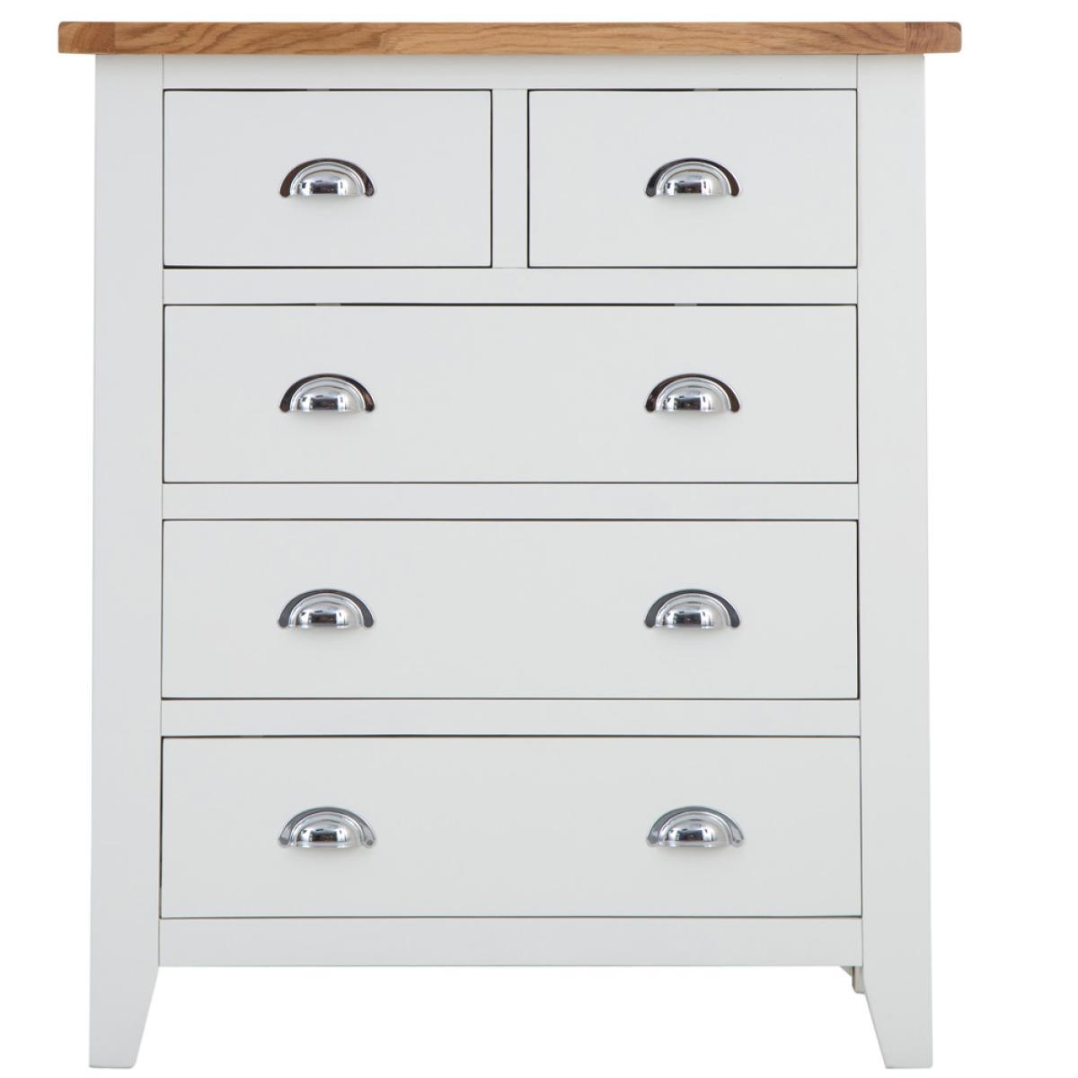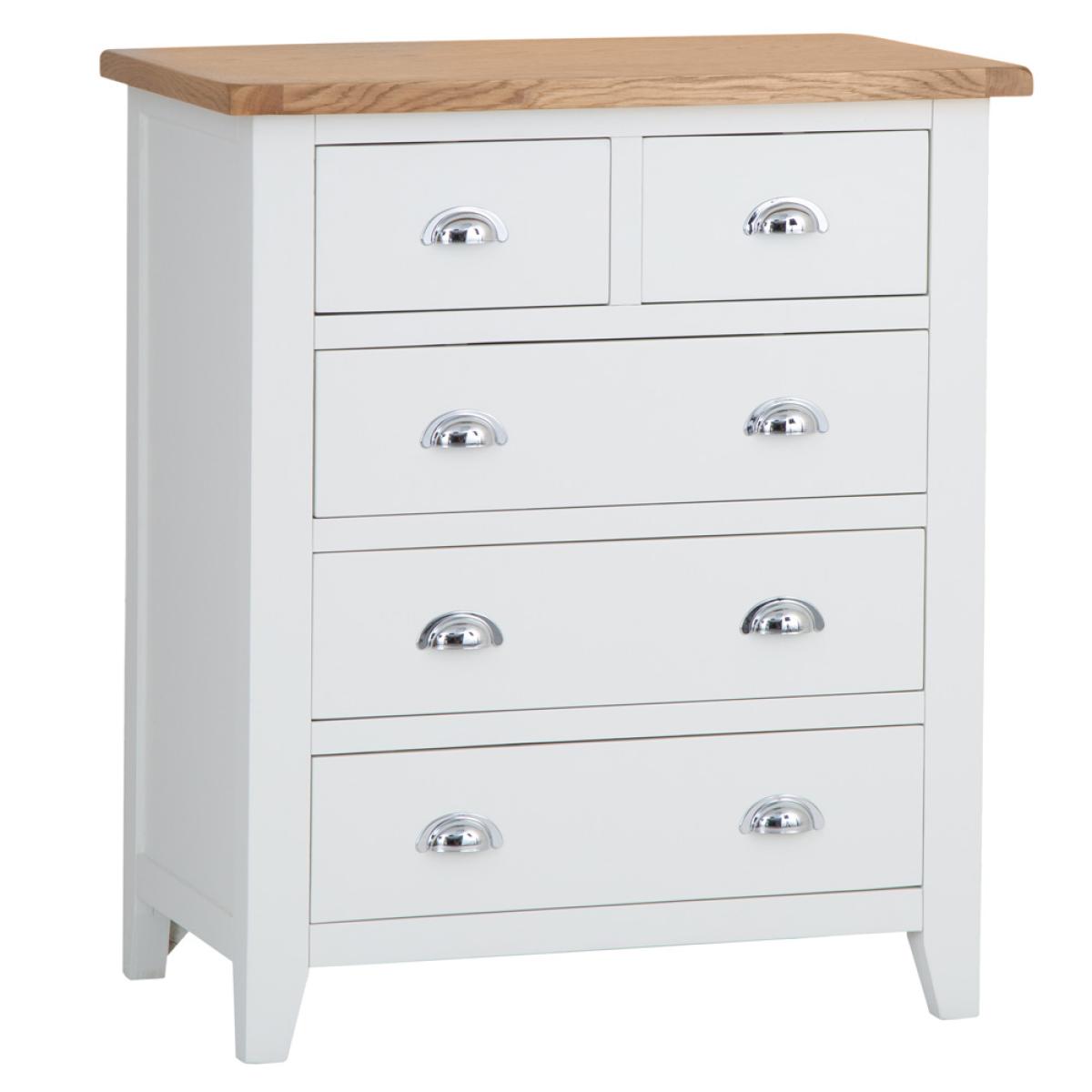 The look and feel of our new Chester White Painted Oak 2 Over 3 Chest is something we're proud of to say the least. To us this is no ordinary Chest of Drawers. It's a statement piece that works wonders in homes that love nothing but the finer things in life. If you want to enjoy artisan quality white painted finishing combined with an oak top, look no further. Everything is then brought together by the signature chrome finishing of the handles that's become the most recognisable hallmark of the Chester White Collection. Please note: This item is not pure/brilliant White. It is very slightly off white, described as 'old white'.