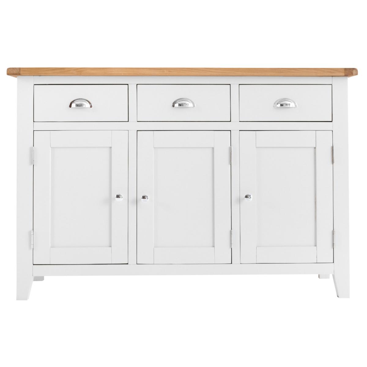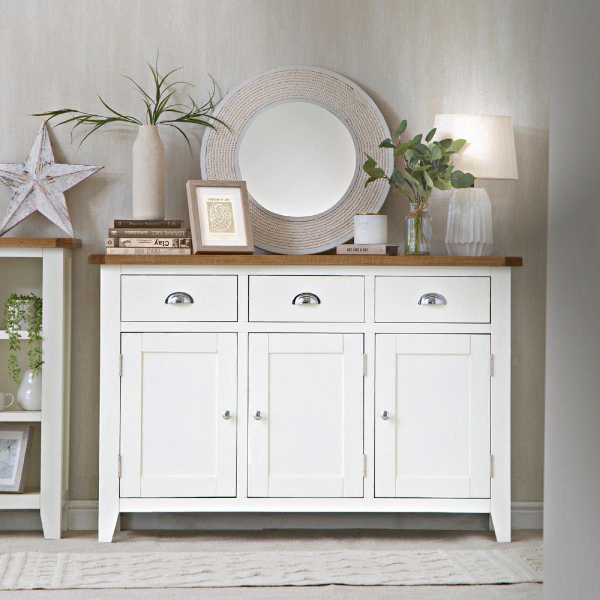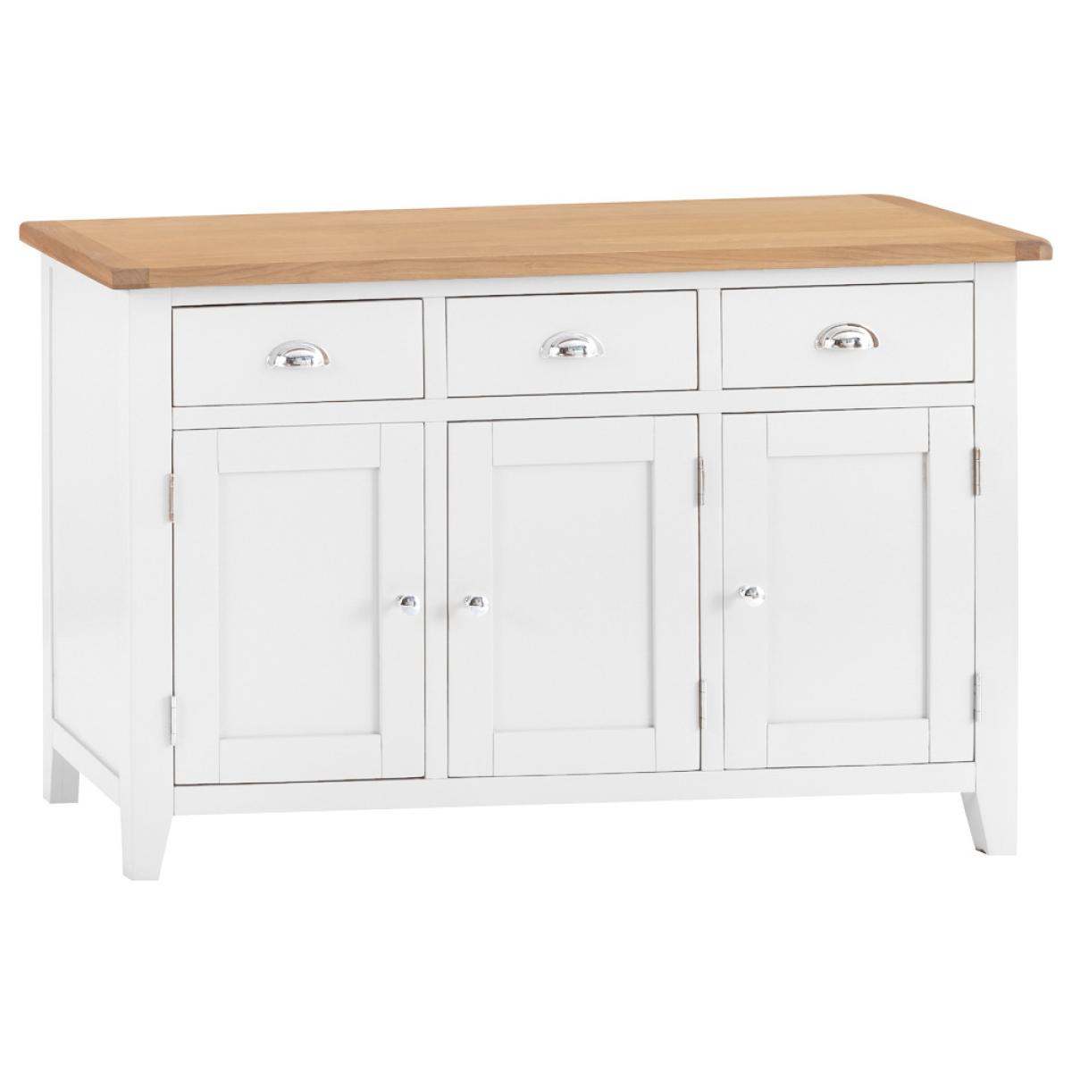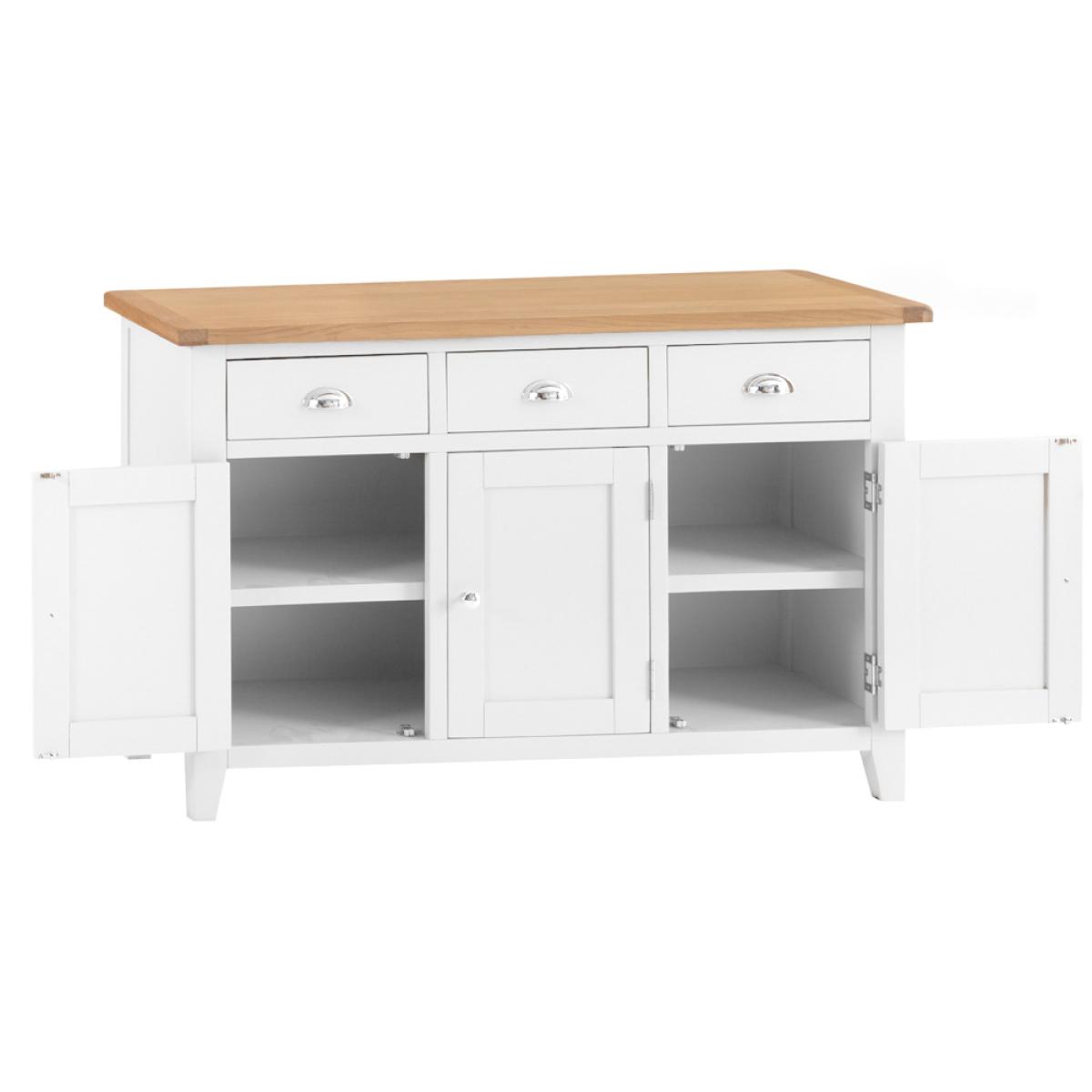 The Chester White Painted Oak 3 Door Large Sideboard is the unit of choice if you're looking to make a real statement in your Living or Dining area. Whilst there are three doors there are actually two cupboards, with one large unit behind the left and central doors and a secondary unit to the right. A shelf runs through the heart of the item, effectively creating six compartments within one functional and versatile Large Sideboard. The crisp white painted frame contrasts wonderfully with the smooth chrome cup handle and gorgeous oak top, providing a unit that's as aesthetically pleasing as it is practical. Also in the Chester White collection we have a similar alternative with a Wine Rack in place of the central door. Please note: This item is not pure/brilliant White. It is very slightly off white, described as 'old white'.