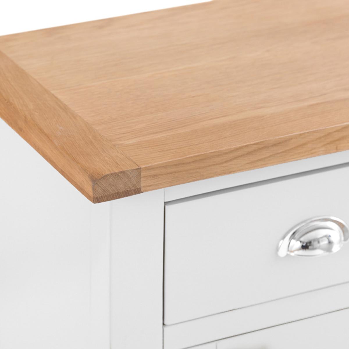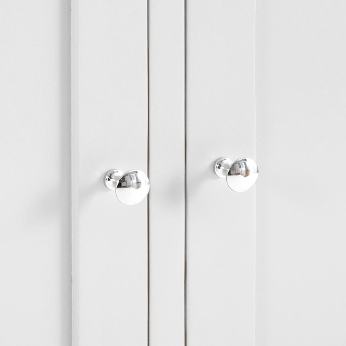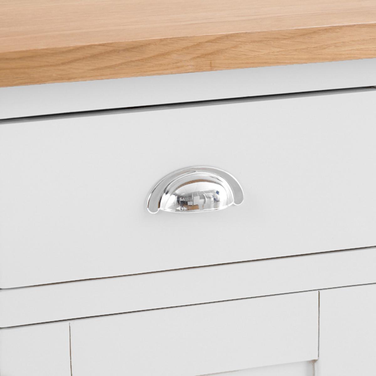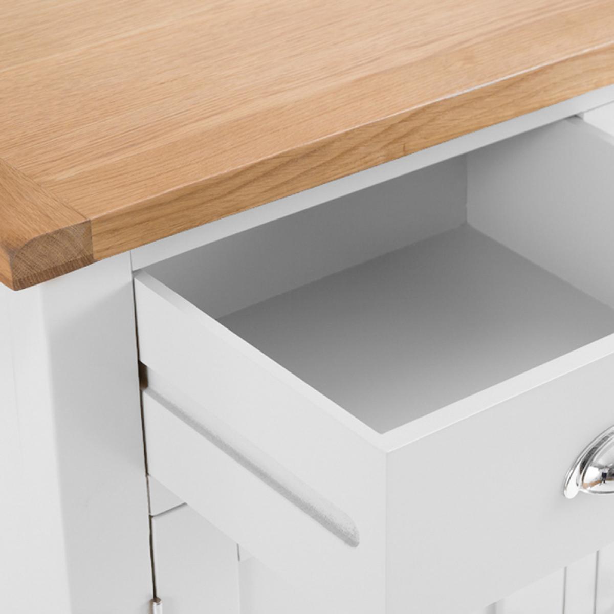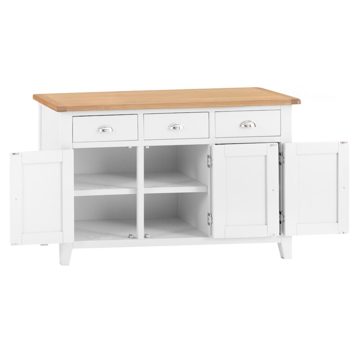 The Chester White Painted Oak 3 Door Large Sideboard is the unit of choice if you're looking to make a real statement in your Living or Dining area. Whilst there are three doors there are actually two cupboards, with one large unit behind the left and central doors and a secondary unit to the right. A shelf runs through the heart of the item, effectively creating six compartments within one functional and versatile Large Sideboard. The crisp white painted frame contrasts wonderfully with the smooth chrome cup handle and gorgeous oak top, providing a unit that's as aesthetically pleasing as it is practical. Also in the Chester White collection we have a similar alternative with a Wine Rack in place of the central door. Please note: This item is not pure/brilliant White. It is very slightly off white, described as 'old white'.