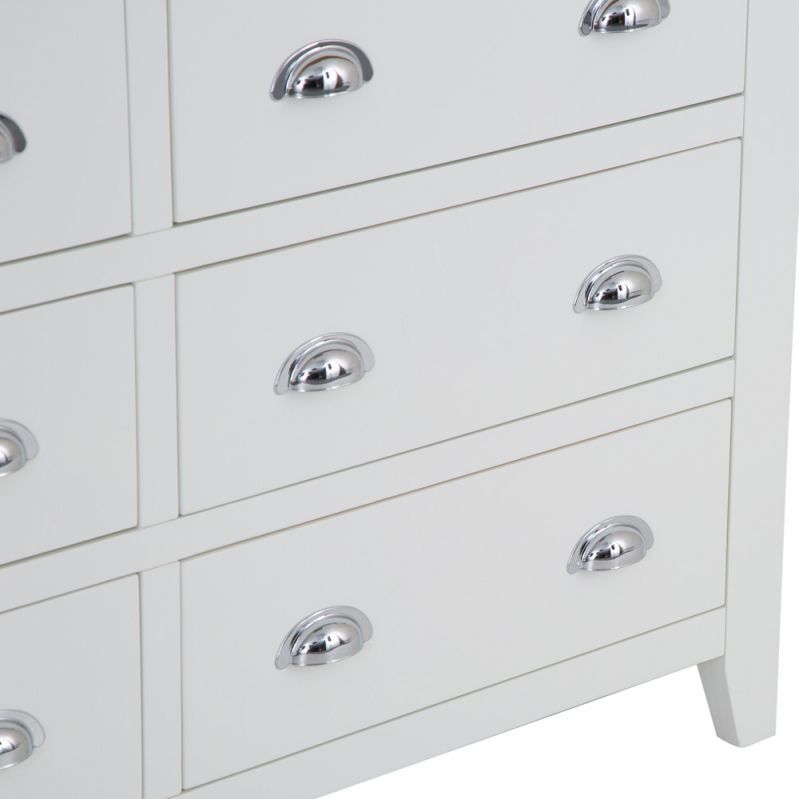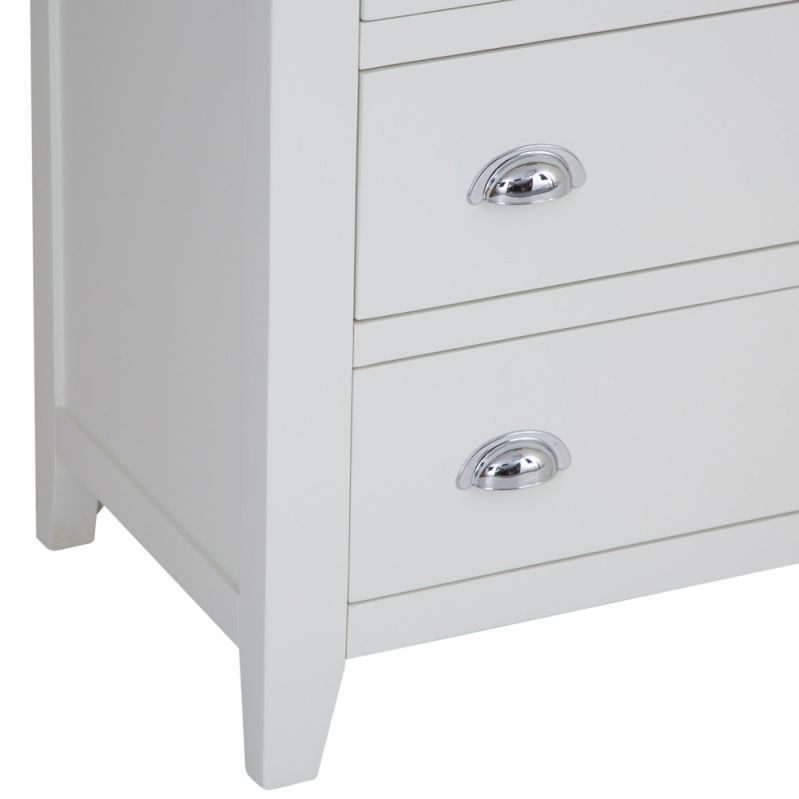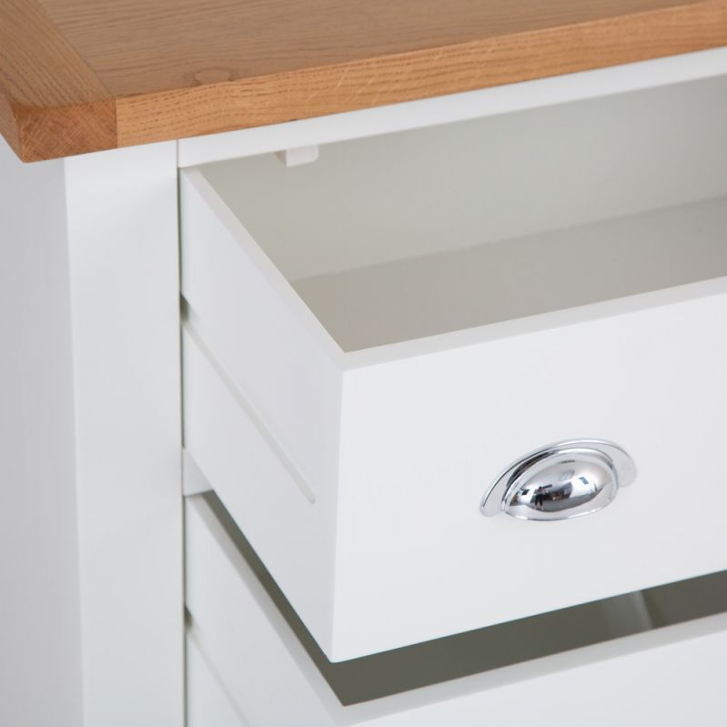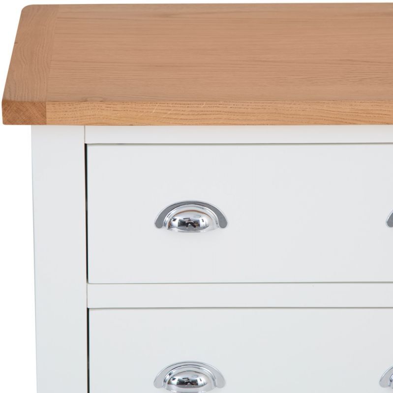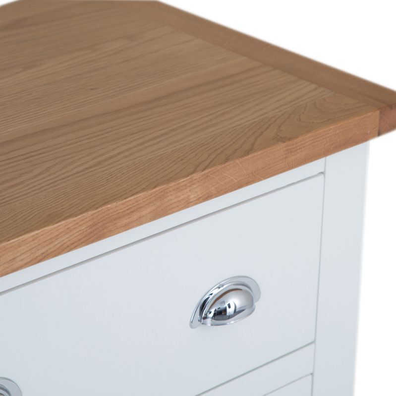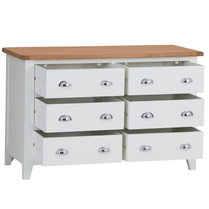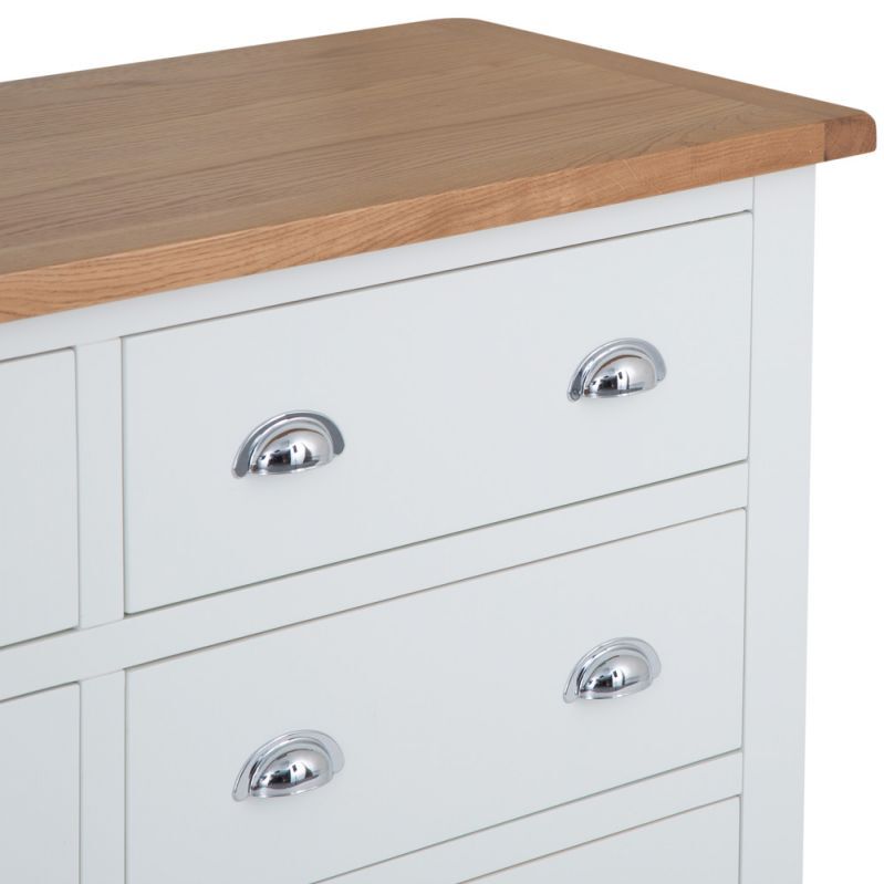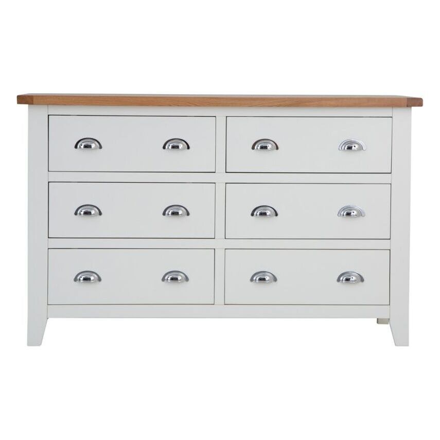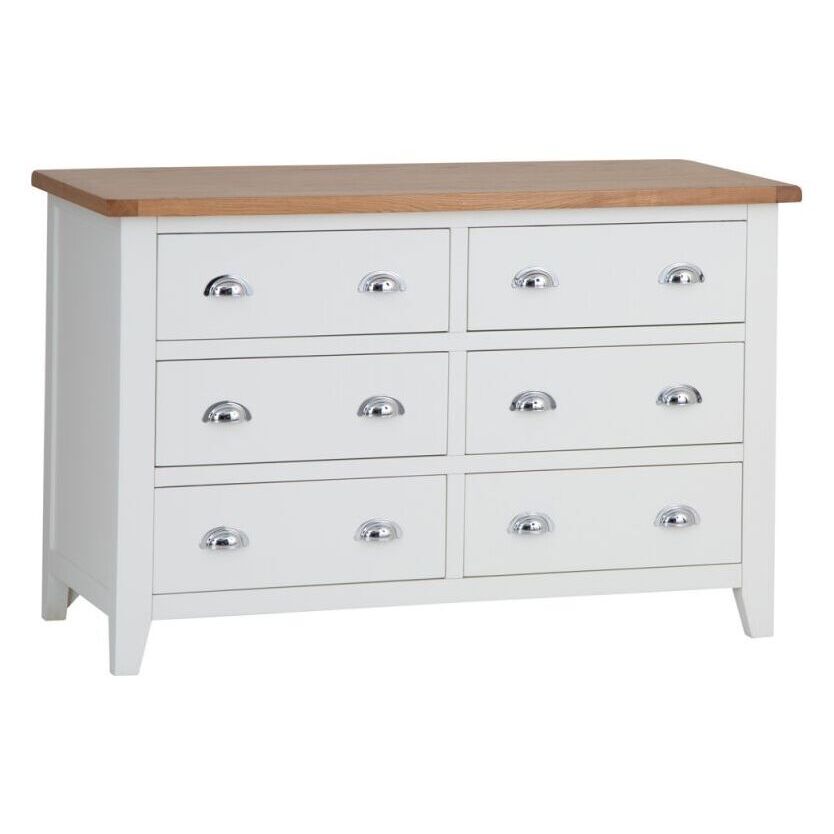 Combining style and substance in perfect harmony is what the Chester White Painted Oak 6 Drawer Chest does best. The authentic style is a tribute to the artisan craftsmanship of authentic farmhouse style furniture, whilst the chrome finish of the cupped handles adds an unexpected contemporary twist. When you then add the oak top to the mix you get to enjoy a Chest of Drawers that will transform the look of any bedroom in an instant. With our 2-man delivery we'll take it straight to the master bedroom, which will give you even more time to make the other additions to your new interior design project.
