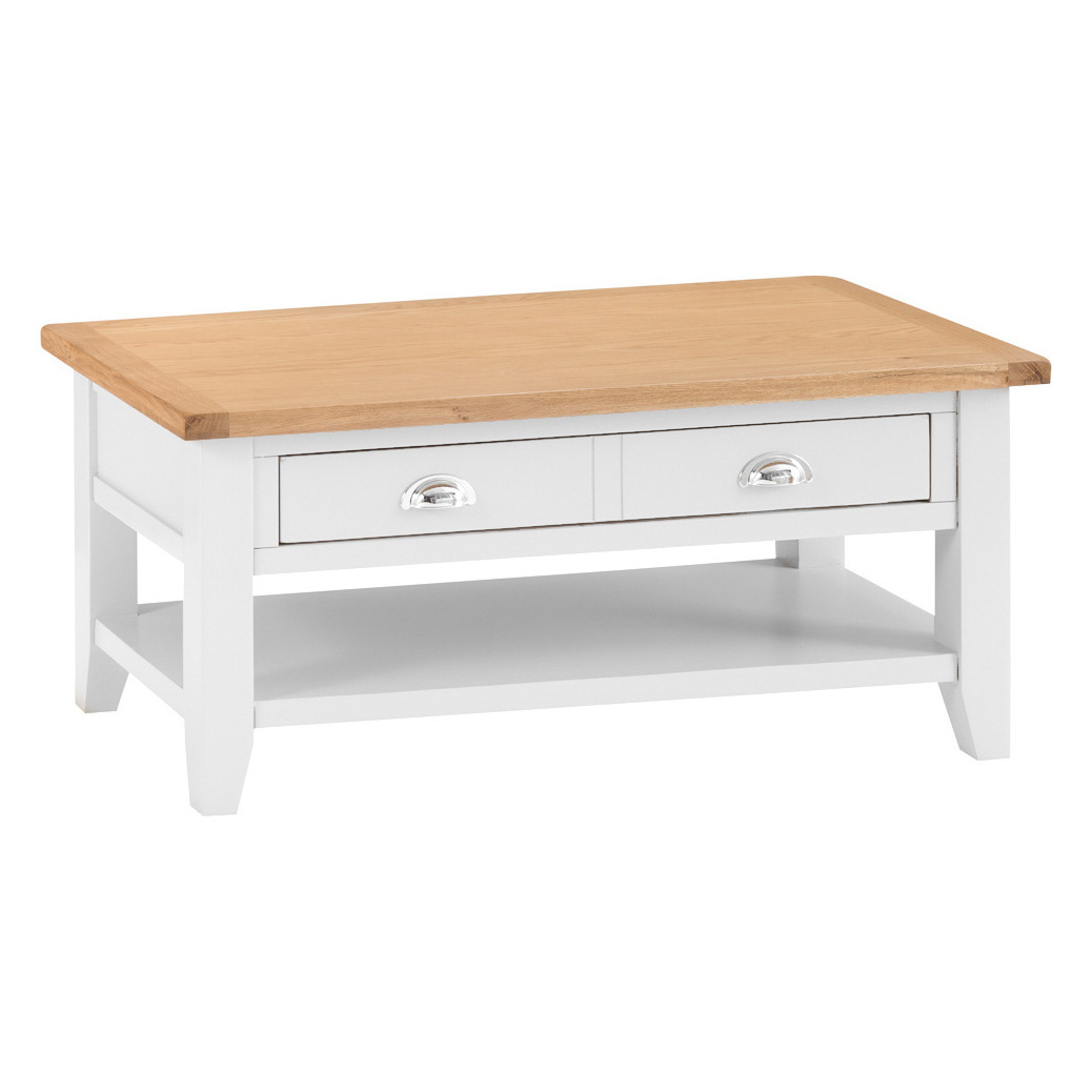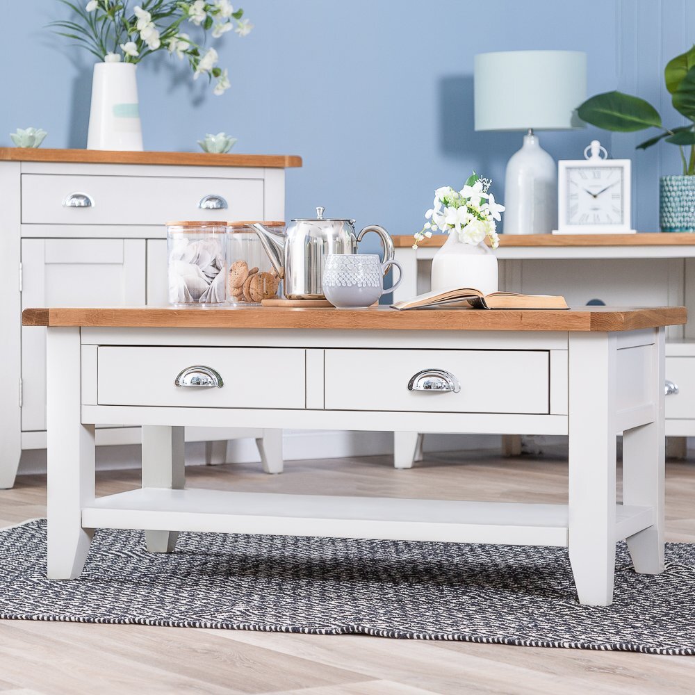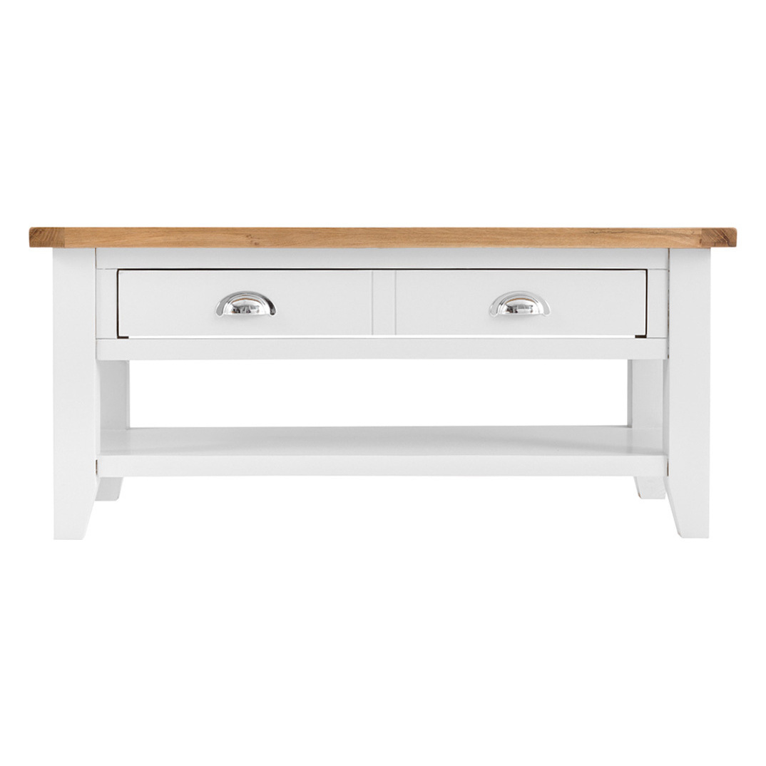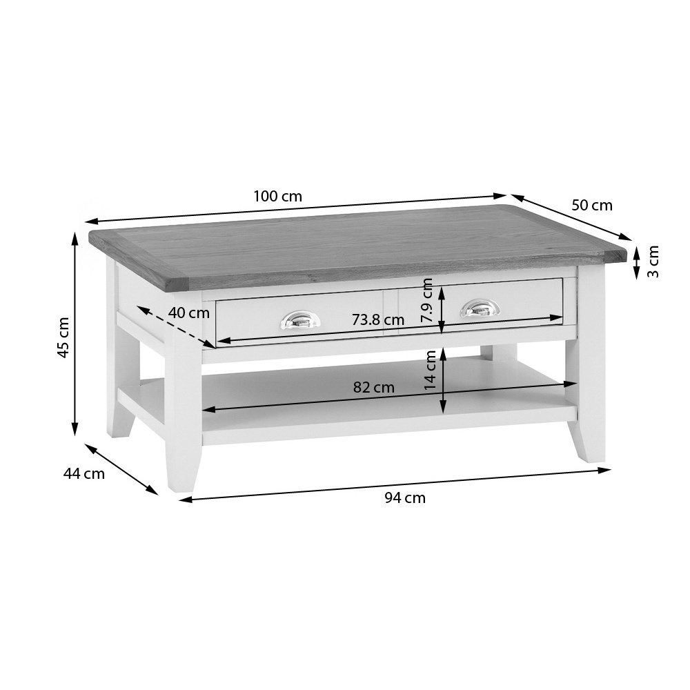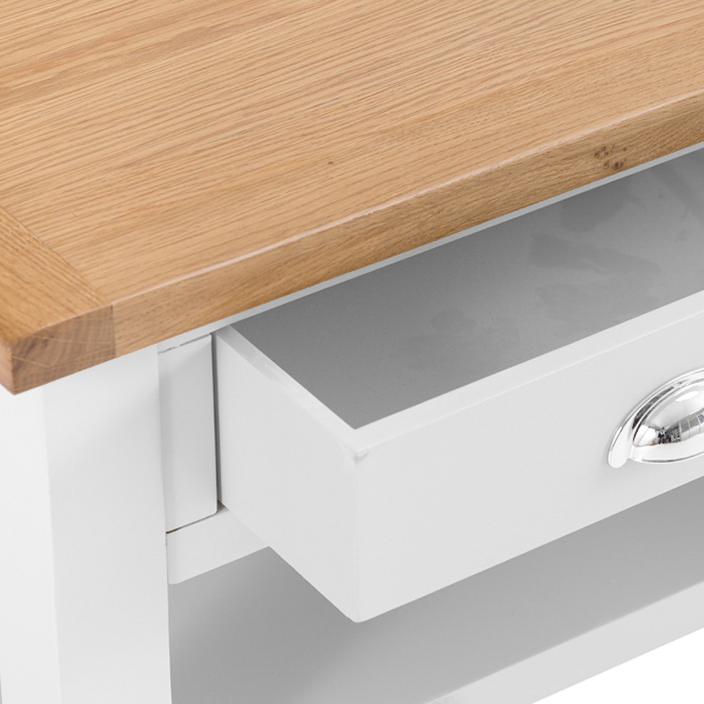 A Living Room essential for most, a Coffee Table is the focal point of any Living space and often it's the starting point for a style transformation. If you're looking for a distinct country, farmhouse look then what better way to start than with a Chester White Painted Oak Coffee Table With Drawers? A functional and practical unit, the beauty extends beyond the strikingly gorgeous aesthetics, with a large shelf beneath one single drawer that pushes out in either direction for maximum convenience. On a budget? There is a smaller drawer-less Coffee Table within the Chester White Collection. It would be remiss of us not to mention the splendid contrast between the oak top, crisp white painted frame and rounded chrome handle. Please note: This item is not pure/brilliant White. It is very slightly off white, described as 'old white'.