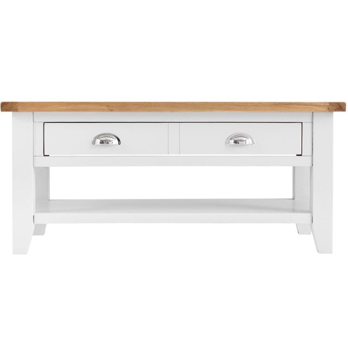 To transform your living space into a cosy spot where you can enjoy a hot drink (with biscuits, of course), add the Chester white painted oak coffee table with drawers. Tucked in close to your comfiest sofa or squashiest armchair, this durable coffee table is a great place to set down your favourite mug. The gleaming oak top surface catches the eye instantly, and is beautifully offset by the subtle white finish. Store all your coffee time bits and bobs – like magazines and spare coasters – in the dovetailed drawer. The 93cm-wide lower shelf looks especially appealing dressed up with a wicker basket or two. Please note:This item is not pure/brilliant White. It is an off-white, described as 'old white'.