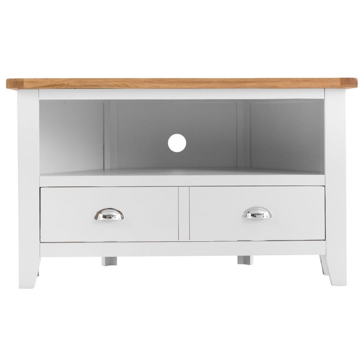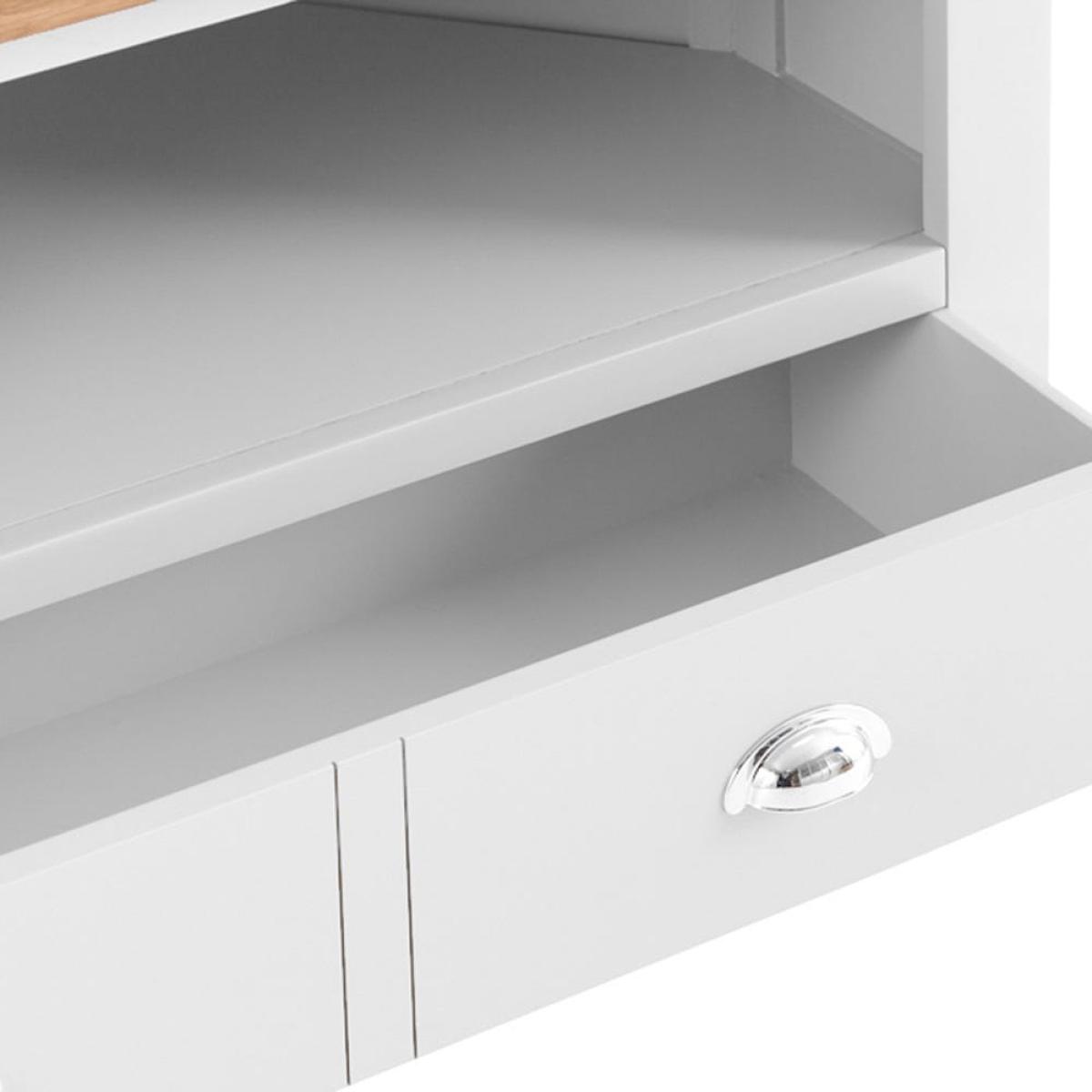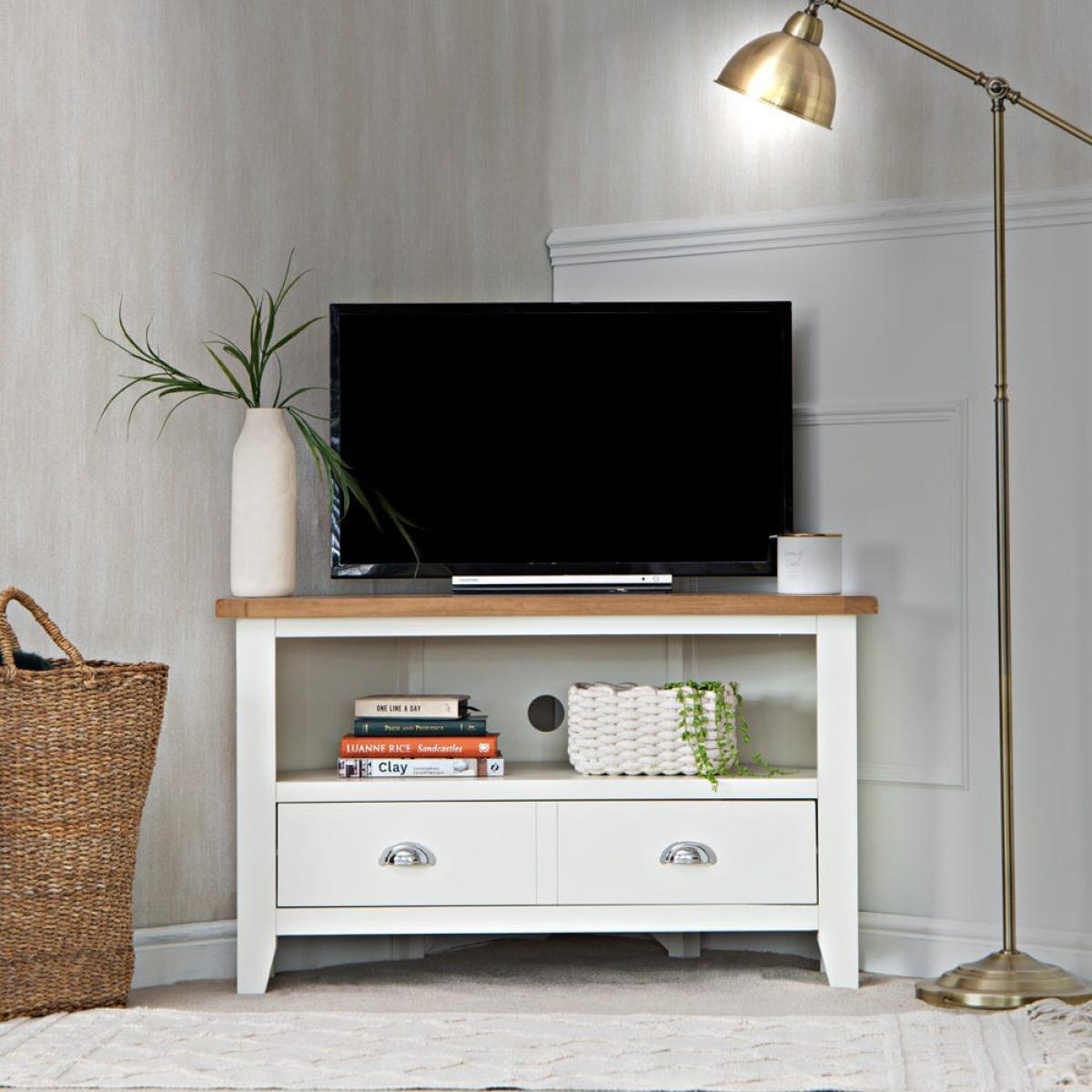 The Chester white painted oak corner TV unit arrives fully assembled and ready to enhance your living space. Creating a natural focal point on which to place your TV, this corner-shaped unit is practical as well as eye-catching. The lower shelf is 21. 5cm high, so you’ll have room to spare for games consoles or a sound bar. Use the hole at the back to hide messy cables from view, and store your prized Blu-ray collection in the deep drawer beneath the shelf. Modern touches like chrome cup handles combine brilliantly with the natural oak top for a timeless aesthetic. Please note: This item is not pure/brilliant White. It is an off-white, described as 'old white'.