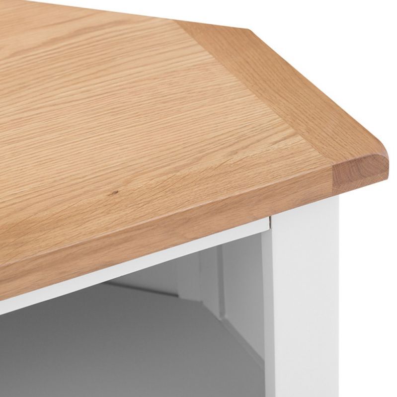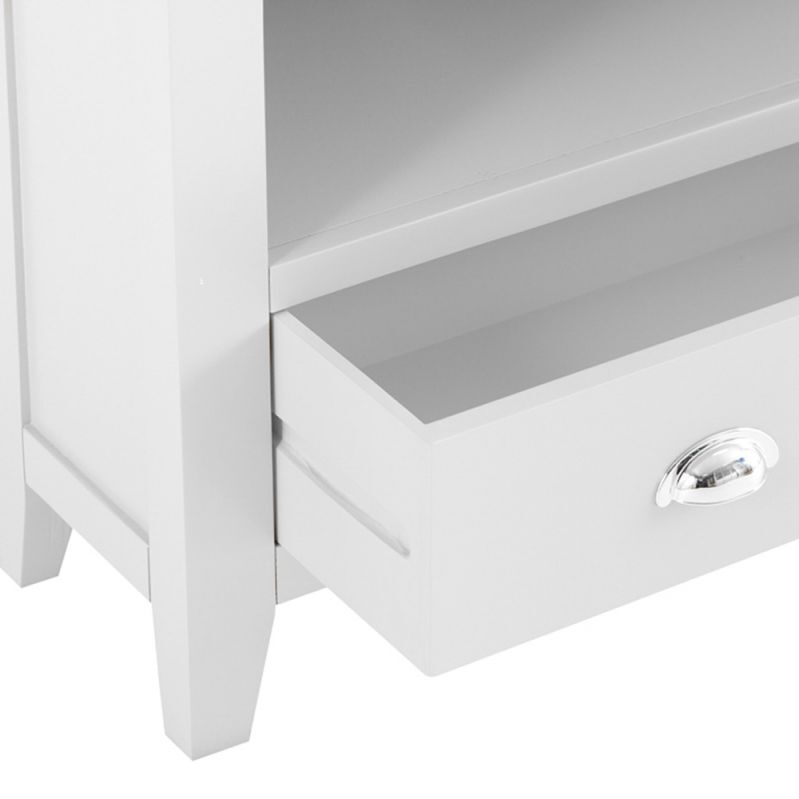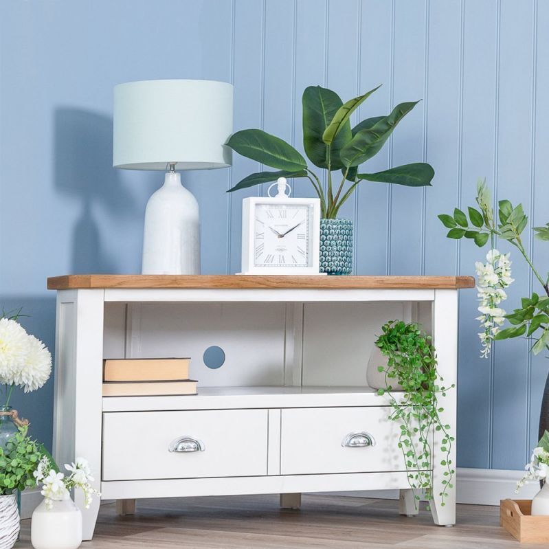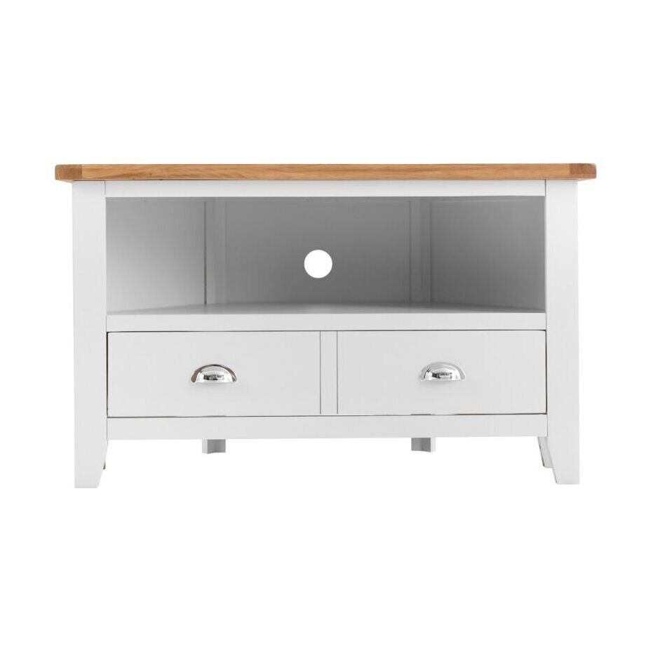 Having a TV in the Corner of a room is often born out of necessity, if the TV point is in the Corner for example. Sometimes however it's a style choice as having the TV in the corner of the room allows for a clear view from almost any direction, creating a natural focal point. Whether it's enforced or by choice, don't worry, we've got it covered! The Chester White Painted Oak Corner TV Unit is a super-stylish blend of the contemporary and traditional. Made to fit in a 90 degree angle, this fabulous Corner TV Stand features open shelving space to host digital TV boxes, games consoles or anything else we've missed. The large full-length drawer beneath is dovetailed and is perfect for keeping DVD's and other prized possessions away from the eyes of little people! The crisp white painted frame contrasts wonderfully with the smooth chrome cup handle and gorgeous oak top, providing a unit that's as aesthetically pleasing as it is practical. There are also other standard TV Cabinets within the Chester White collection if having the TV in the corner of the room isn't important to you. Please note: This item is not pure/brilliant White. It is very slightly off white, described as 'old white'.
