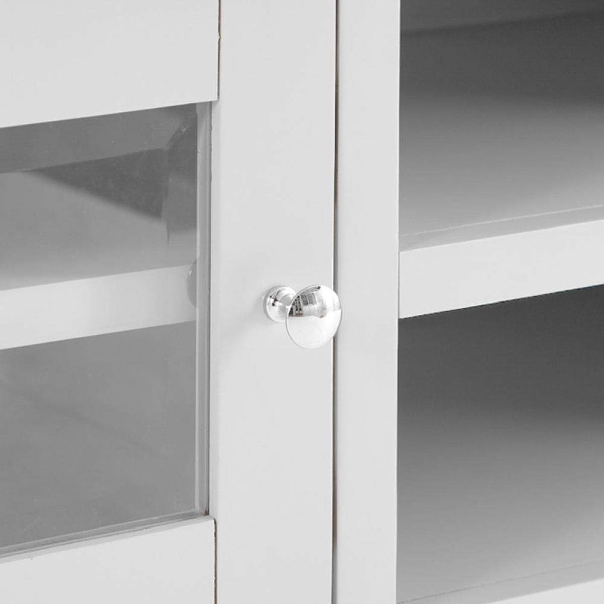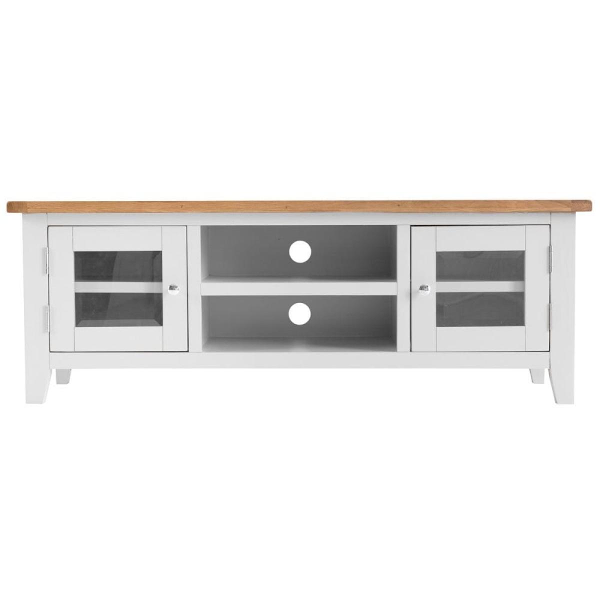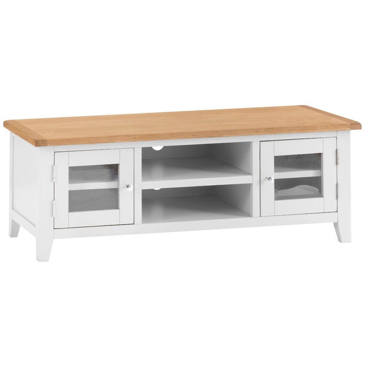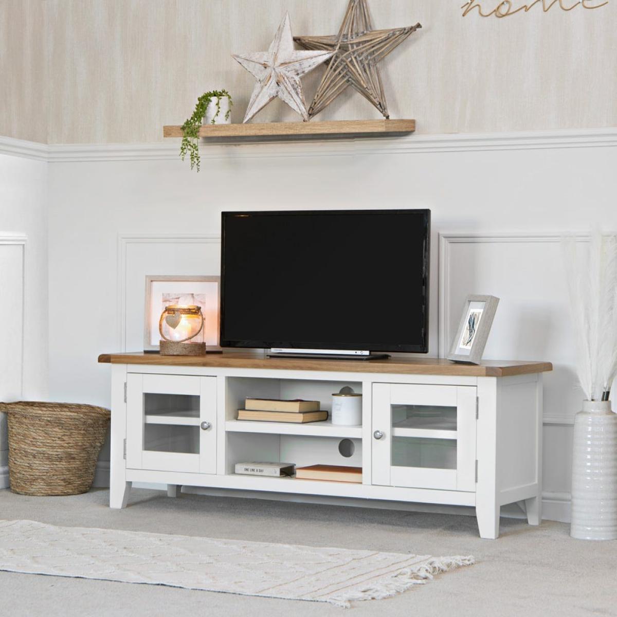 If you’re looking for a grand way to display your TV, try placing it on top of the Chester white painted oak large TV unit. With its generous 140cm width, this robust rustic unit has room for both your TV and plenty of ornaments to further decorate your living space. Bookend your gogglebox with a few framed family photos and an elegant vase. The two shelves in the centre provide an ideal cubby for sound systems, games consoles – and pop any cables through the holes in the back to keep things looking tidy. Stack the twin shelved glass cabinets with books and Blu-rays. Please note: This item is not pure/brilliant White. It is an off-white, described as 'old white'.