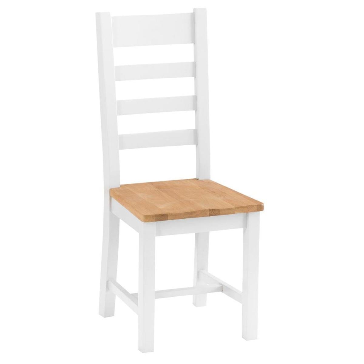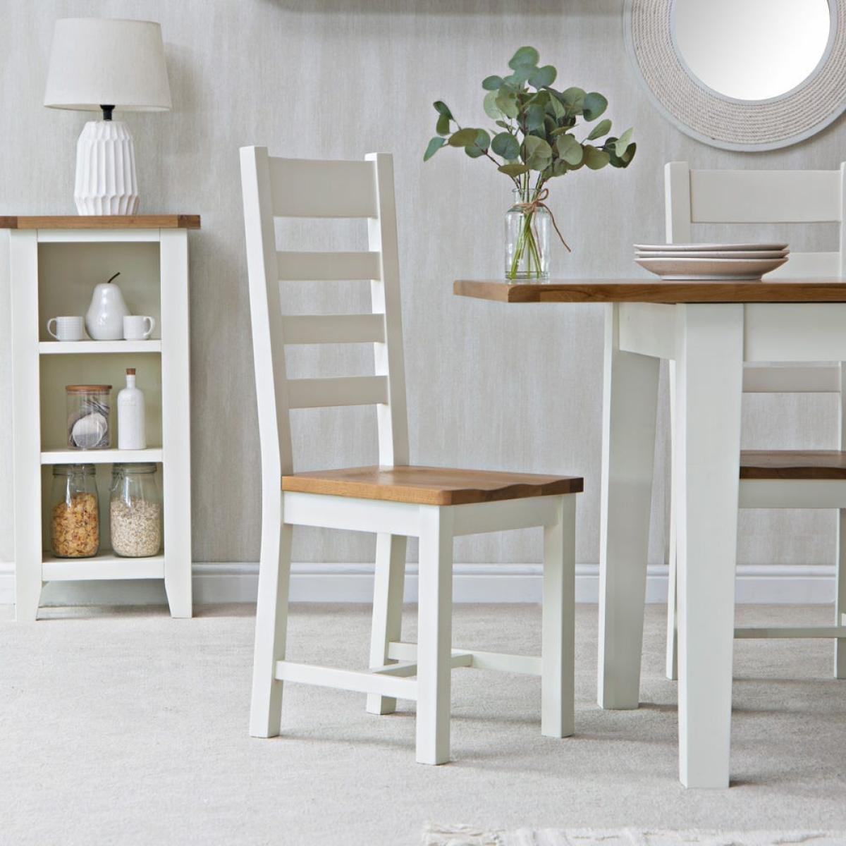 Dining in never felt so fancy with the Chester white painted oak slat back dining chair with wooden seat placed around the dining table. Every inch of this dining chair oozes rustic style, from its traditional ladder-back design to the chunky straight lines of its legs. All this is accentuated by the clever contrast between the striking oak seat and crisp white painted frame. These slat back dining chairs are a beautiful fusion of contemporary and classic. From that first cup of tea in the morning to your next dinner party with friends, these chairs help your dining space look the part. Please note:This item is not pure/brilliant White. It is an off-white, described as 'old white'.