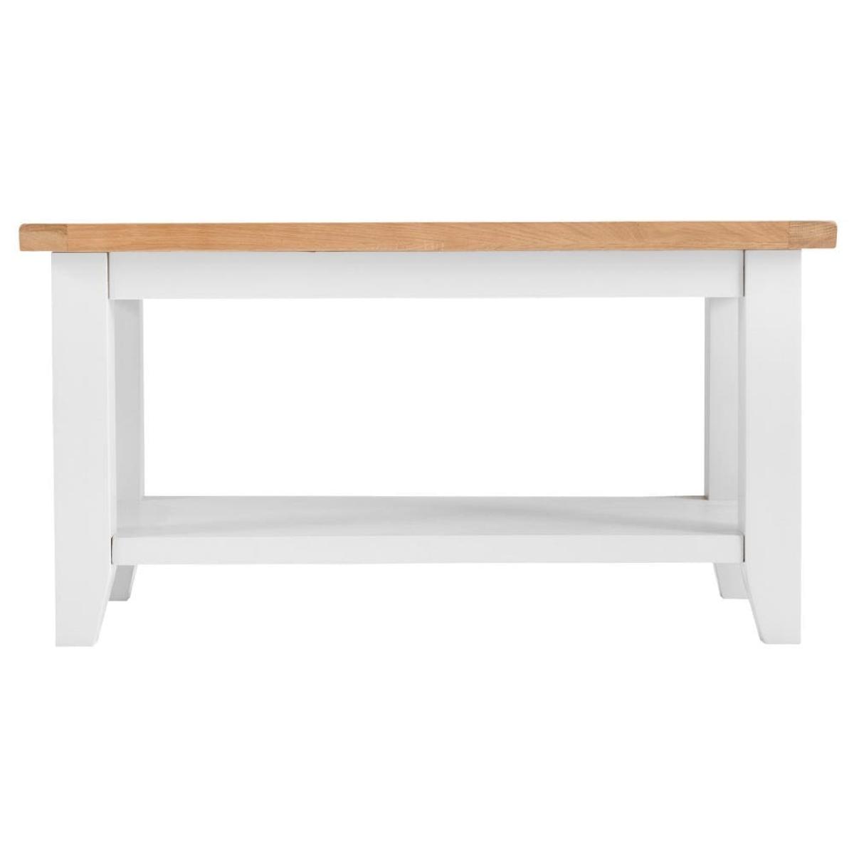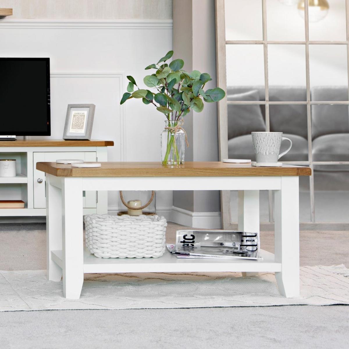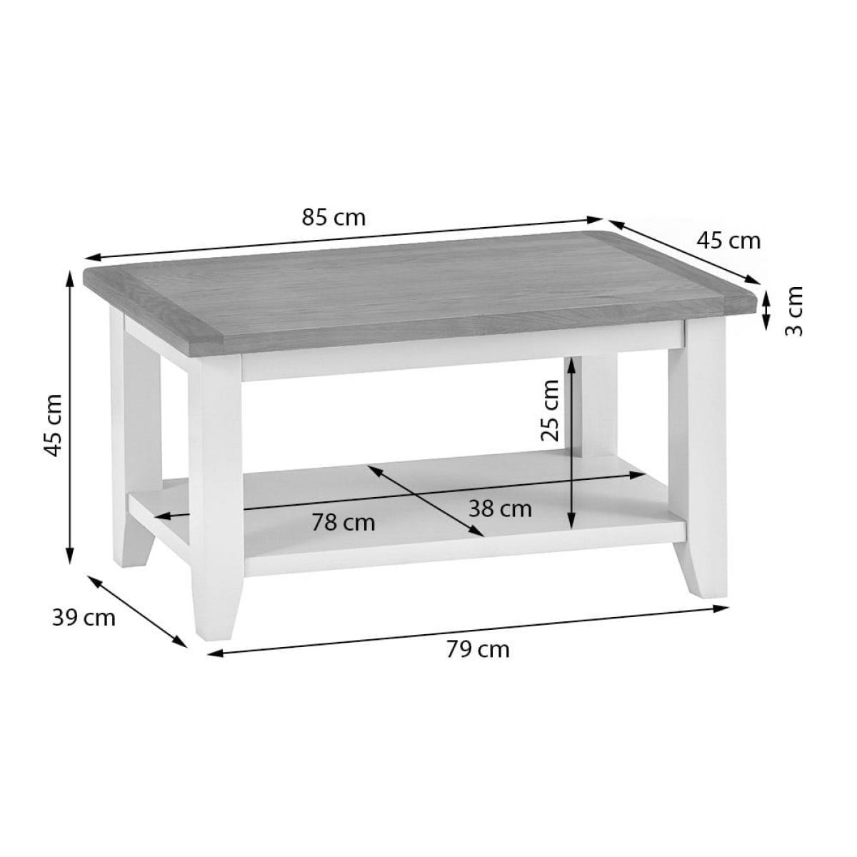 Time to snuggle up and enjoy a cup of something warm and cosy, all whilst sitting around the Chester white painted oak small coffee table. Its thick, square-legged farmhouse style frame supports a smooth top surface with a natural oak look. Finished in dazzling white – hand painted for true artisan quality – this 85cm long coffee table adds homeliness to most styles of interiors with its countryside-meets-contemporary aesthetic. Spread the top with your favourite coasters and a potted plant to breathe fresh air into your living space. Find a home for all your coffee time reading materials on the handy lower shelf. Please note:This item is not pure/brilliant White. It is an off-white, described as 'old white'.