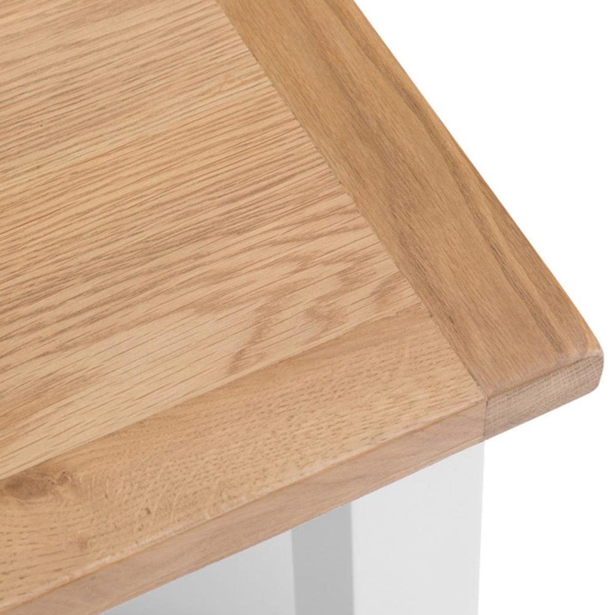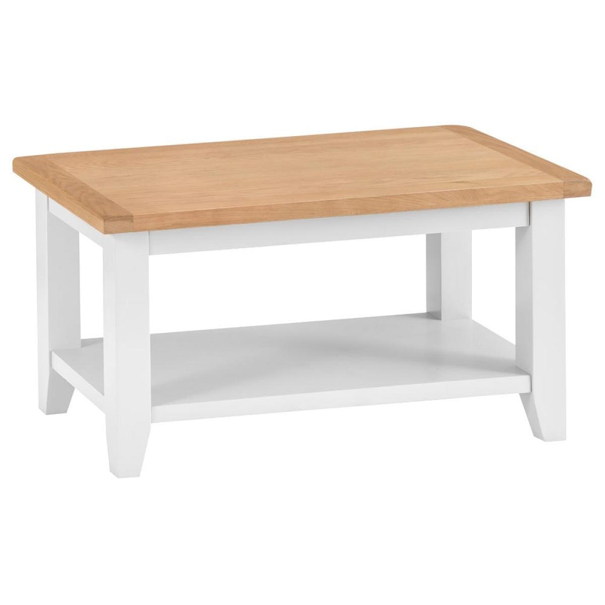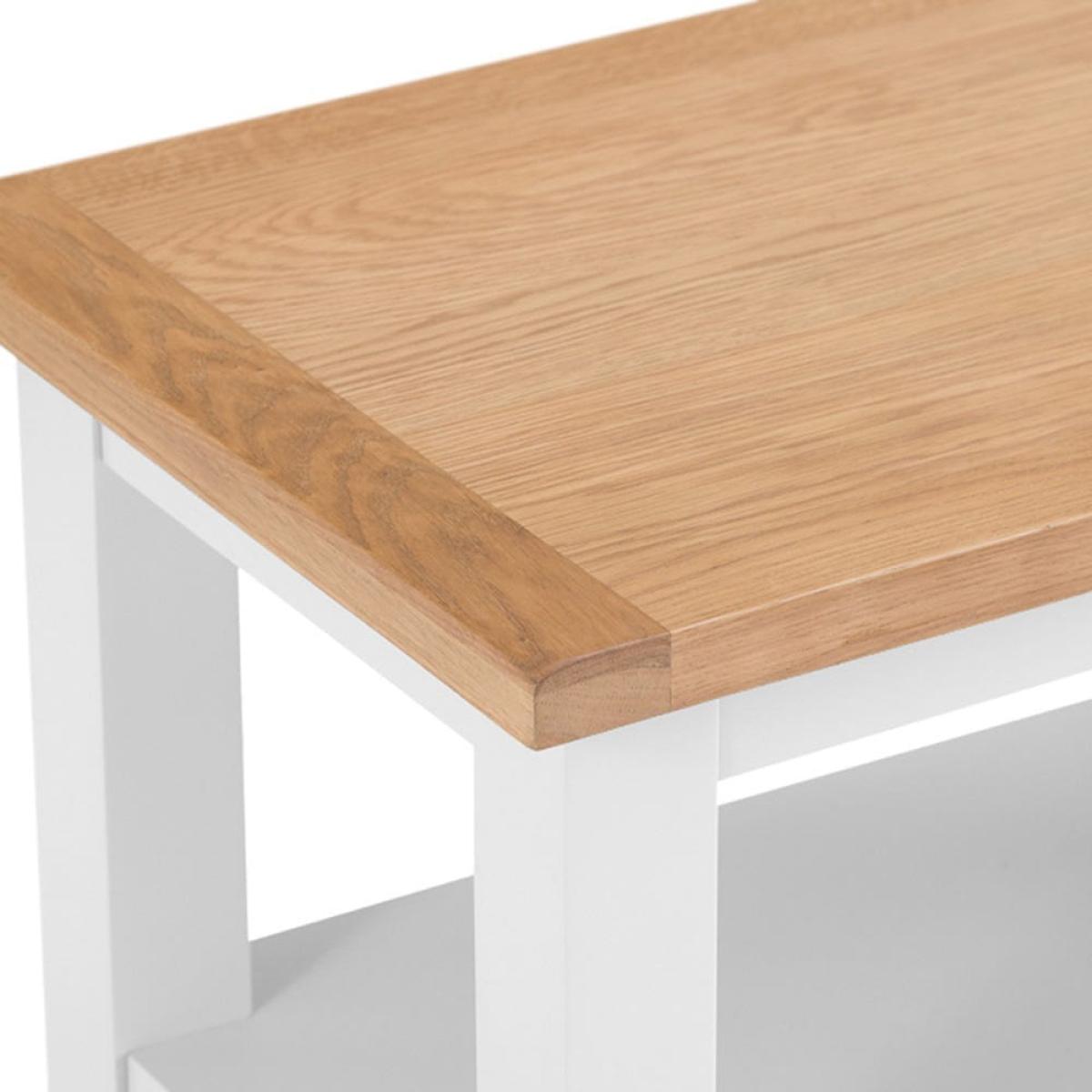 Time to snuggle up and enjoy a cup of something warm and cosy, all whilst sitting around the Chester white painted oak small coffee table. Its thick, square-legged farmhouse style frame supports a smooth top surface with a natural oak look. Finished in dazzling white – hand painted for true artisan quality – this 85cm long coffee table adds homeliness to most styles of interiors with its countryside-meets-contemporary aesthetic. Spread the top with your favourite coasters and a potted plant to breathe fresh air into your living space. Find a home for all your coffee time reading materials on the handy lower shelf. Please note:This item is not pure/brilliant White. It is an off-white, described as 'old white'.