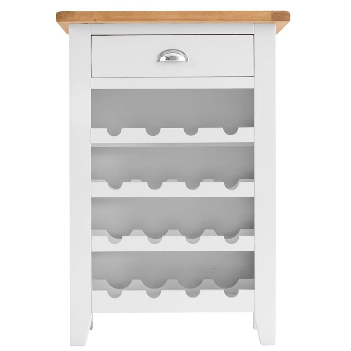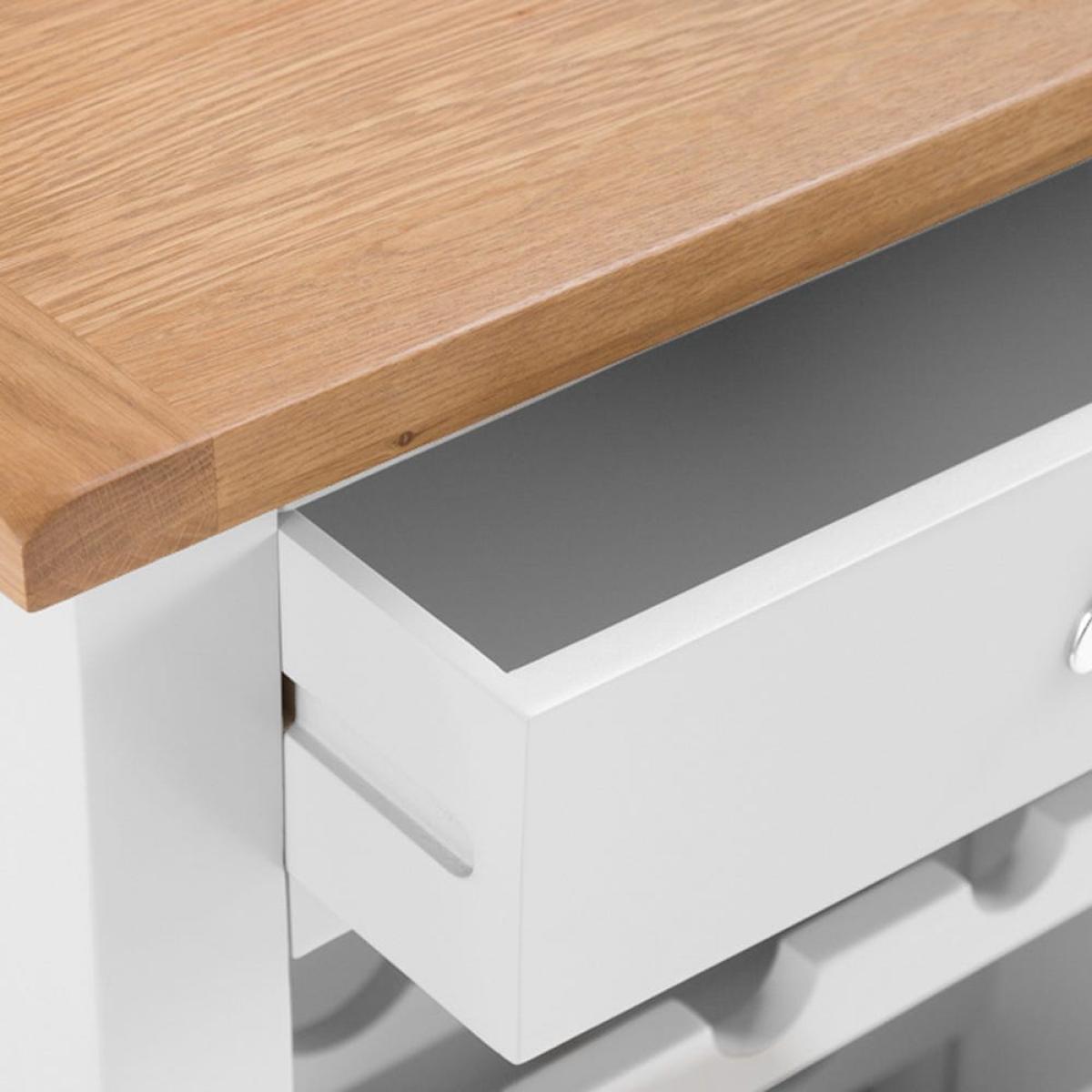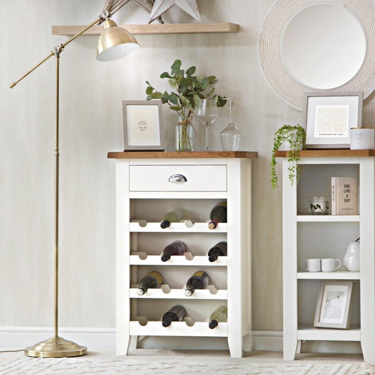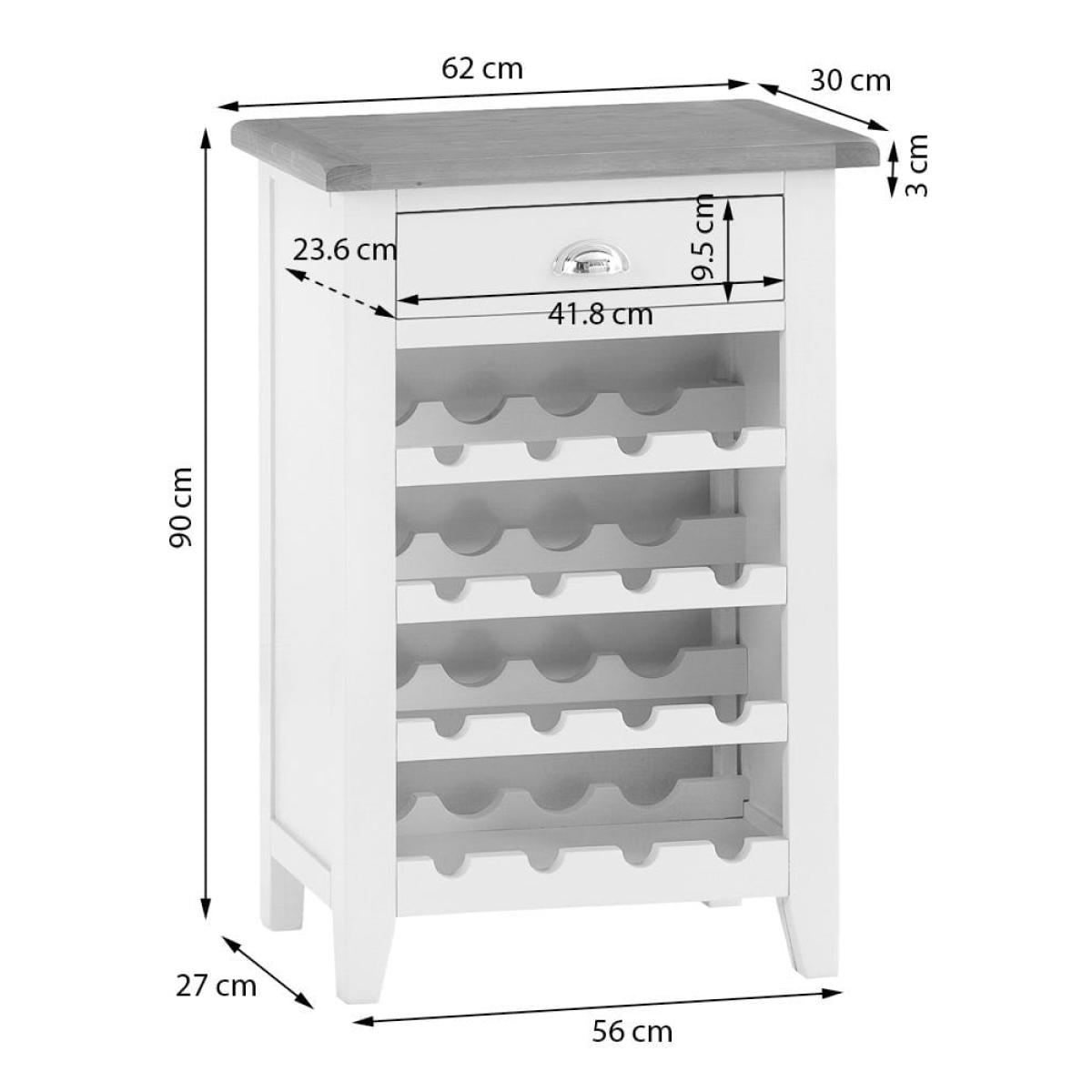 If you often find yourself hosting everyone, the Chester white painted oak wine cabinet is here to help. It’s a cabinet for all interiors, with its blend of modern features like the chrome handles accentuated by the solid farmhouse frame. Able to hold 16 wine bottles, there’s a space for all your finest reds, whites and everything in between on this luxurious white painted wine cabinet. The expertly dovetailed drawer is a handy cubby for corkscrews and wine stoppers. Stack the sleek oak top surface with jugs and glasses to keep everyone topped up the whole night through. Please note:This item is not pure/brilliant White. It is an off-white, described as 'old white'.