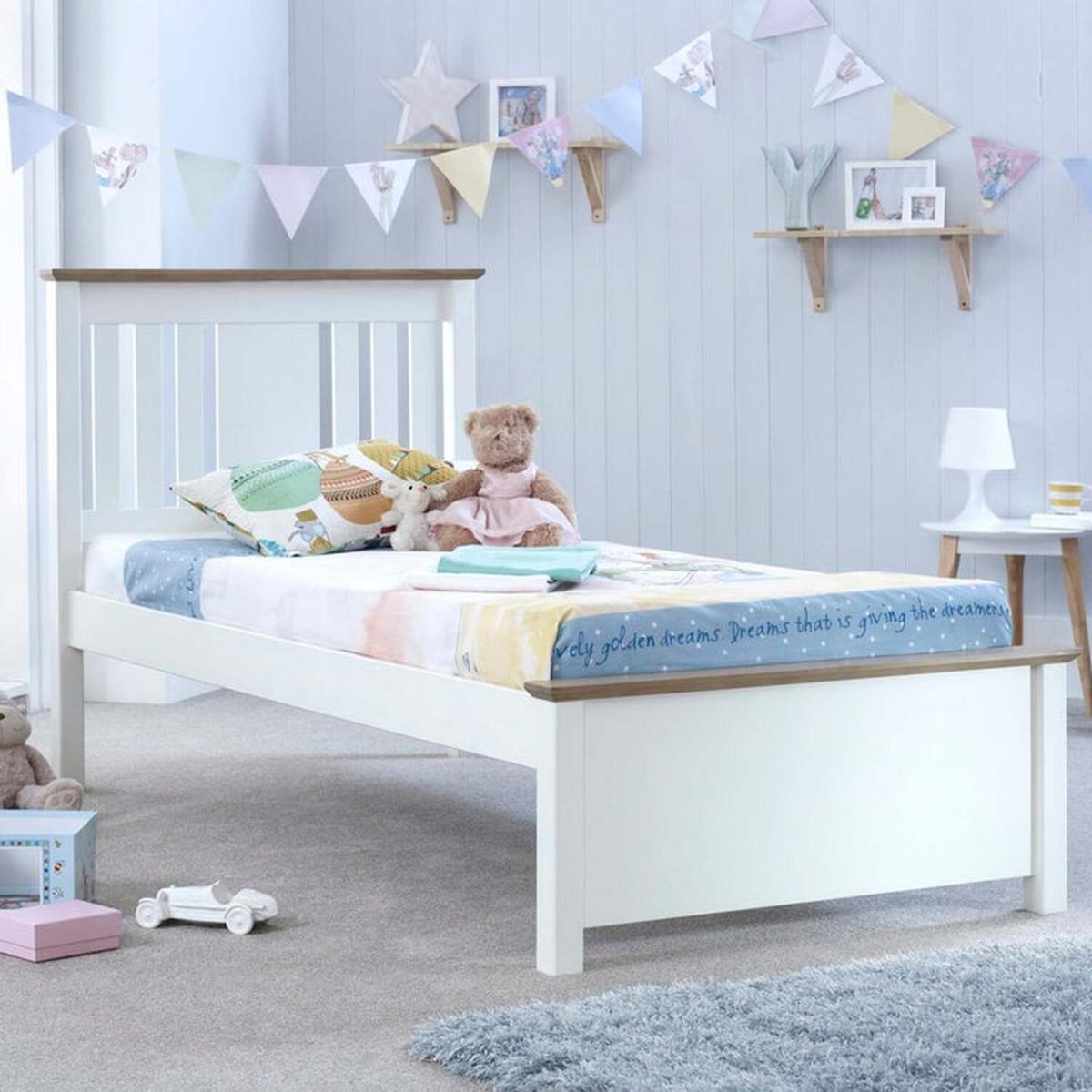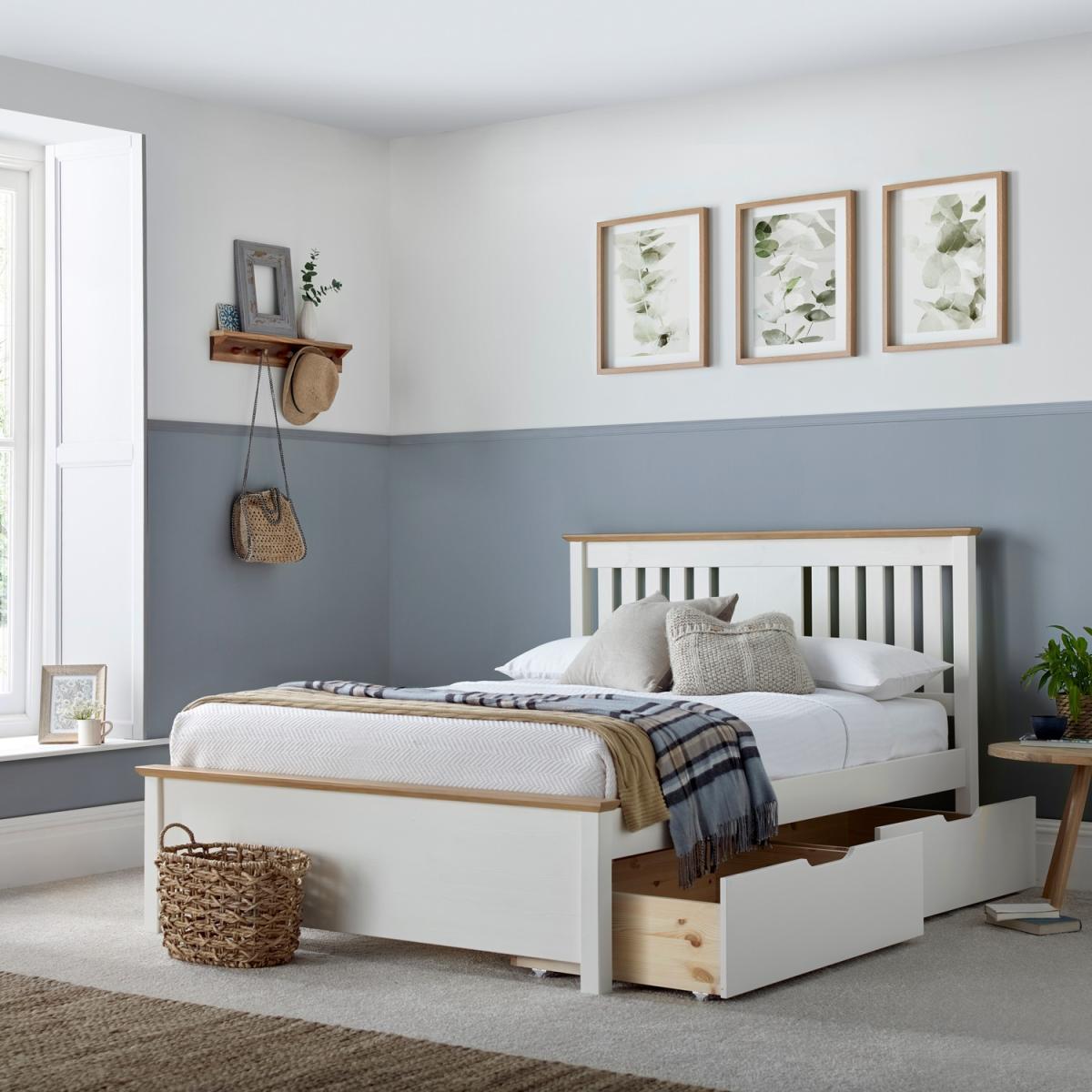 The Chester is a beautifully simple stone white and oak bedframe. The low footend allows access to the bed from three sides. There is plenty of storage space under this bed and can be bought with additional storage drawers. The Single bedframe accommodates 2 drawers while the Double can accommodate up to 4 drawers. Please select the 2 Drawer or 4 Drawer version for drawers. The drawers are on wheels so can be used either side of the bed. Overall a very versatile bed.