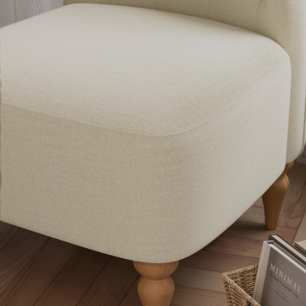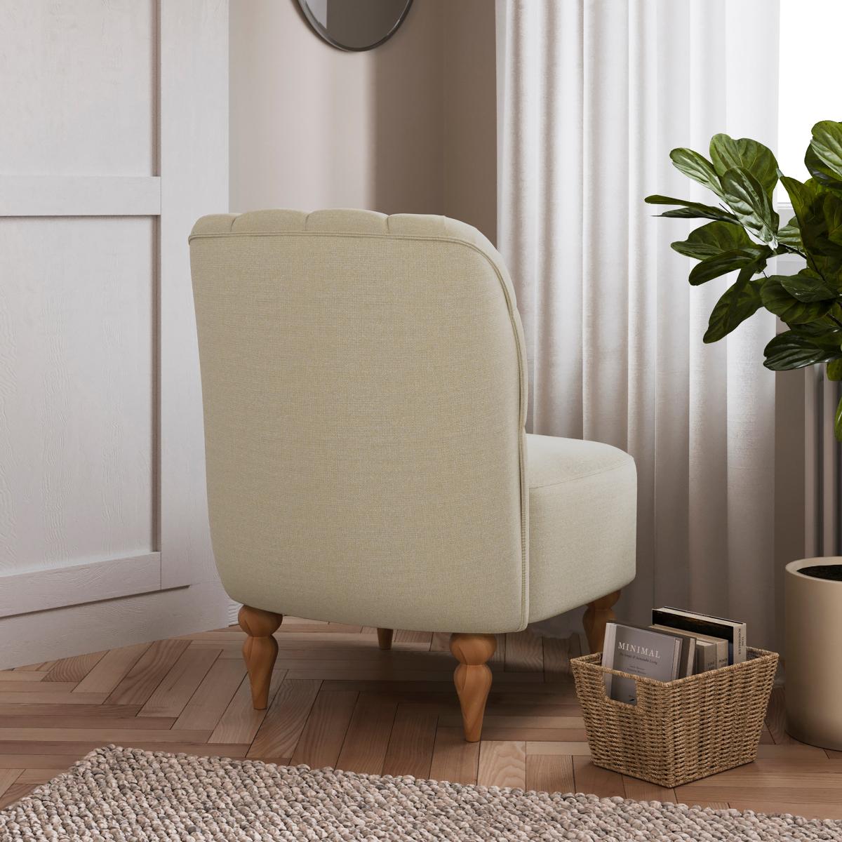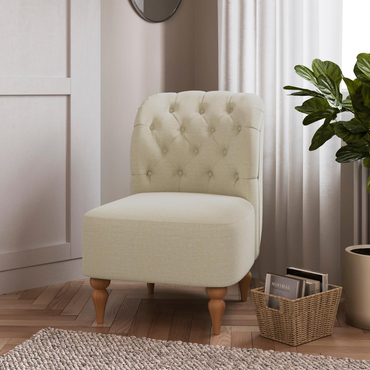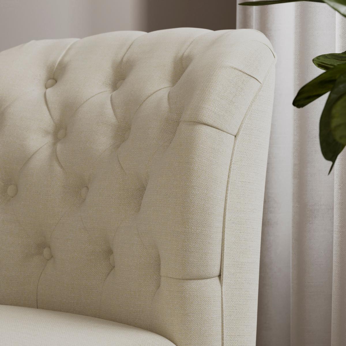 I love this armchair for its classic Chesterfield silhouette combined with its neutral, natural fabric, making it versatile and timeless. It works particularly well in traditional, vintage-inspired spaces but can also add a touch of refined elegance to modern interiors with minimal colour palettes. Practical styling tips include pairing it with textured cushions or a cosy throw to enhance its inviting feel, or placing it alongside a statement side table for a functional, stylish corner. Its neutral tone makes it an easy anchor piece, perfect for layering with other natural or earthy tones in your scheme.