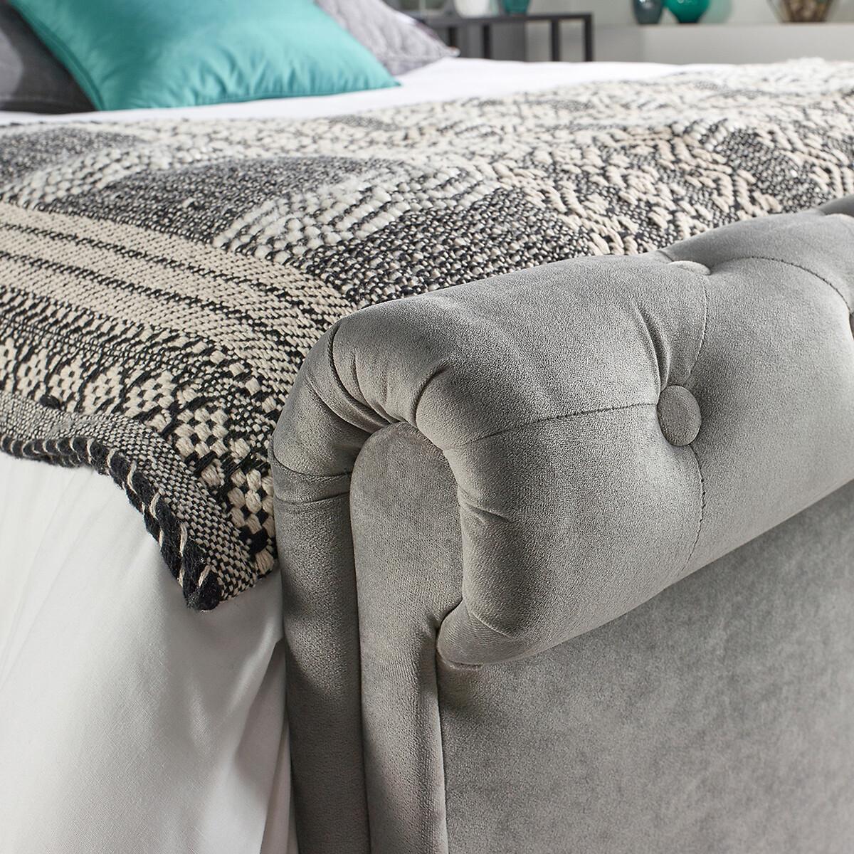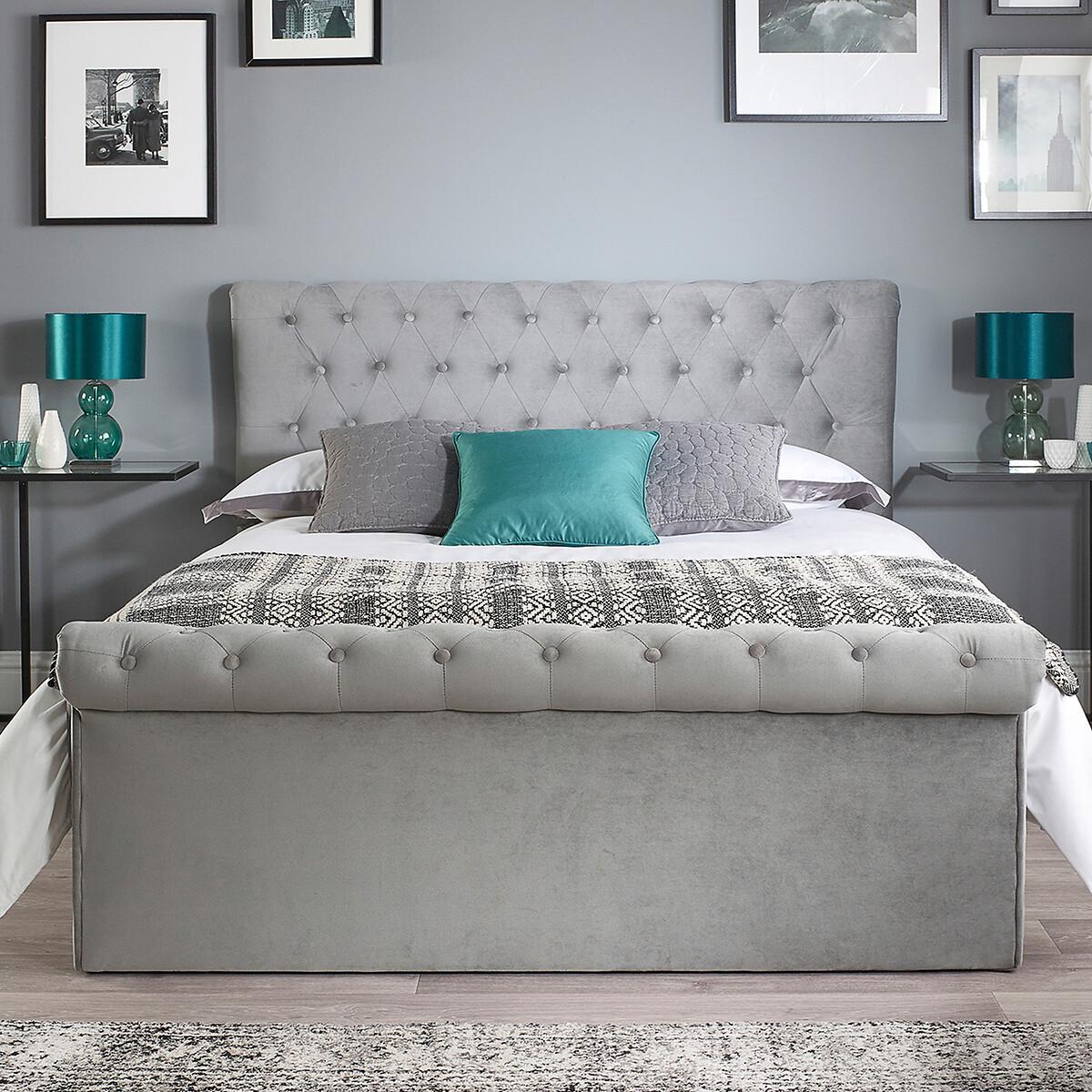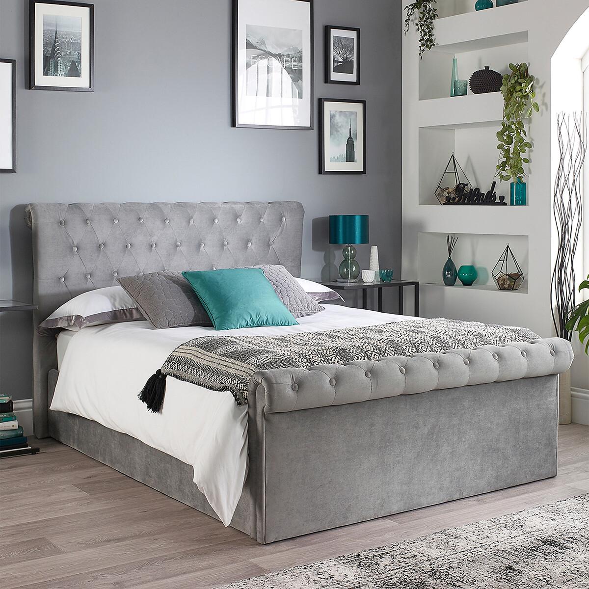 Please note: this product cannot be delivered to all Offshore Islands, Northern Ireland or Republic of Ireland. Scroll Top Grey Velvet Ottoman Storage Bed. This Grey Velvet Ottoman Storage Bed features a beautiful sleigh design complete with scroll tops on the footboard and headboard. The headboard is finished with foam padding perfect for sitting up in bed and reading. This design is finished with detailed stitching and buttons and is guaranteed to become the key focal point of any bedroom. The sprung slats offer a superior support and ventilation system. Quality sprung slats improve comfort and mattress lifespan. This side opening ottoman bed is perfect for rooms with no or little space. The easy lift ottoman mechanism is supported with quality gas pistons, enabling the storage to be accessed with minimal effort. Once the ottoman is elevated it will hold position, allowing hands free access to storage. The side opening ottoman mechanism can conveniently be set to open from either side of the bed. The bed is finished in soft touch grey velvet, the cooling colour of this velvet will suit most bedroom decors. Self Assembly Required. Please note the maximum Mattress weight for this bed is 65kg. Swatch service: We offer a FREE swatch service. Please email samples@aspire-furniture.co.uk and include the below information:Please include 'La Redoute' in the title of your email. Name and address:Product: Chesterfield Ottoman Bed Grey. Fabric: Velvet Product Dimensions:Single: 115cmx110cmx210cm. Small Double:110cmx145cmx210cmDouble:110cmx160cmx210cmKing:110cmx175cmx220cm Super King:110cmx205cmx220cm. Please remember to measure your available space before ordering. Single:Parcel 1 Packaged Dimensions 117cmx 110cmx 16cm Weight: 27.6kg Parcel 2 Packaged Dimensions 196cmx 33cmx 11cm Weight: 24.3kg. Small Double:Parcel 1 Packaged Dimensions 147cmx 110cmx 16cm Weight: 31.6kg Parcel 2 Packaged Dimensions 196cmx 33cmx 11cm Weight: 24.3kgDouble:. Parcel 1 Packaged Dimensions 162cmx 110cmx 16cm Weight: 34.9kg Parcel 2 Packaged Dimensions 196cmx 33cmx 11cm Weight: 24.3kgKing:. Parcel 1 Packaged Dimensions 177cmx 110cmx 16cm Weight: 37.8kg Parcel 2 Packaged Dimensions 206cmx 33cmx 11cm Weight: 24.3kg Super King:Parcel 1 Packaged Dimensions 207cmx 110cmx 16cm Weight: 40kg Parcel 2 Packaged Dimensions 206cmx 33cmx 11cm Weight: 25.5kg. Upholstered Fabric Composition:Velvet. This product will be dispatched by one of our trusted suppliers. You’ll be contacted by their selected courier about your delivery. Please note this item will be delivered to your doorstep. ASPIR01
