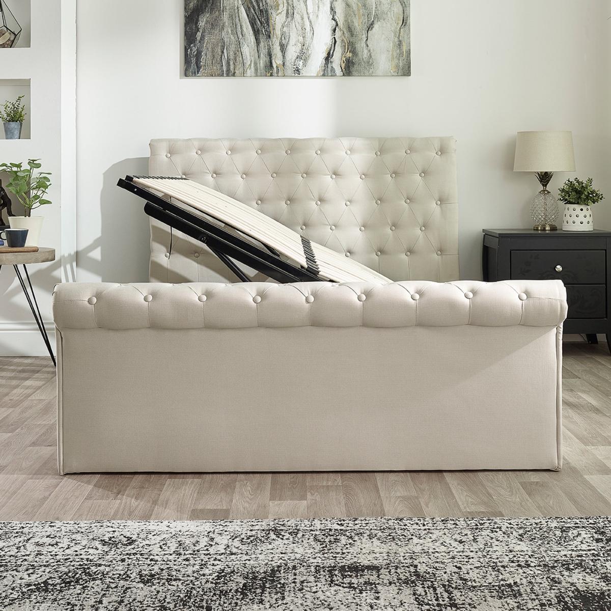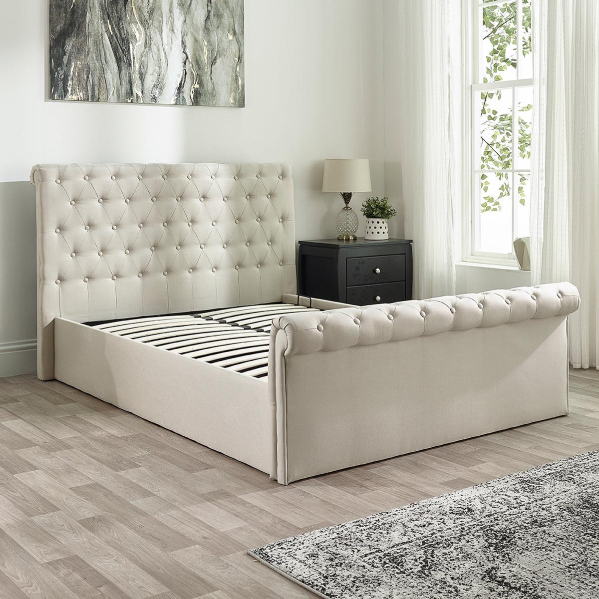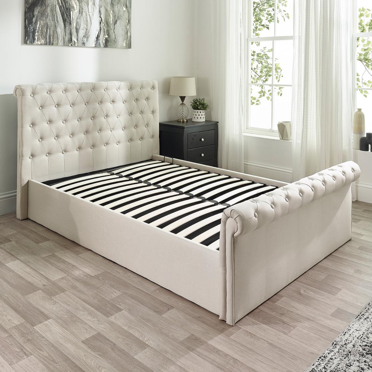 * Scroll top ottoman* Upholstered headboard* Sprung slatted base This bed frame is upholstered in a luxurious linen fabric, combining classic elegance with smart functionality. The scroll top design exudes timeless Chesterfield charm, making it a standout piece in any bedroom. The bed features a versatile side-lift ottoman mechanism that can be configured to open from either the left or right, providing easy access to a spacious under-bed storage area.