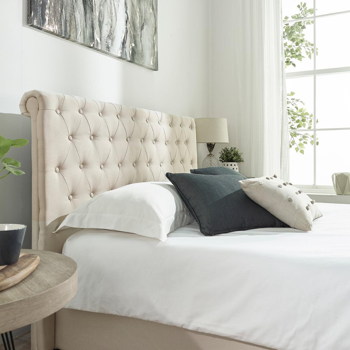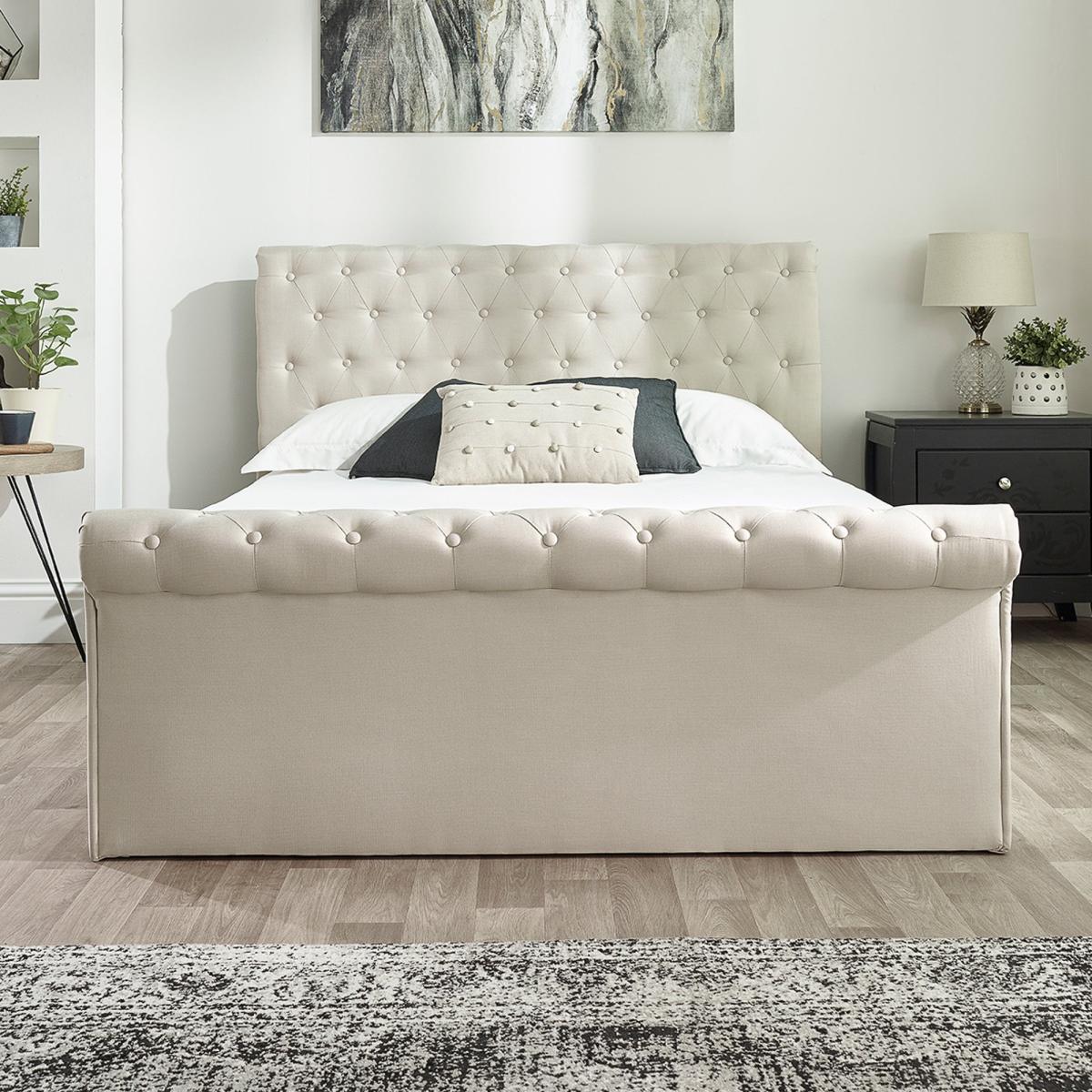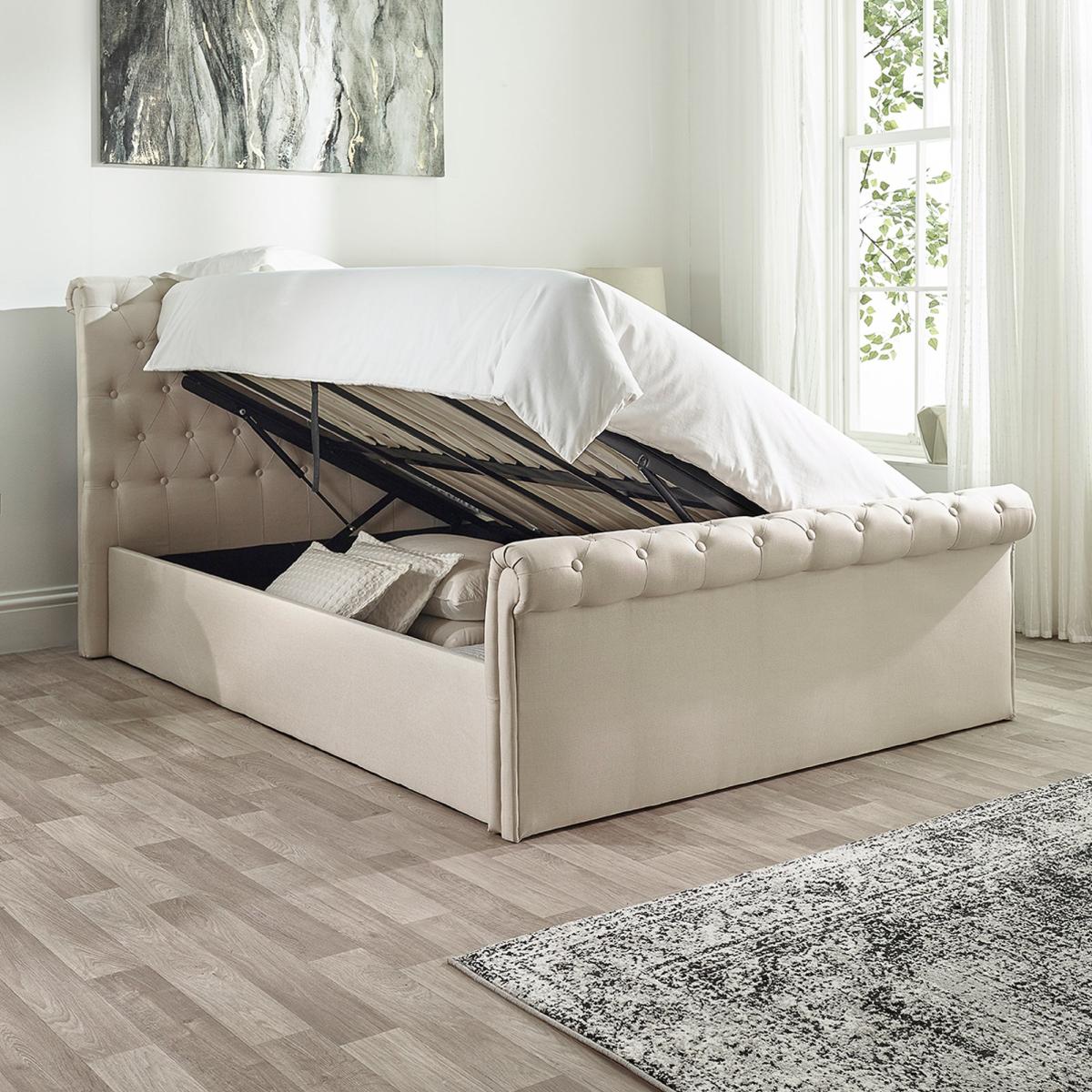 * Scroll top ottoman* Upholstered headboard* Sprung slatted base This bed frame is upholstered in a luxurious linen fabric, combining classic elegance with smart functionality. The scroll top design exudes timeless Chesterfield charm, making it a standout piece in any bedroom. The bed features a versatile side-lift ottoman mechanism that can be configured to open from either the left or right, providing easy access to a spacious under-bed storage area.