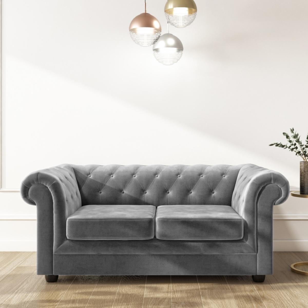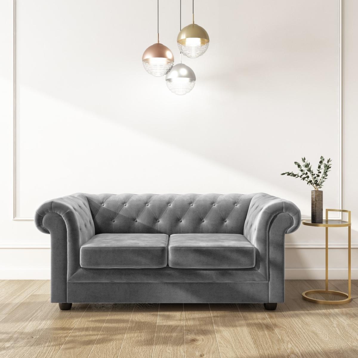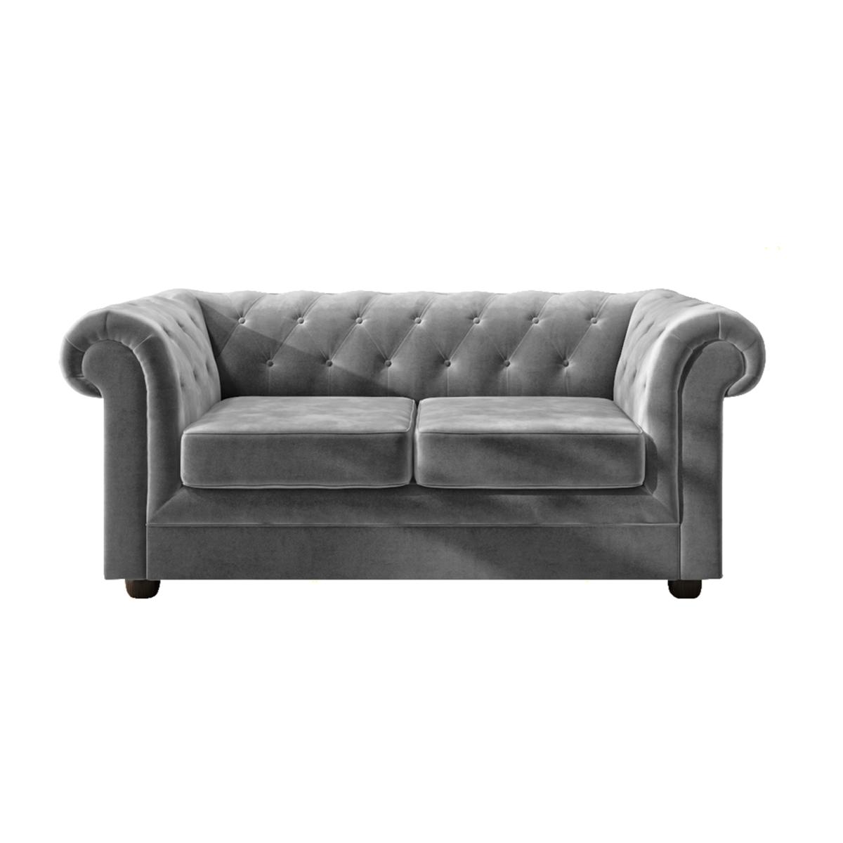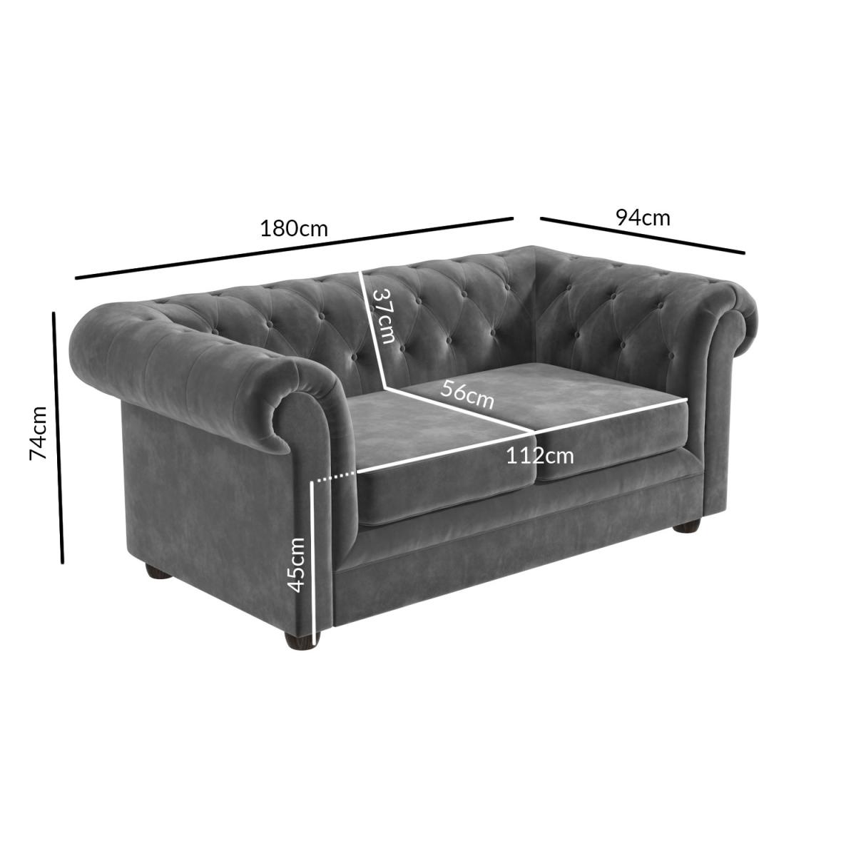 Features we love A modern twist on the chesterfield design adds a classic touch to your living space. Beautifully upholstered in a grey velvet fabric Discover supreme comfort with this gorgeous foam-filled sofa Grey velvet finish co-ordinates well with any décor with its subtle tone Luxurious detailing with scrolled arms stud buttoning and impeccable tailoring. Polished natural wood turned feet contrast beautifully giving it the perfect finish All about me Discover maximum comfort and minimum maintenance with this gorgeous foam-filled sofa. Add a touch of class to a modern home or update a traditional space with this Bronte two-seater sofa. Beautifully upholstered in a grey velvet finish it'll easily co-ordinate with other furnishings thanks to its subtle tone. With classic chesterfield features such as the soft ruched scrolled arms button-backed detailing and turned wooden feet it's guaranteed to make an immediate impact. There's minimum assembly; it's just a case of fixing the feet into position and it's ready to use. Need to know. Overall dimensions. H74 x W180 x D94 cm Seating dimensions. W112 x D56 cm Packed dimensions. No. of Boxes 1 - Weight 48kg – H70 x W183 x D96 cm Colour. Grey Finish. Grey velvet upholstery and wooden legs Filling. Foam.