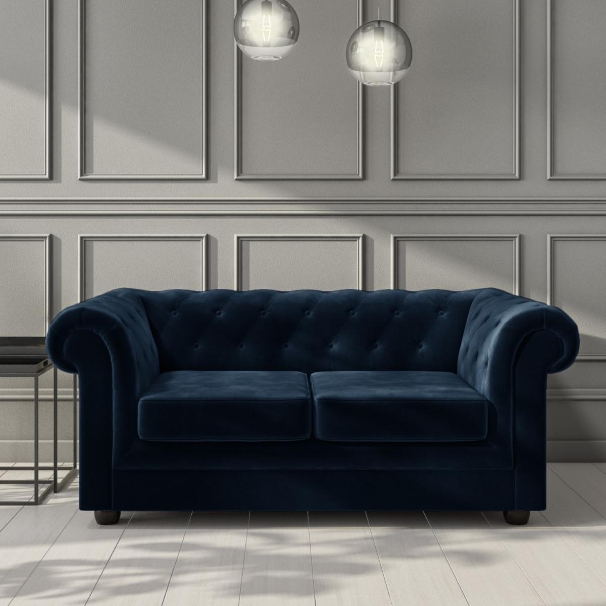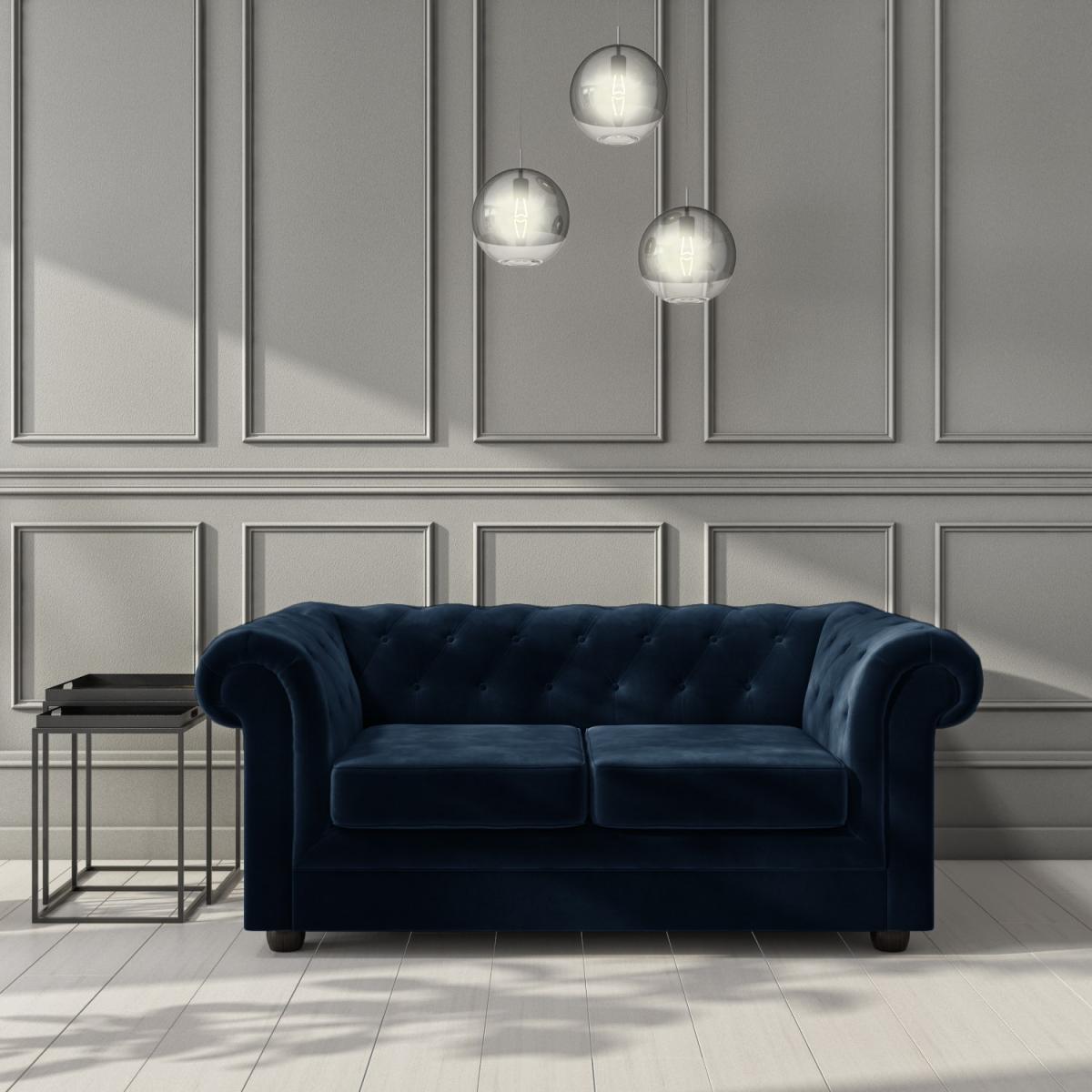 Discover maximum comfort and minimum maintenance with this gorgeous, foam-filled sofa. Add a touch of class to a modern home or update a traditional space with this Bronte two-seater sofa. Beautifully upholstered in a navy velvet finish, it'll easily co-ordinate with other furnishings thanks to its subtle tone. With classic chesterfield features such as the soft ruched scrolled arms, button-backed detailing and turned wooden feet, it's guaranteed to make an immediate impact. There's minimum assembly; it's just a case of fixing the feet into position, and it's ready to use.