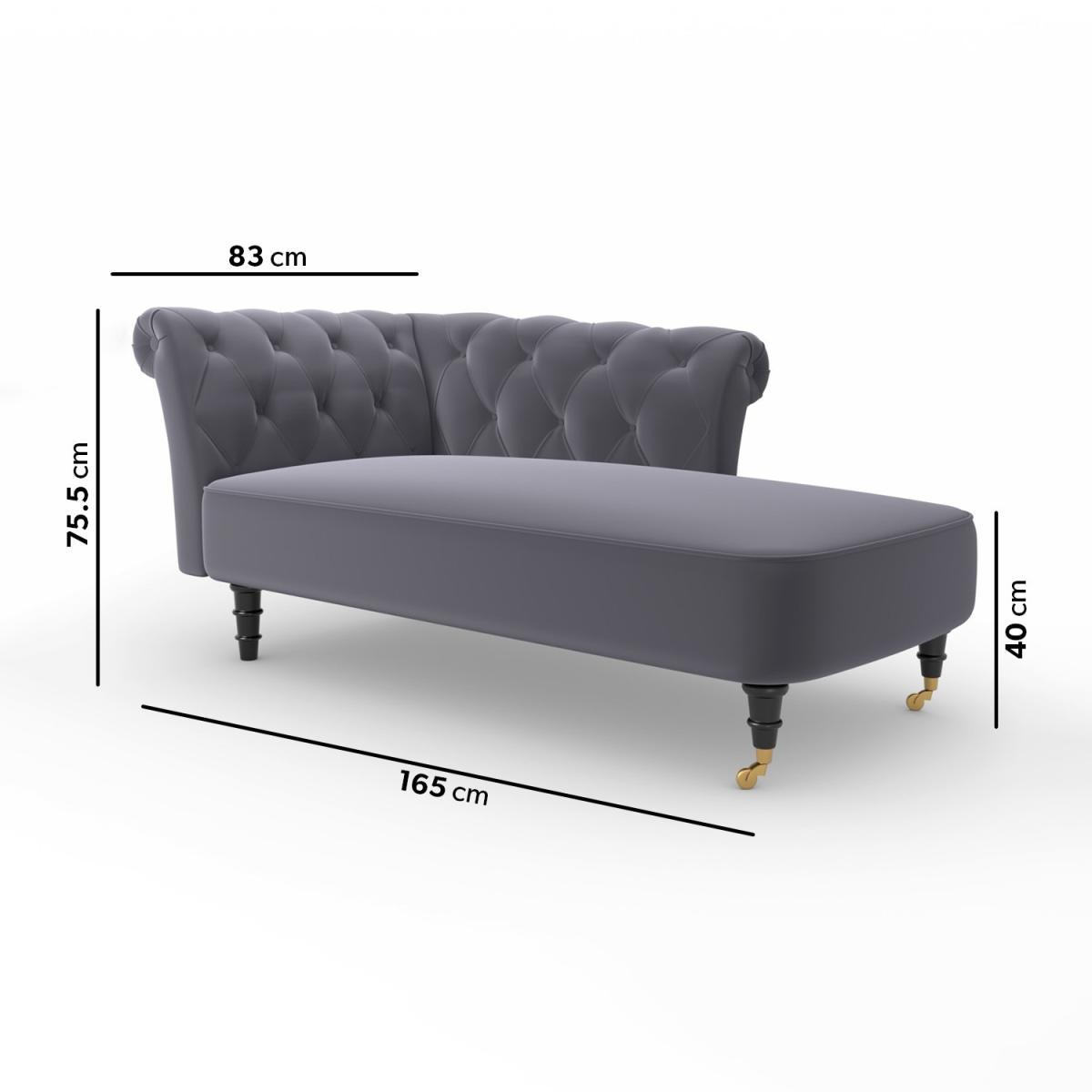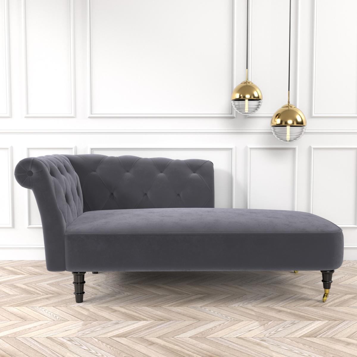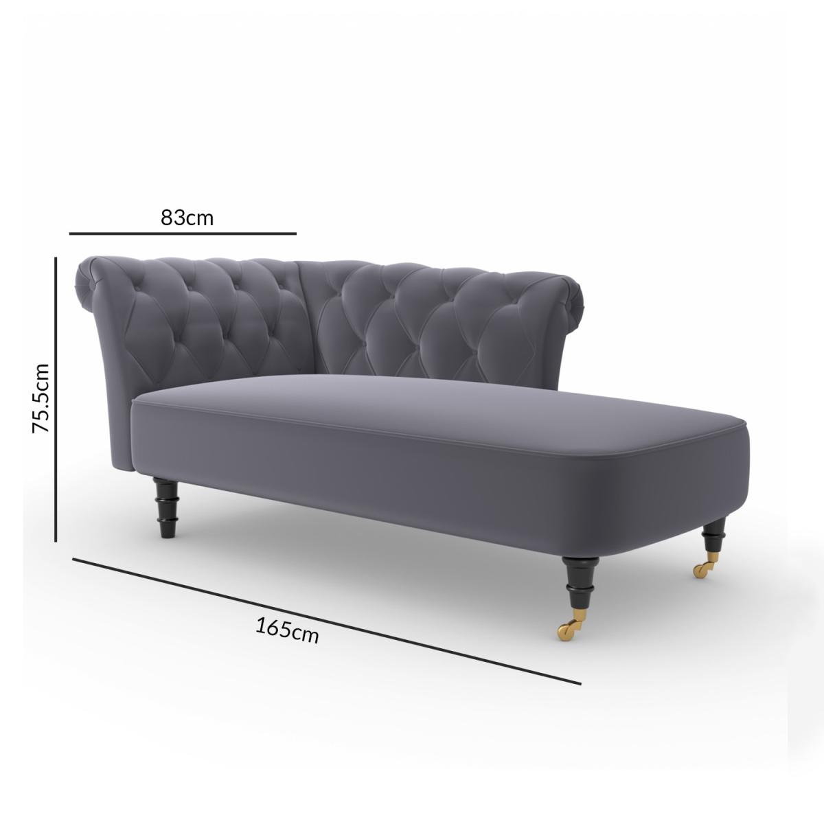 Features we love Upholstered in luxurious soft dark-grey velvet A classic Chesterfield design with a contemporary twist. Featuring button detailing and roll-top back Perfect for relaxing with a comfy springboard base A fabulous statement piece for any bedroom décor Black legs with gold front castors for easy placement. Need to know. Dimensions. H75.5 x W165 x D83 cm Weight. 24.8kg Colour. Dark grey Finish. Velvet Position. Right-hand facing Frame material. Solid wood plywood metal tube Upholstery material. Velvet Seat Filling. Sponge Base. Springboard Assembly required. Yes..