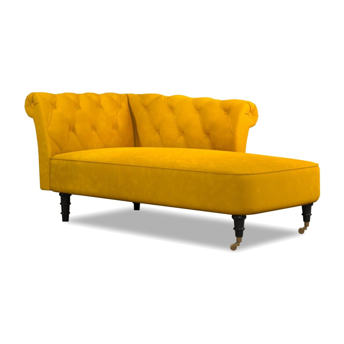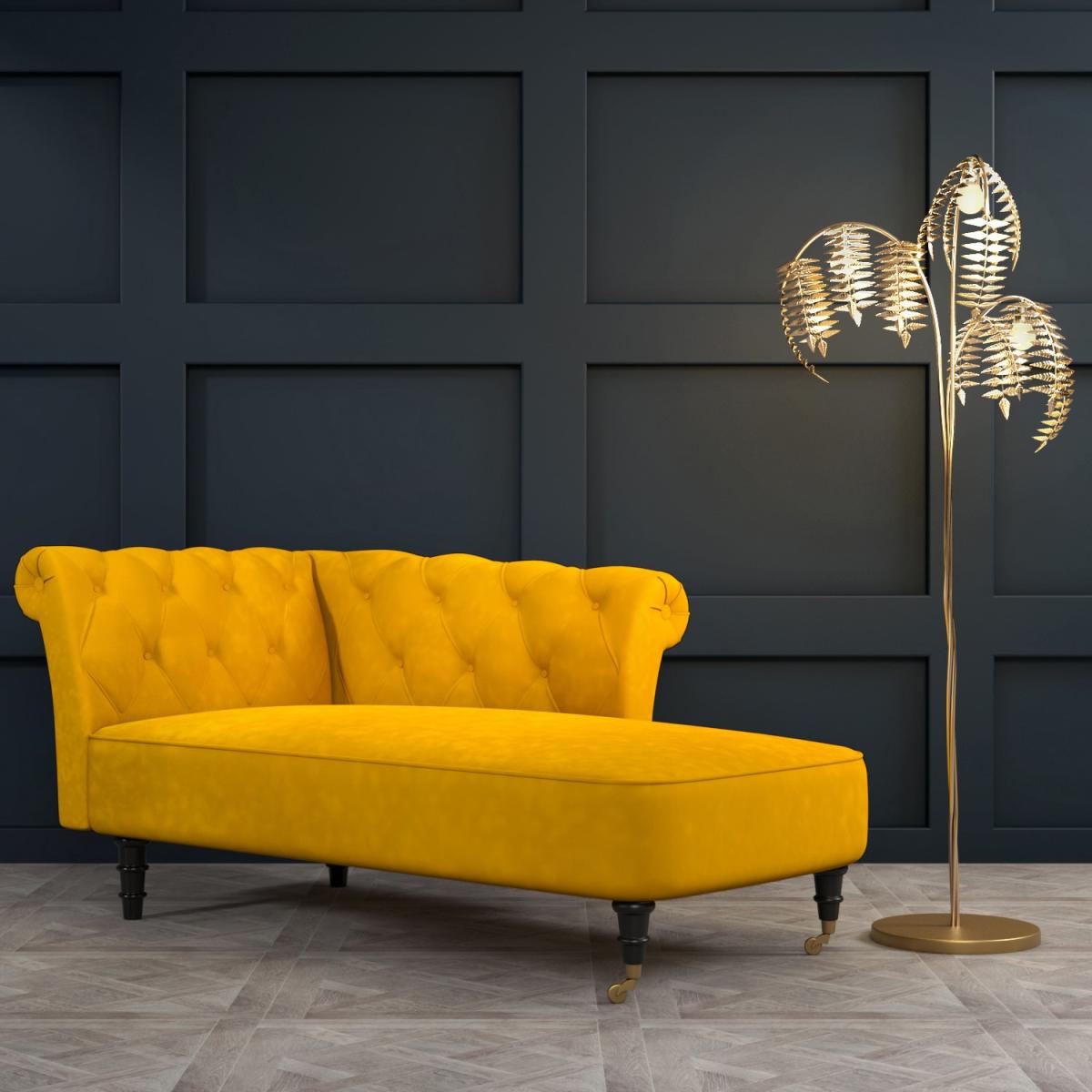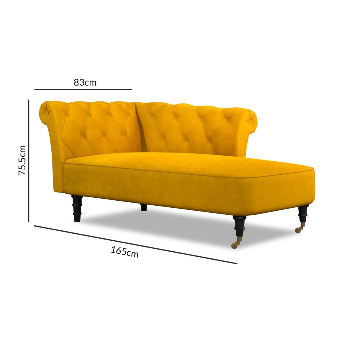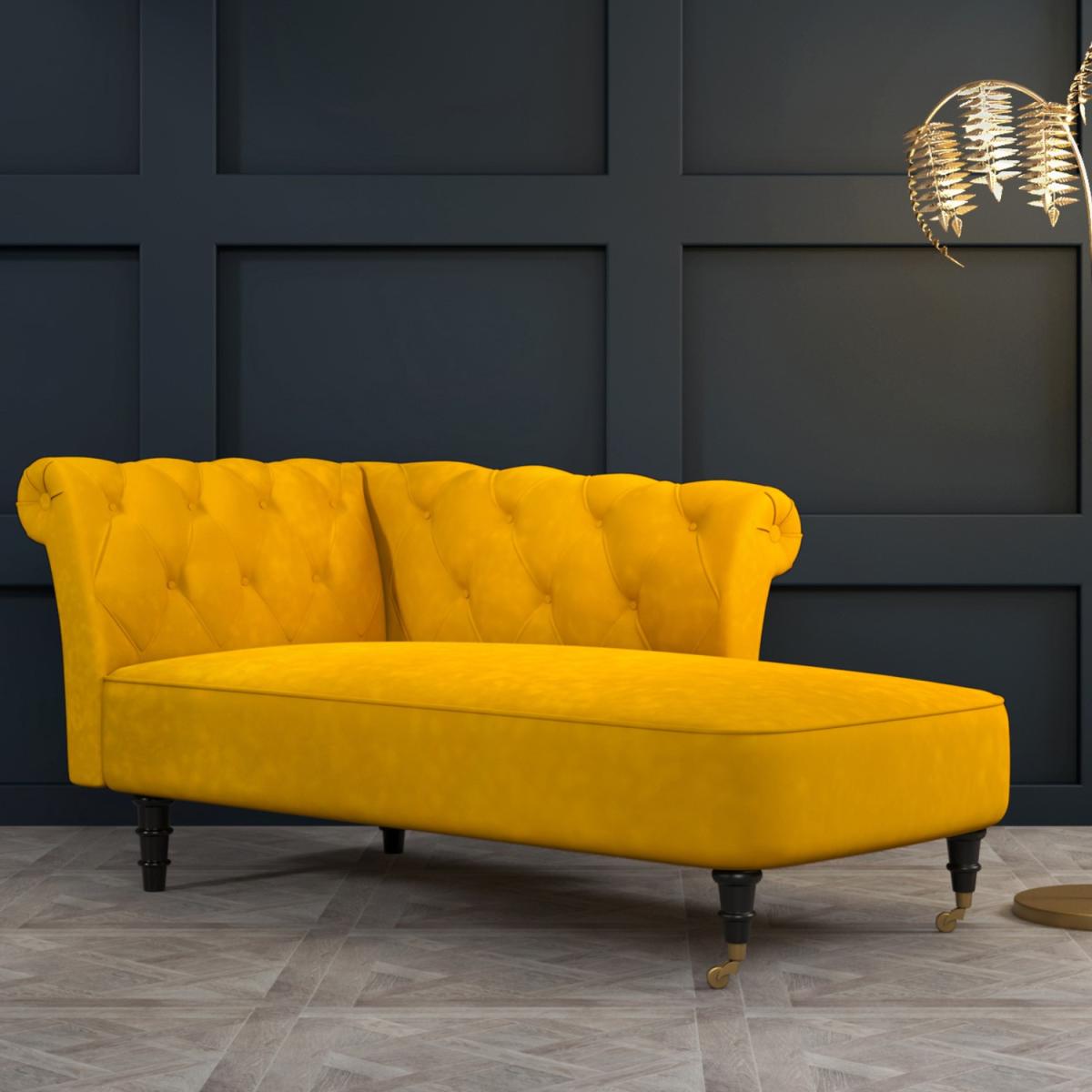 Upholstered in luxurious,mustard yellowvelvet A classic Chesterfield design with a contemporary twist Featuring button detailing and roll-top back Perfect for relaxing with a comfy springboard base A fabulous statement piece for any bedroom décor Black legs with gold front castors for easy placement Need to know Weight: 24.8kg Colour: Mustard yellow Finish: Velvet Position: Right-hand facing Frame material: Solid wood, plywood, metal tube Upholstery material: Velvet Seat Filling: Sponge Base: Springboard Assembly required: Yes