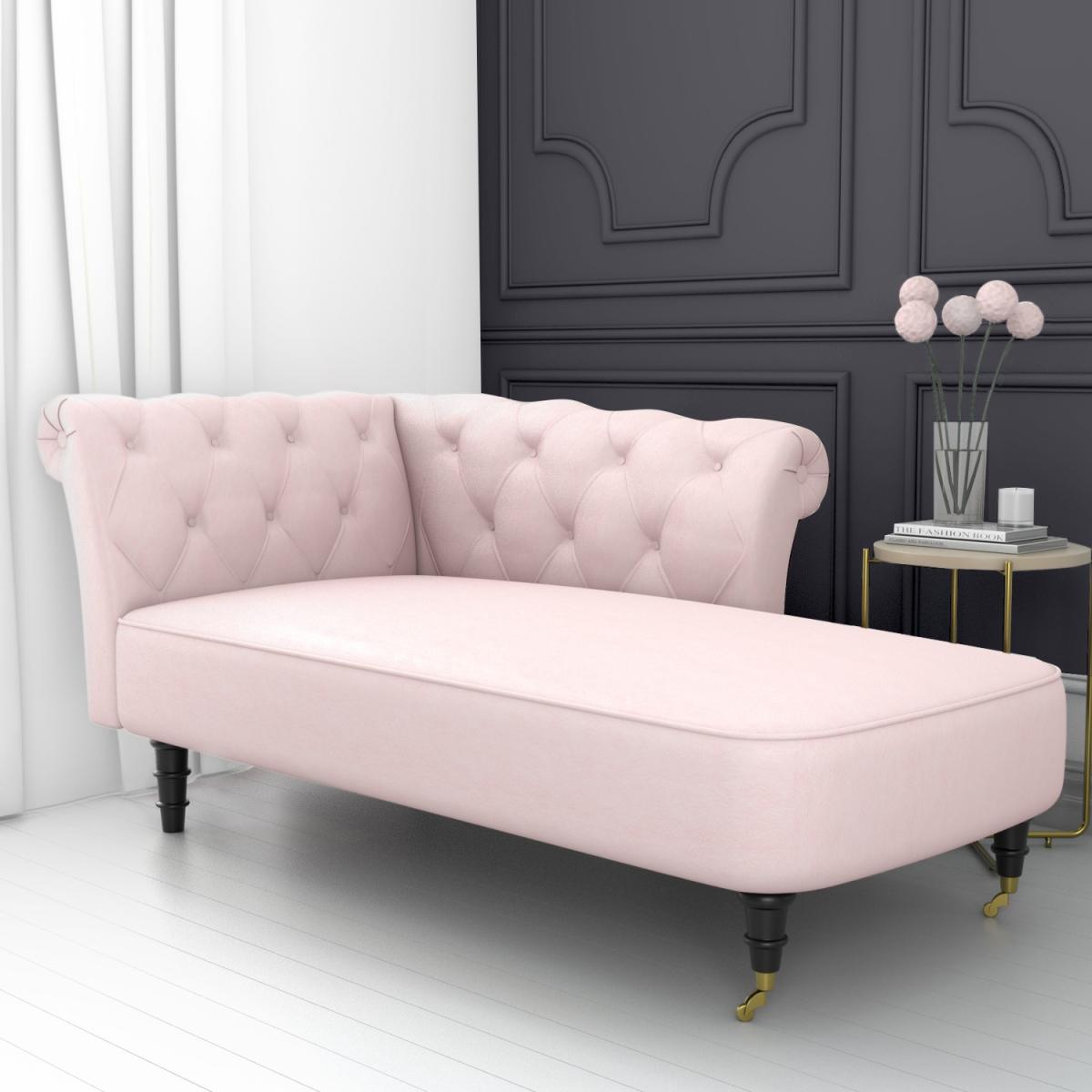 Features we love A classic Chesterfield design with a contemporary twist this chaise longue delivers style to any home. Upholstered in luxurious soft baby pink velvet this piece encourages relaxation. Button detailing and a roll-top back and armrest produce a classic look. Its sumptuous seat and springboard base deliver optimum comfort ideal for an afternoon nap. Contrasting black legs and gold front wheels add to this piece’s unique appearance Need to know. Dimensions. W 165 x H 75.5 x D 83cm Colour. Baby pink Position. Right-hand facing Material. Fabric wood metal tube sponge Finish. Velvet Base. Springboard Filling. Sponge Assembly required. Yes.