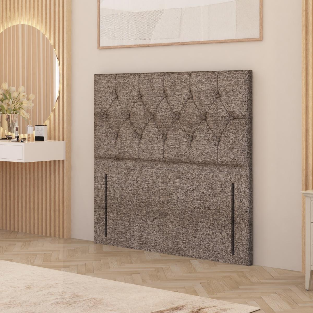 The Chesterfield Tweed Fabric Floor Standing Headboard is the definition of refined luxury and contemporary craftsmanship. Upholstered in premium Tweed Fabric, it features an intricate deep-padded chesterfield design with hand tufted button detailing for a sophisticated, tailored finish. At 54 tall, this floor standing headboard creates a striking focal point, offering both visual grandeur and superior back support for reading or relaxing in bed. Expertly handcrafted in the UK, the Chesterfield combines durability with elegance, perfectly complementing both modern and classic interiors. Designed to pair seamlessly with all standard UK divan bases. Headboard height from the floor is 54" 137cm, the front panel of the headboard is 32" 81cm. This headboard can be fitted into your existing base with screws or simply placed behind your bed and against the wall.