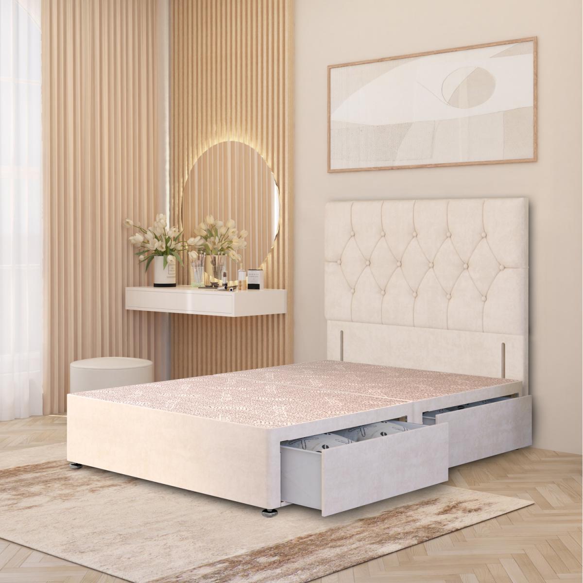 The Chesterfield Divan Bed Base with Floor Standing Upholstered Headboard combines luxury design with durable support. Its solid platform top base offers a firm, stable surface for your mattress, delivering better orthopaedic support compared to slatted frames. Expertly crafted in the UK from quality timber and upholstered in plush velvet fabric, it adds a refined touch to both classic and modern bedrooms. The matching upholstered 54"/137cm Chesterfield headboard features deep cushioned panels with hand-tufted fabric button detailing, creating a statement piece that is perfect for sitting up in bed. Headboard front panel with the design is 32"/86cm in height. The base measures 34.5cm in height with gliders attached (30.5cm without) and is available in all standard UK sizes 2FT. 6 Small Single, 3FT Single, 4FT Small Double, 4FT. 6 Double, 5FT King, and 6FT Super King. Choose from practical storage options including No Drawers, 2 Drawers (same side), or 4 Drawers, making this velvet divan bed with headboard both stylish and functional. An excellent space saving storage bed. Drawers can be placed left or right side as the headboard fits either end of the base.