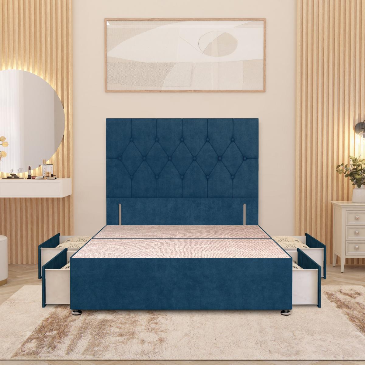 The Chesterfield Divan Bed Base with Floor Standing Upholstered Headboard combines luxury design with durable support. Its solid platform top base offers a firm, stable surface for your mattress, delivering better orthopaedic support compared to slatted frames. Expertly crafted in the UK from quality timber and upholstered in plush velvet fabric, it adds a refined touch to both classic and modern bedrooms. The matching upholstered 54"/137cm Chesterfield headboard features deep cushioned panels with hand-tufted fabric button detailing, creating a statement piece that is perfect for sitting up in bed. Headboard front panel with the design is 32"/86cm in height. The base measures 34.5cm in height with gliders attached (30.5cm without) and is available in all standard UK sizes 2FT. 6 Small Single, 3FT Single, 4FT Small Double, 4FT. 6 Double, 5FT King, and 6FT Super King. Choose from practical storage options including No Drawers, 2 Drawers (same side), or 4 Drawers, making this velvet divan bed with headboard both stylish and functional. Maximum storage capacity with 4 drawers, 2 on each side make this a great storage bed option.