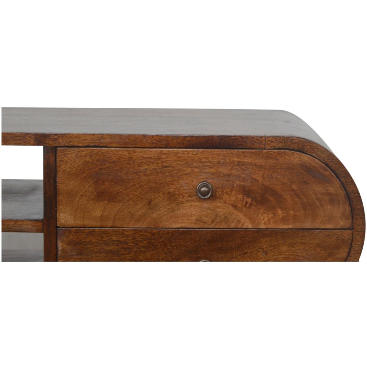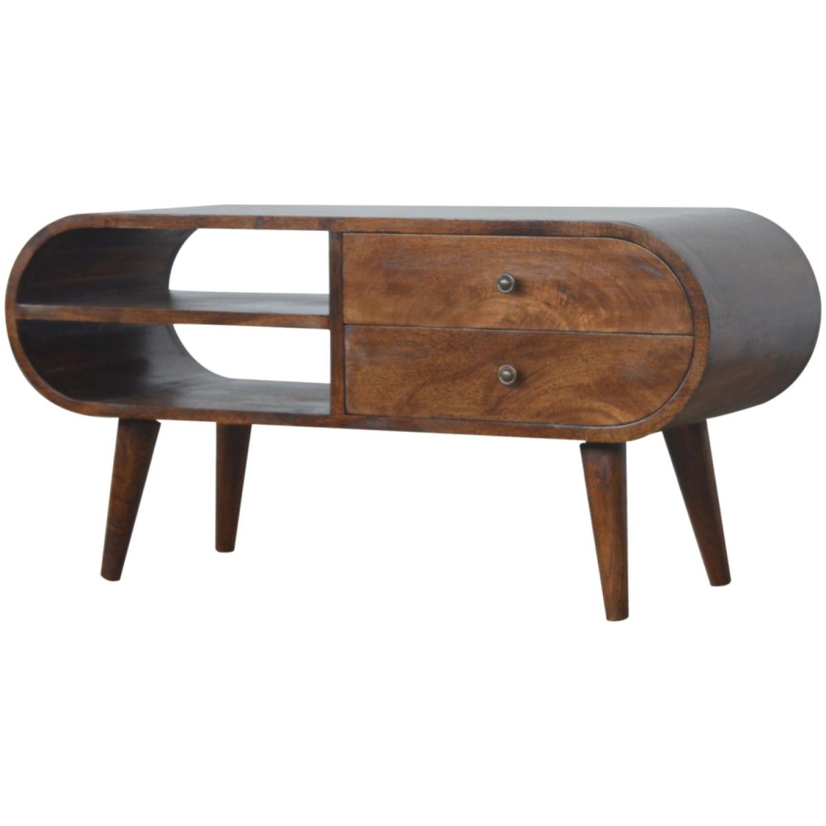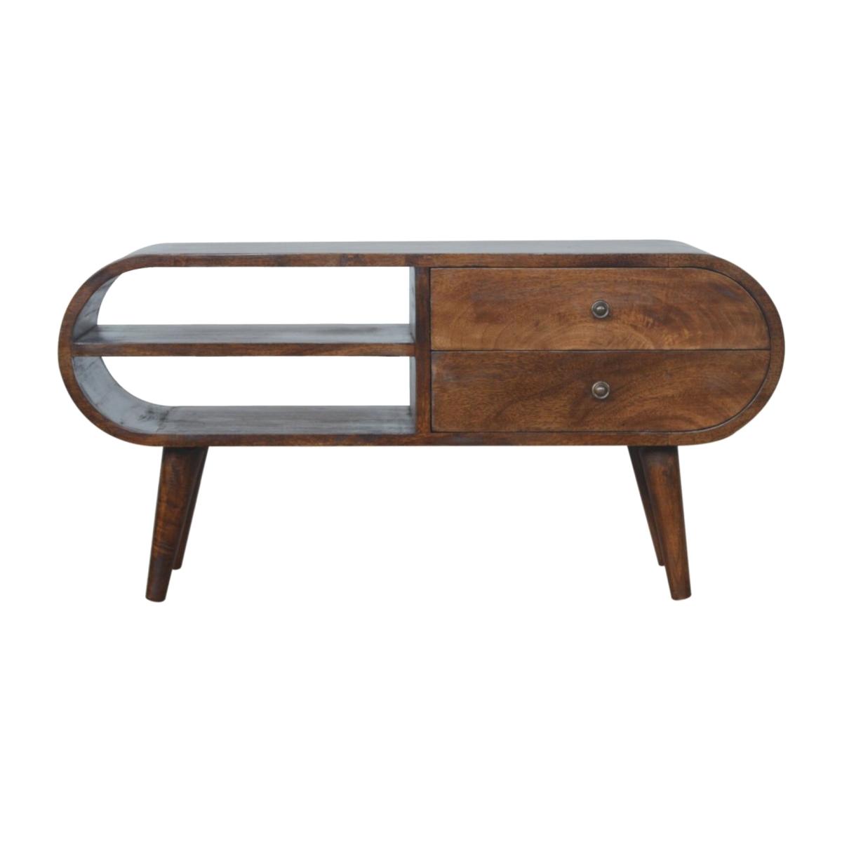 This Solid wood media unit has been constructed from 100%Solid mango wood in a chestnut finish and offers a unique shaped design with rounded edges. It features four drawers which have shiny knobs and Nordic-style legs. A great, simple addition to the living room.
